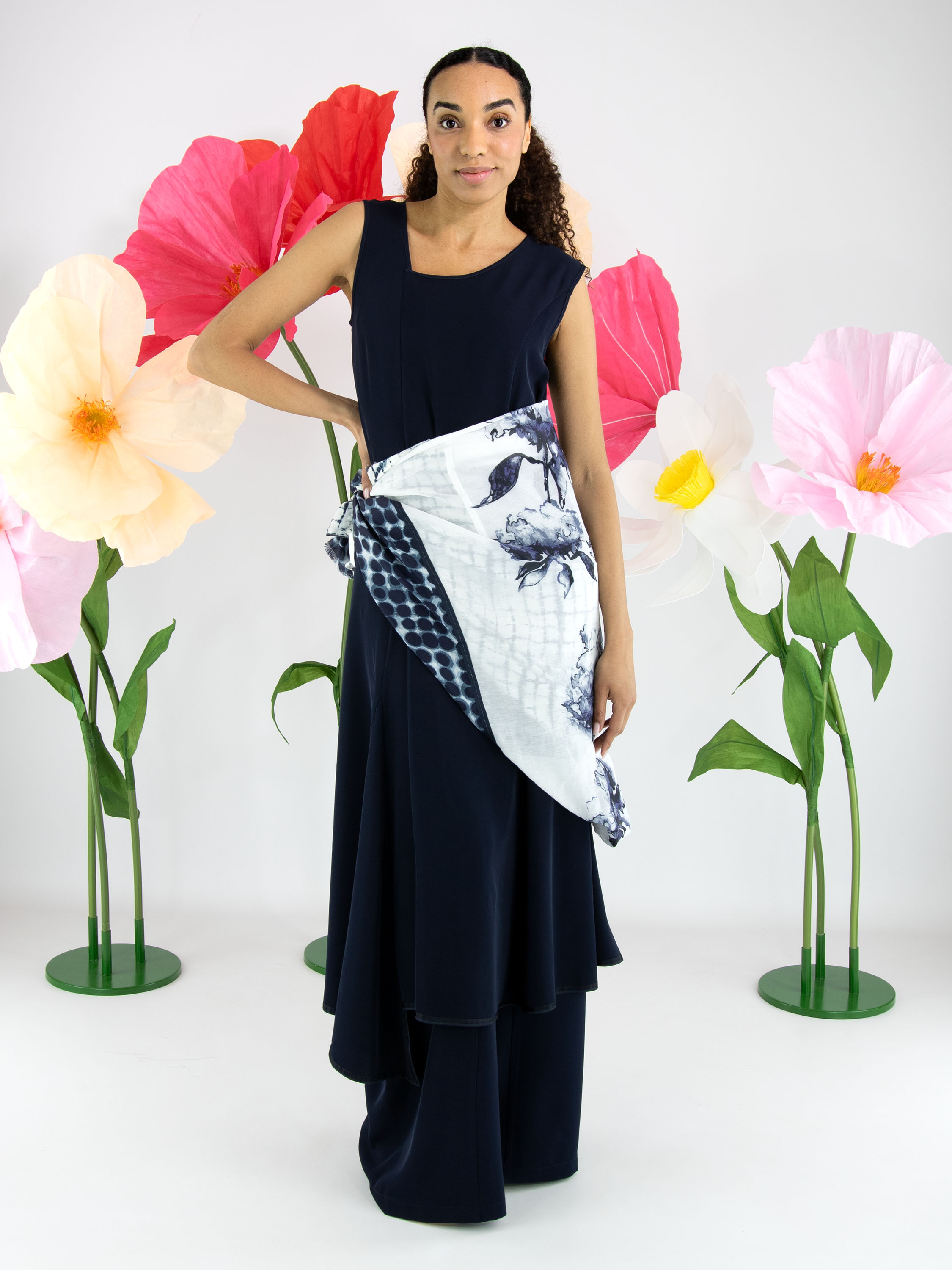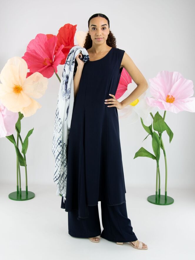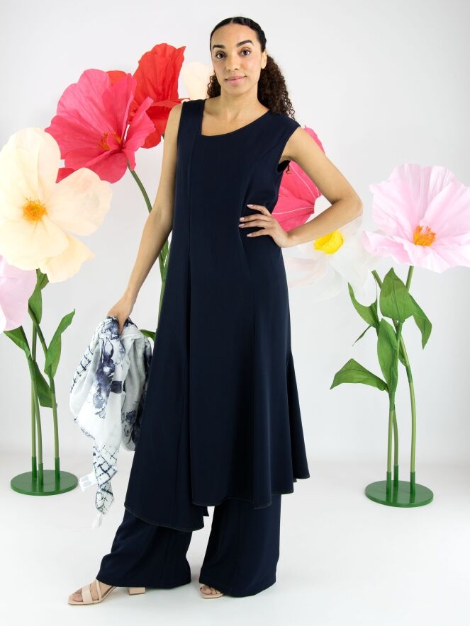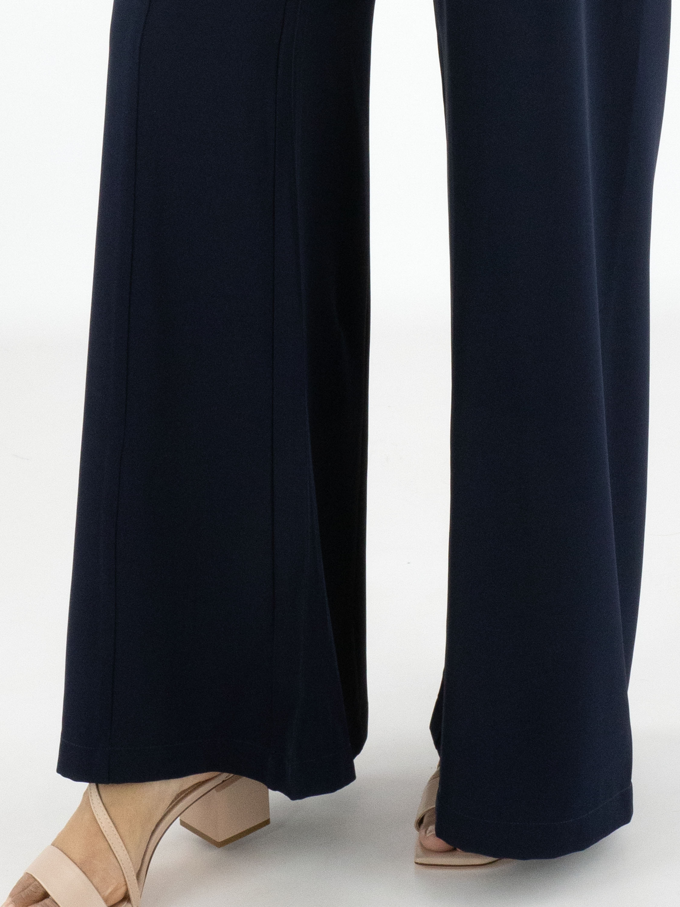 Pantalon large de High dans une élégante teinte bleu marine. À l’avant, juste sous la taille, deux poches décoratives apportent un détail distinctif au modèle. Une couture centrale parcourt toute la longueur de l’avant des jambes, créant une silhouette moderne et élancée. Ce pantalon ne doit pas être lavé.