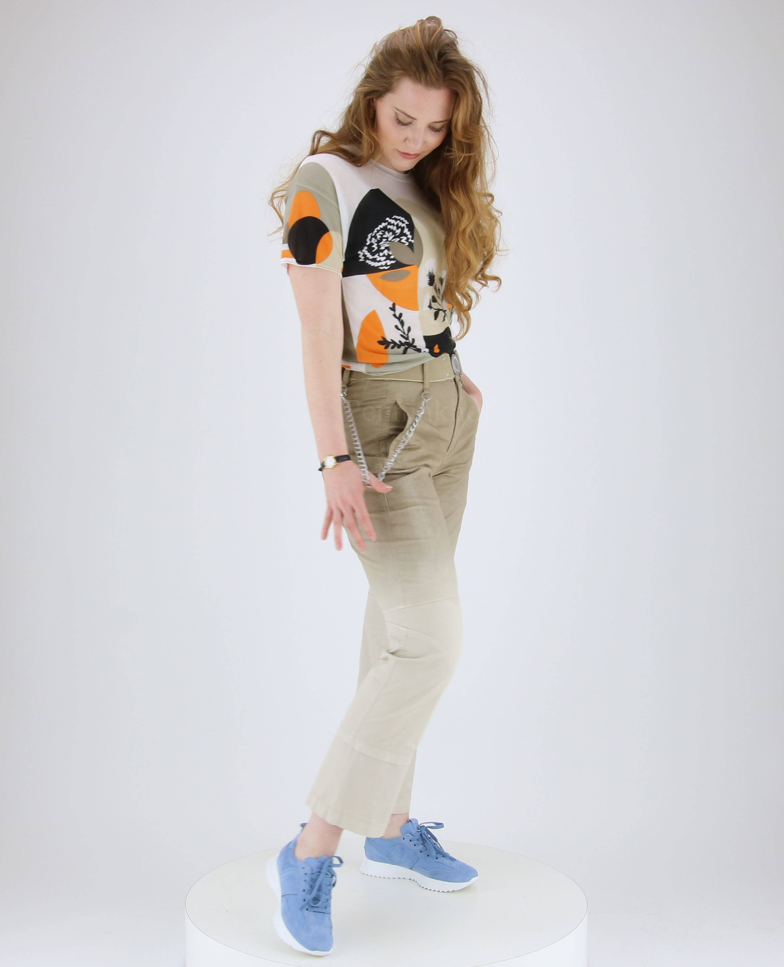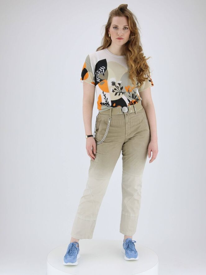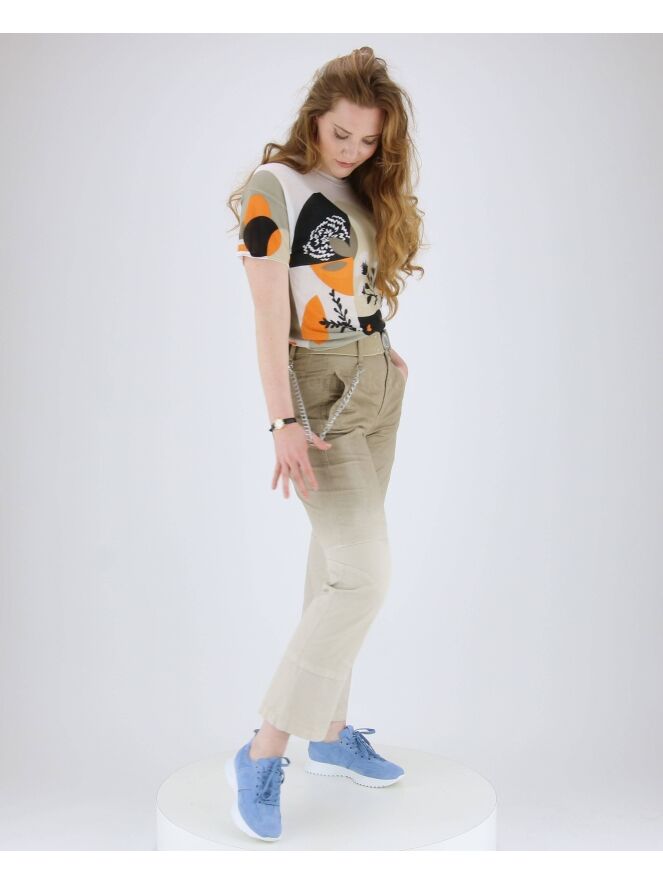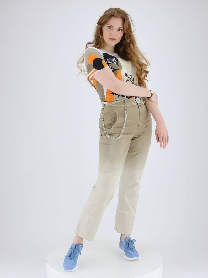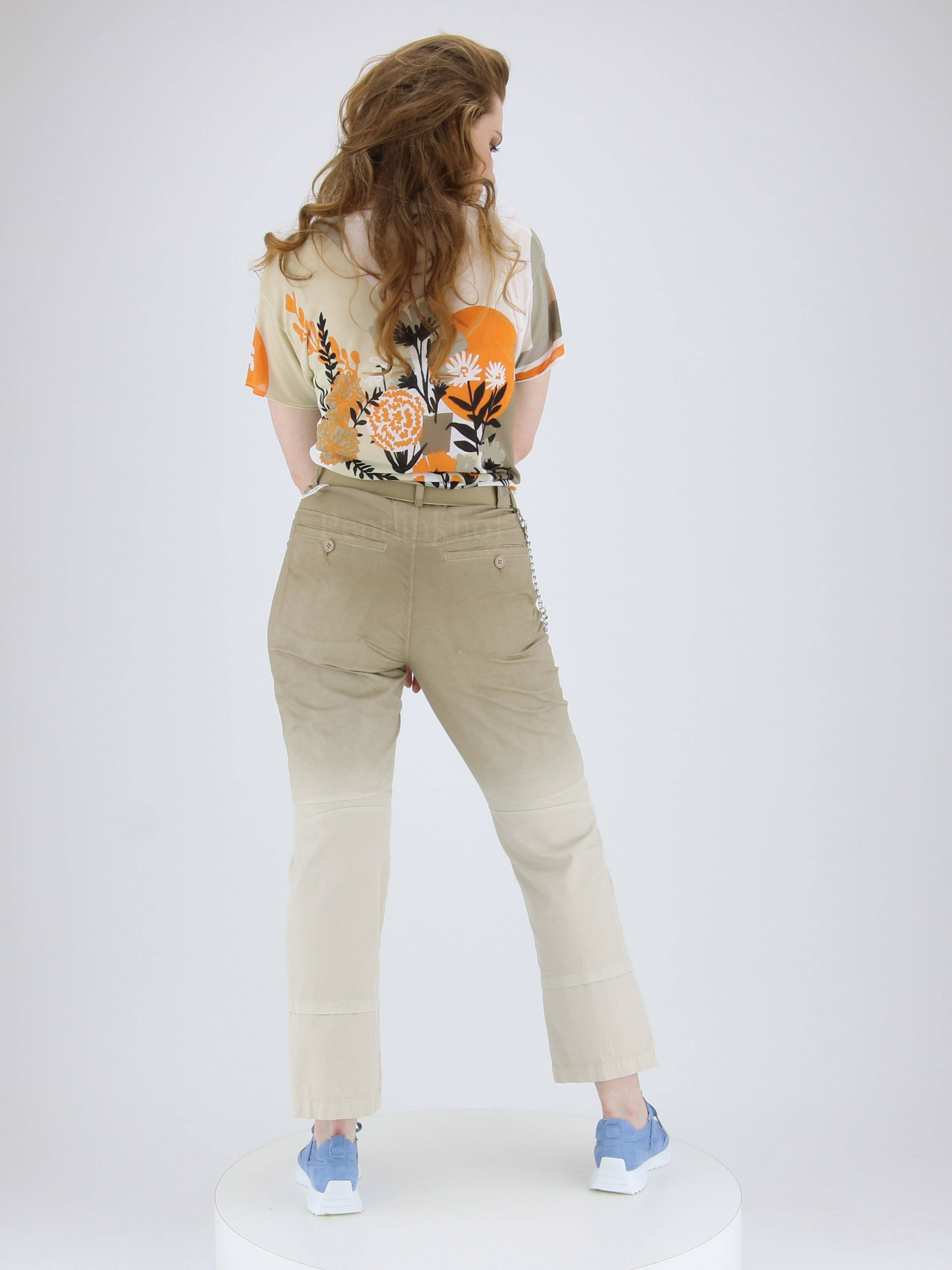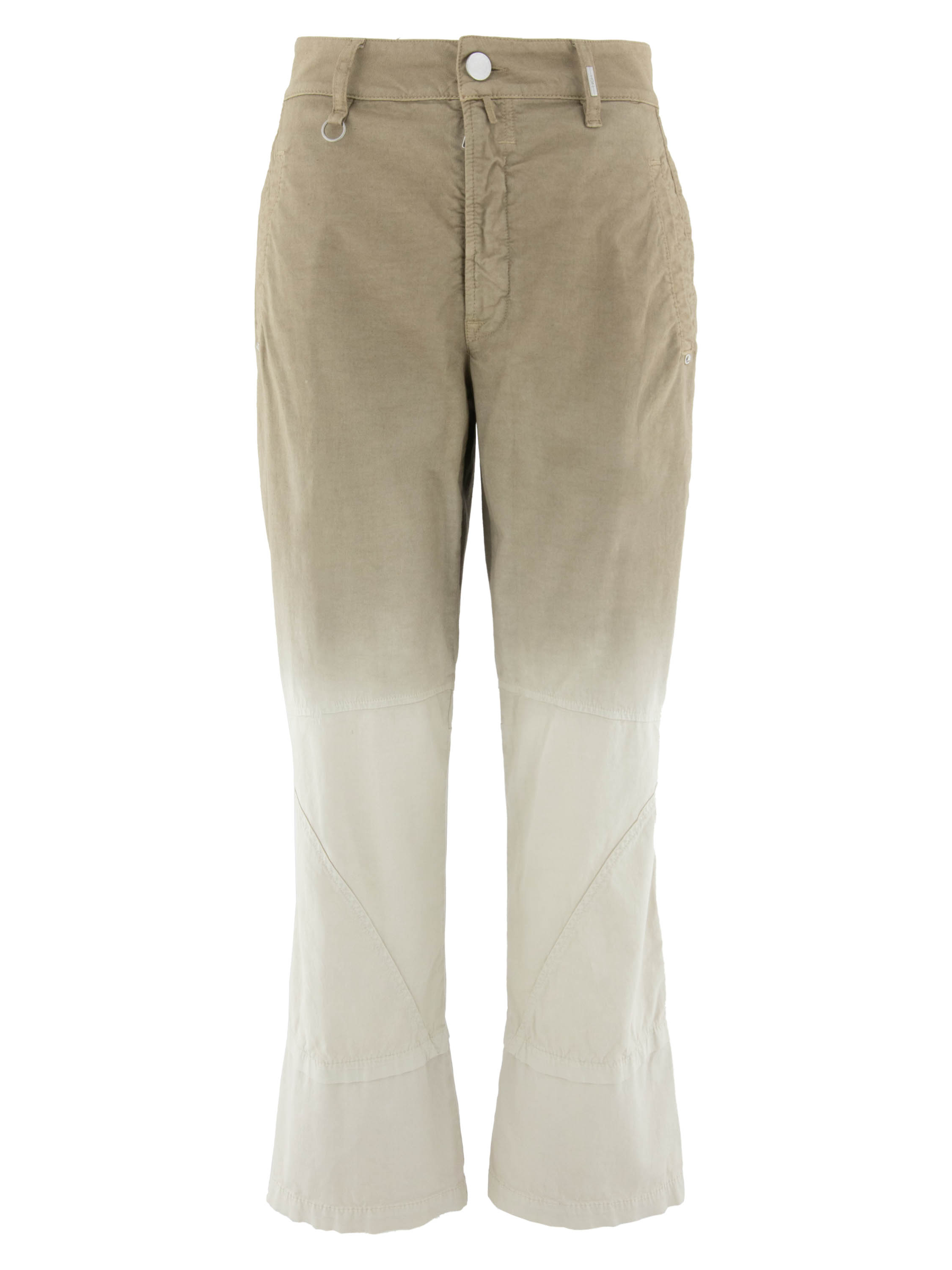Pantalon de la marque High, imprimé d'un dégradé allant d'une couleur taupe vers une couleur sable. La taille est équipée d'une ceinture élastique fermé par une boucle ronde en métal mat et de poches latérales. Une chaîne de couleur argentée orne le côté droit. Le bas de la jambe est orné de plusieurs coutures. Lavage à 30 degrés.