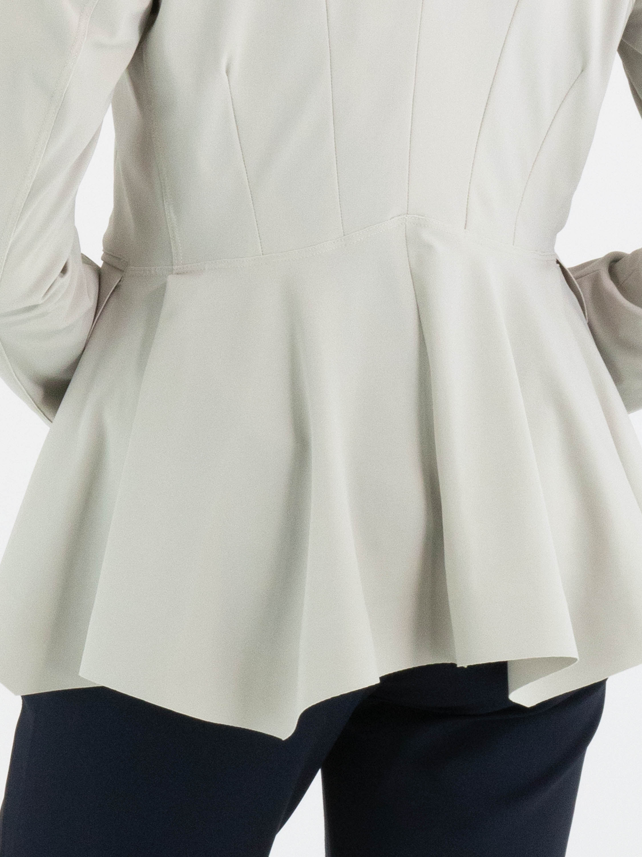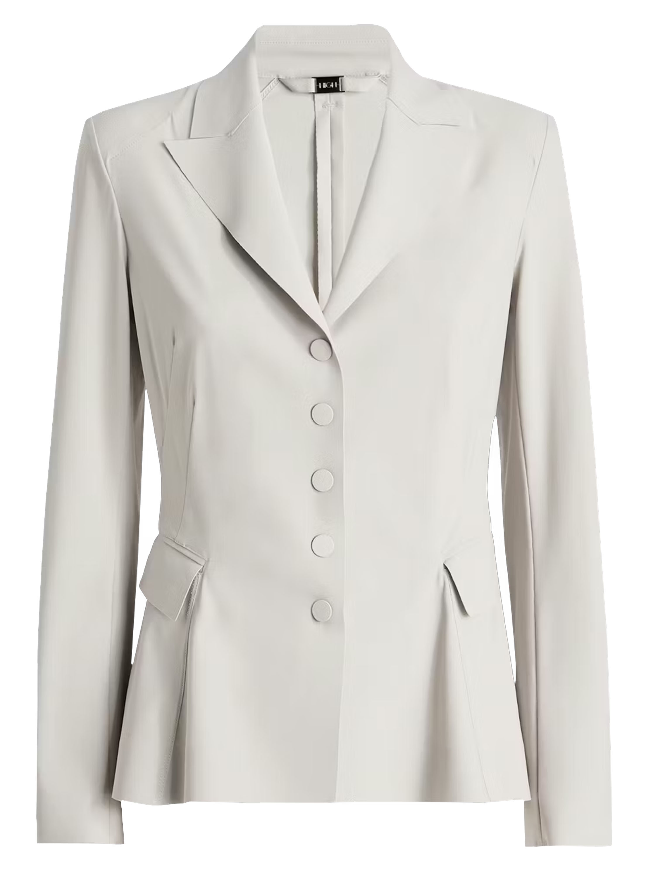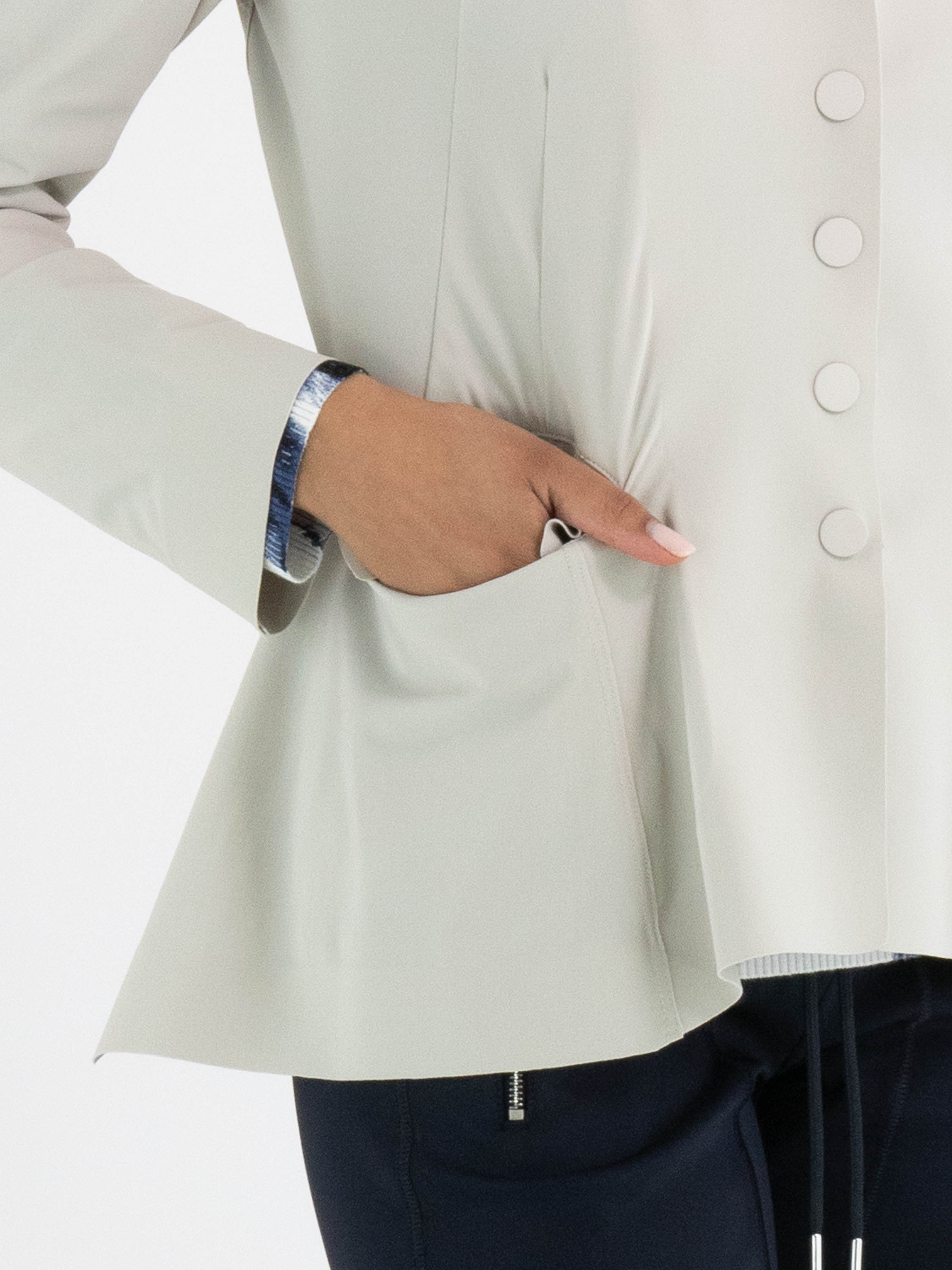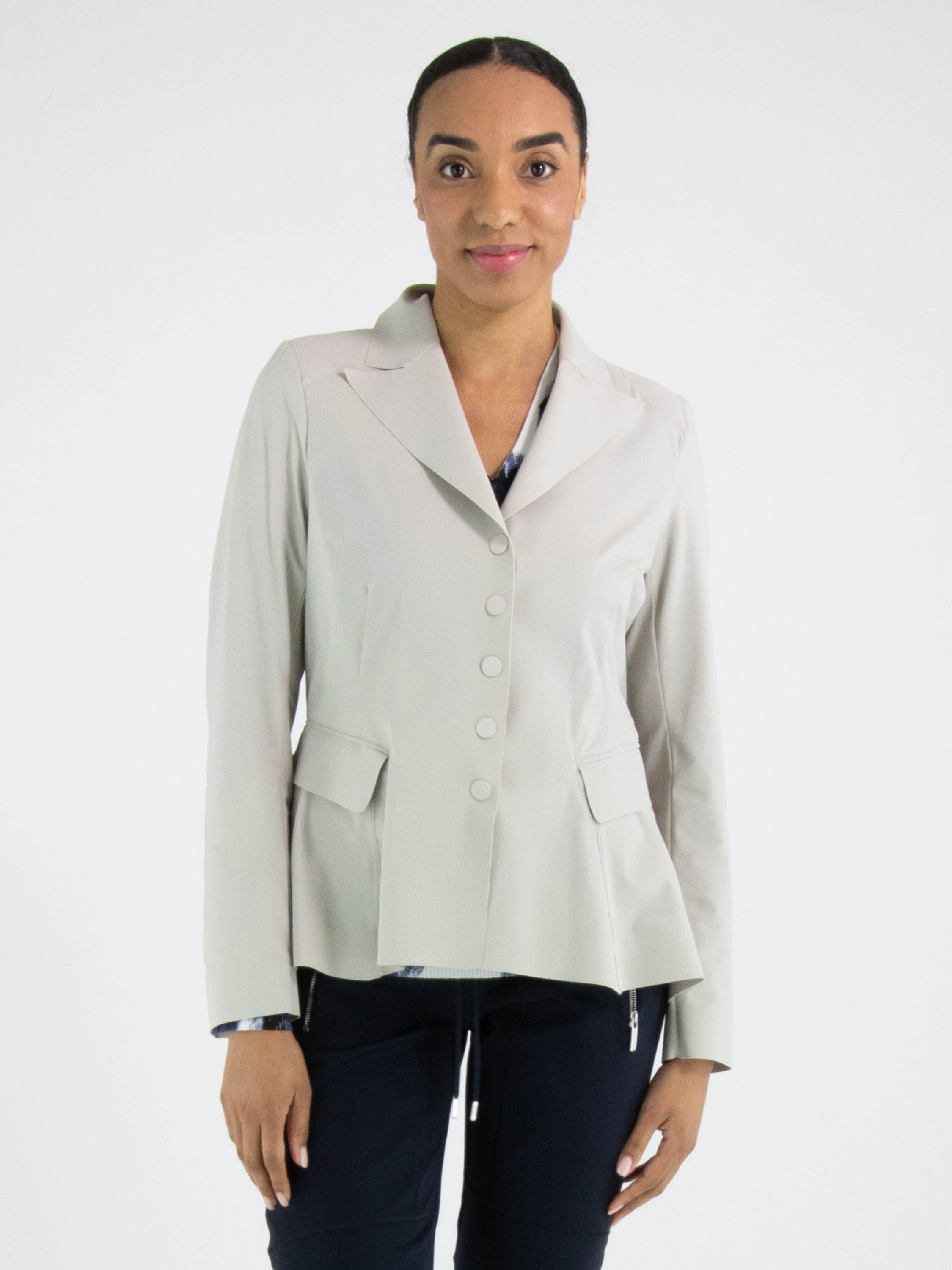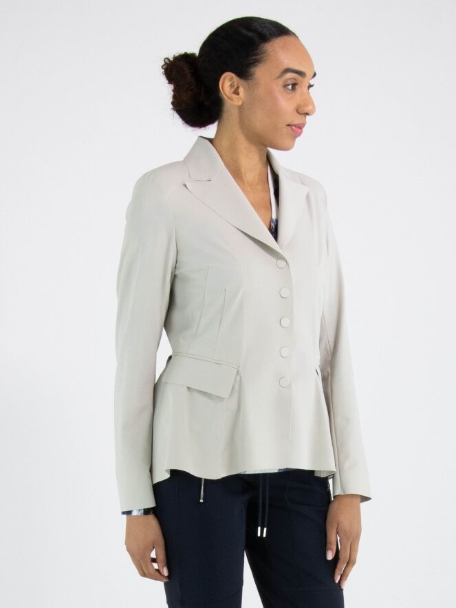 Un blazer de High Tech en couleur kit. Le blazer se ferme par cinq boutons-pression. À l’arrière, au niveau de la taille, une couture marque le point de départ d’un plissé ondulé vers le bas, tandis qu’au-dessus de cette couture se trouvent plusieurs coutures de taille. Le blazer n’est pas doublé et peut être lavé à la main.