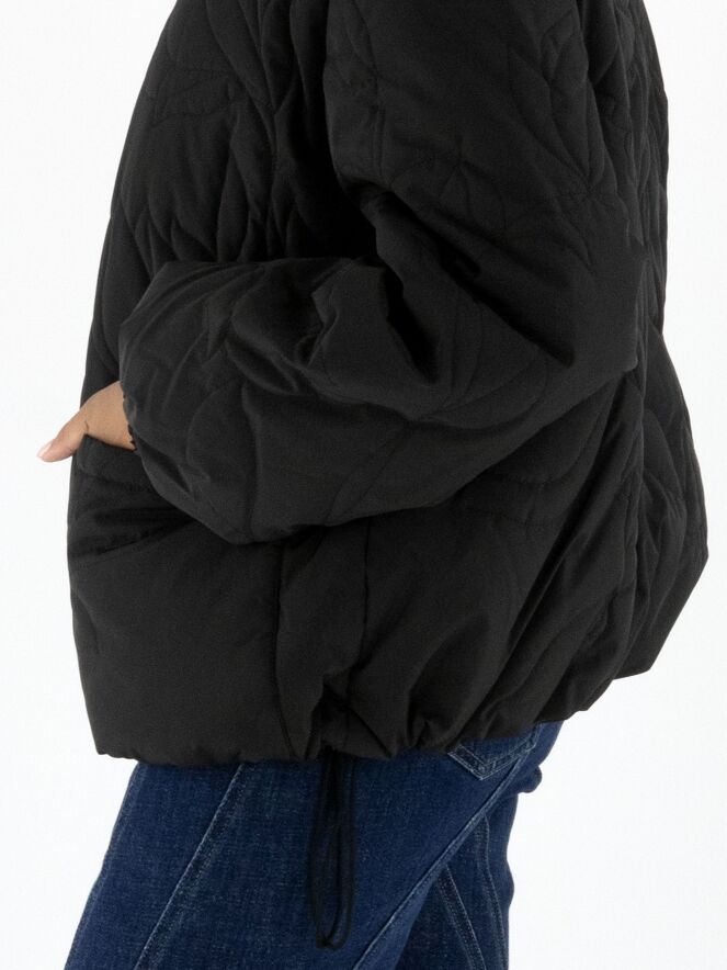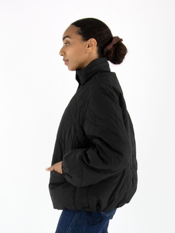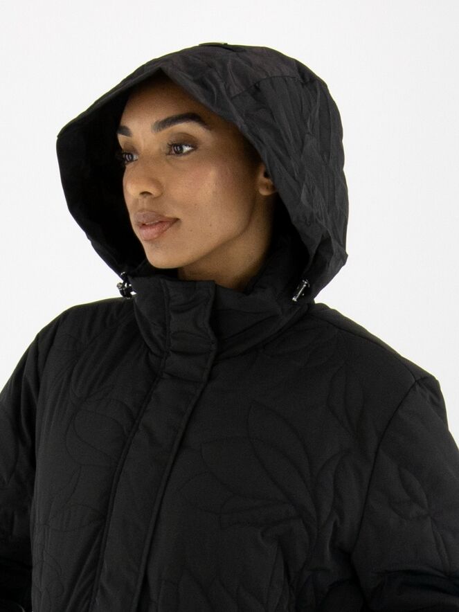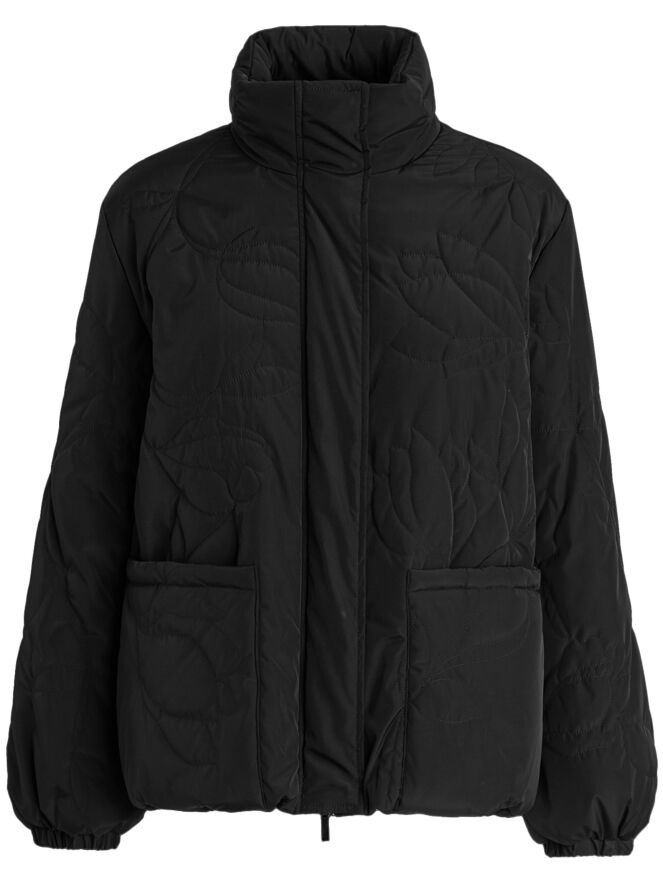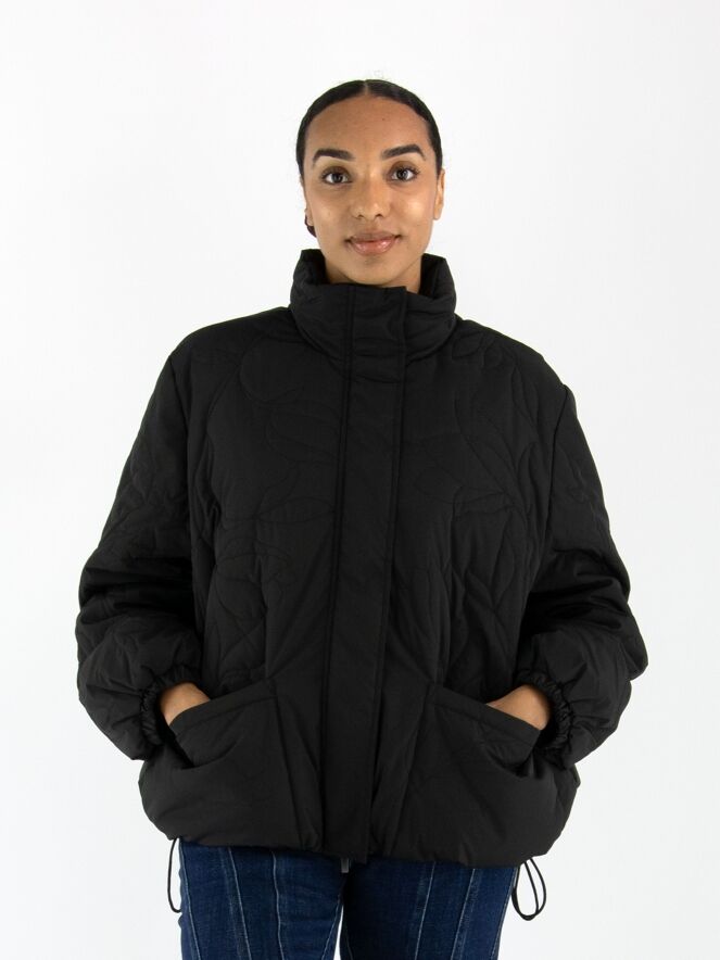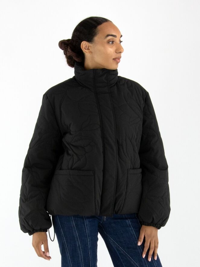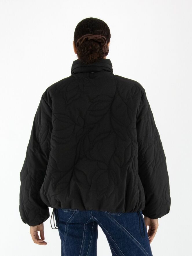 Un manteau matelassé de la marque High avec un motif de feuilles en noir. Il possède une fermeture zippée dissimulée avec des boutons-pression. Les poignets sont finis avec un bord élastique. Ce manteau ne doit pas être lavé.