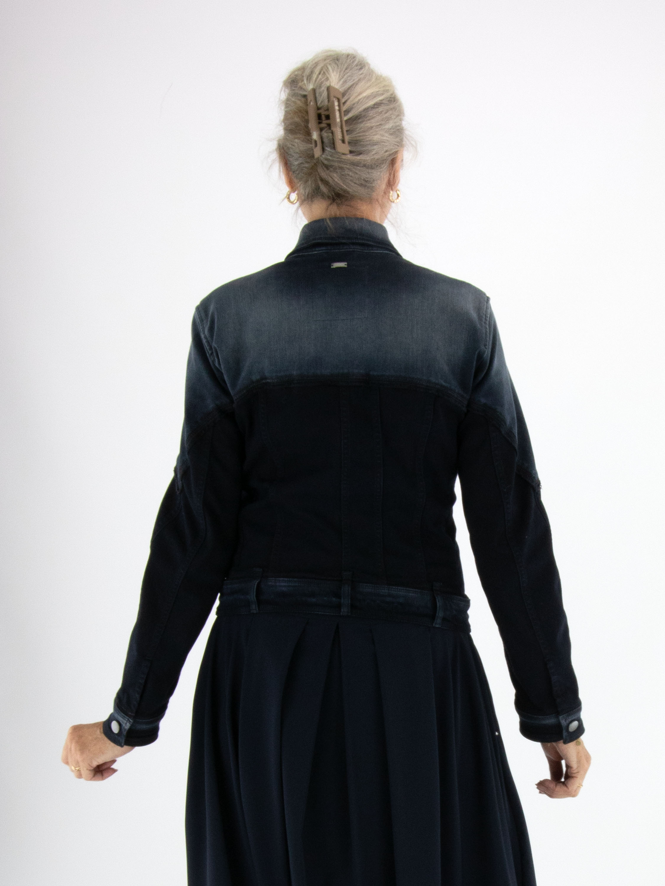 Une veste en jean de High avec un effet dégradé, passant du denim foncé en bas au jean usé en haut. Elle est dotée de trois fermetures à boucle jusqu’à la poitrine, suivies d’une fermeture à boutons. Des poches fendues se trouvent au niveau de la taille. Cette veste doit être lavée à la main.