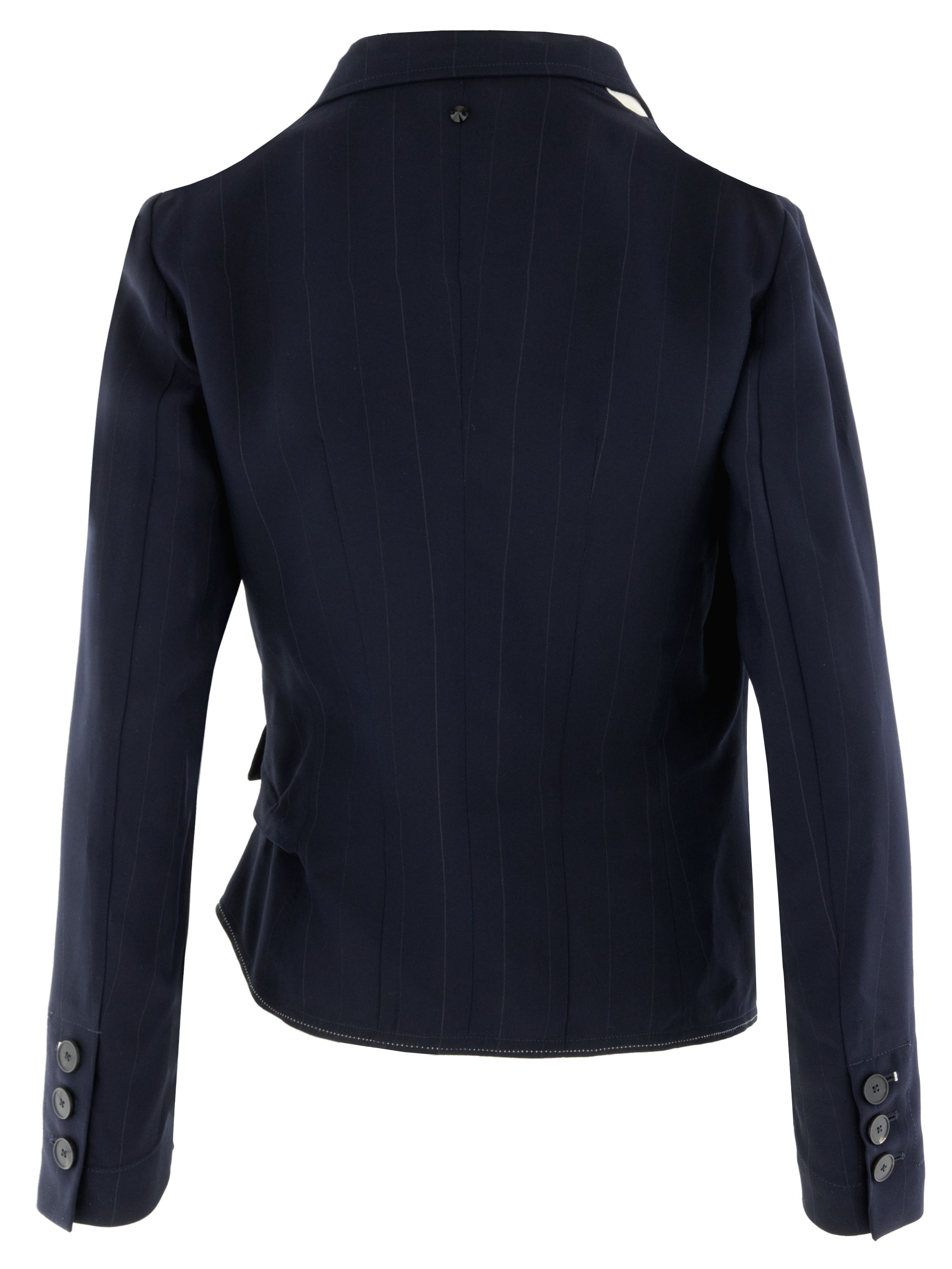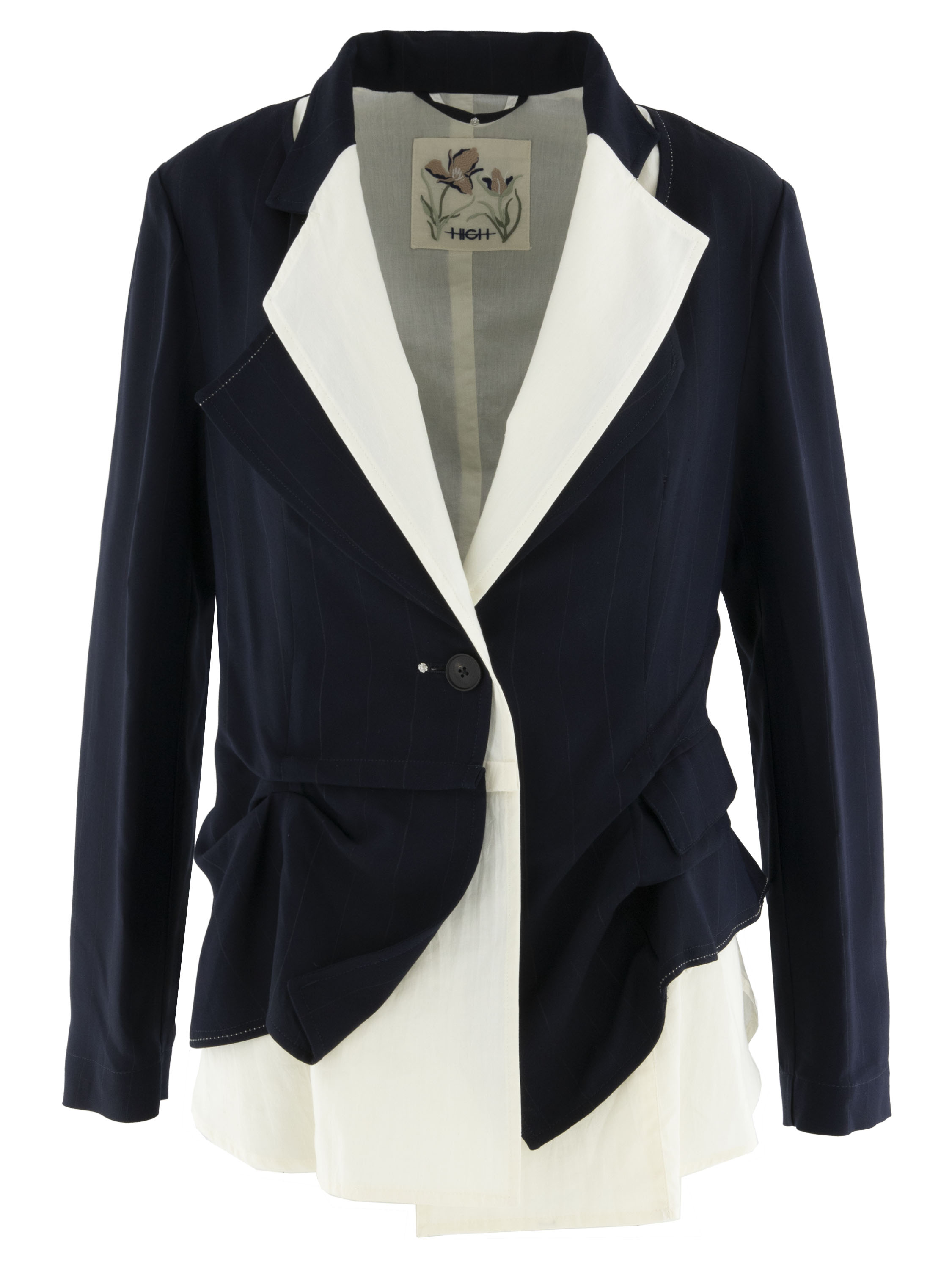 Un blazer de High en tissu à fines rayures ton sur ton dans une teinte bleu marine. Depuis les épaules, un second tissu est intégré dans le revers, descendant vers le bas et apparaissant sous le tissu principal. Le blazer se ferme par un bouton unique avec un clou décoratif à côté. Ce blazer ne doit pas être lavé.