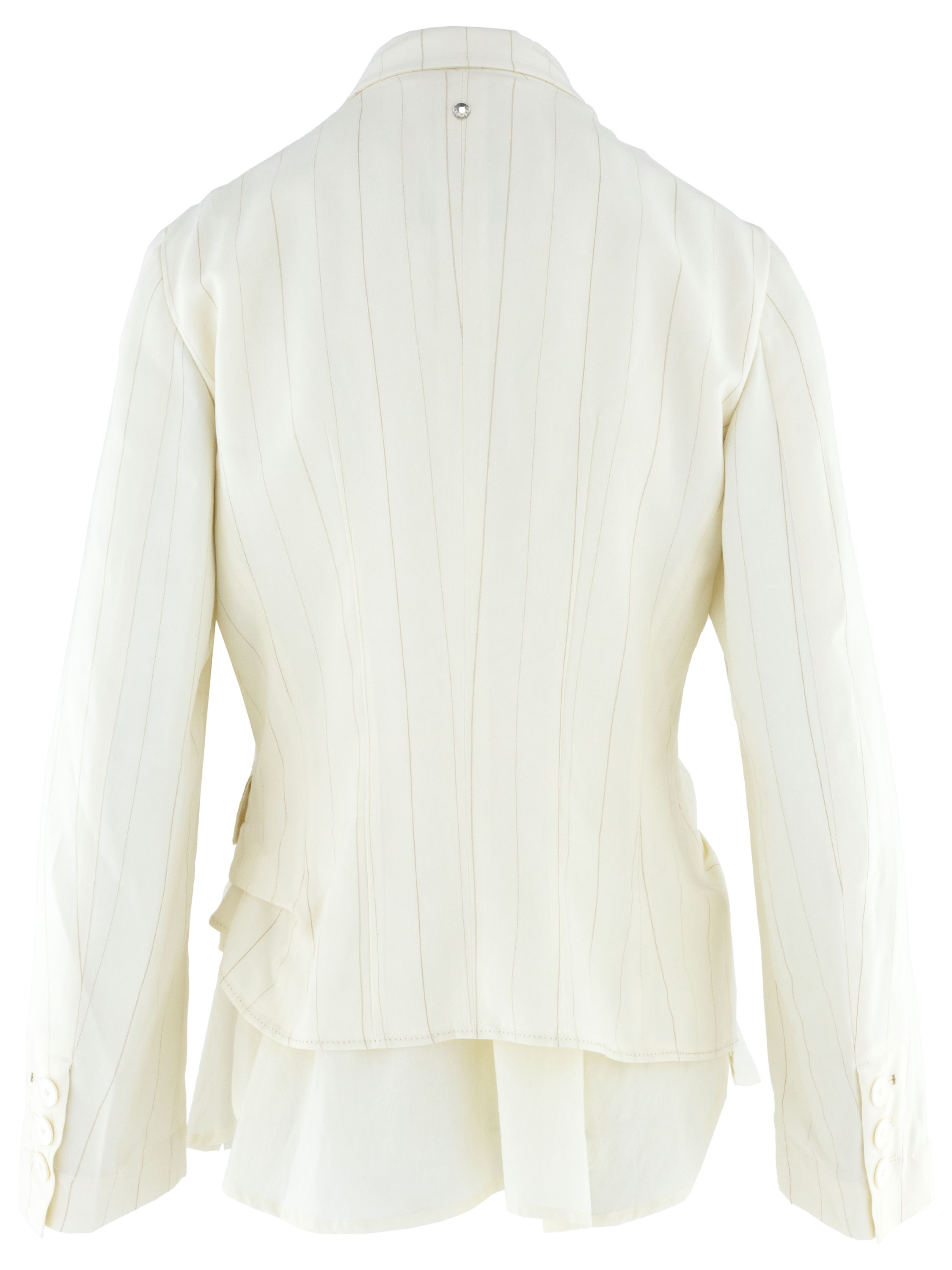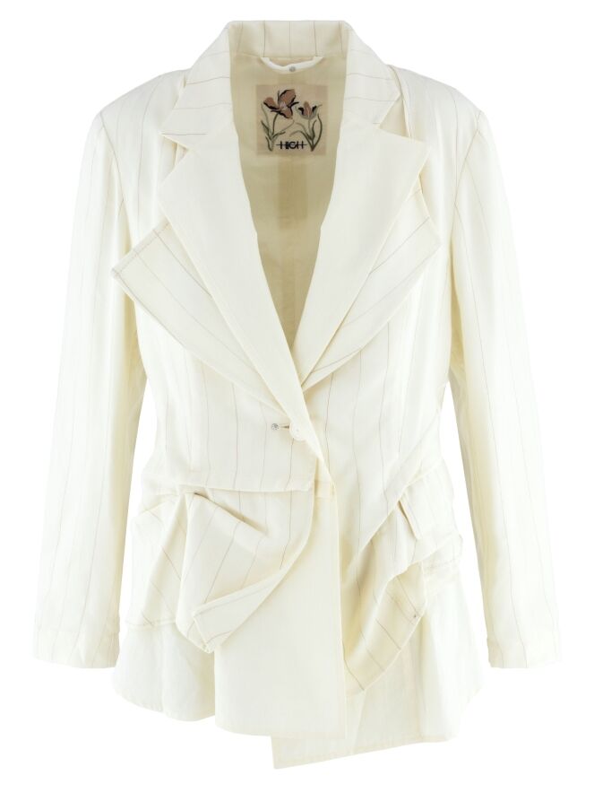 Blazer de High dans un motif à fines rayures craie en blanc crème et camel. Conçu en double épaisseur, le tissu uni recouvre le motif rayé au niveau du col double, tandis qu’à l’ourlet il se place en dessous, créant un effet superposé et contemporain. Sous les poches, le tissu rayé est fixé en certains points, formant un subtil effet plissé. Ce blazer de créateur exclusif ne doit pas être lavé.