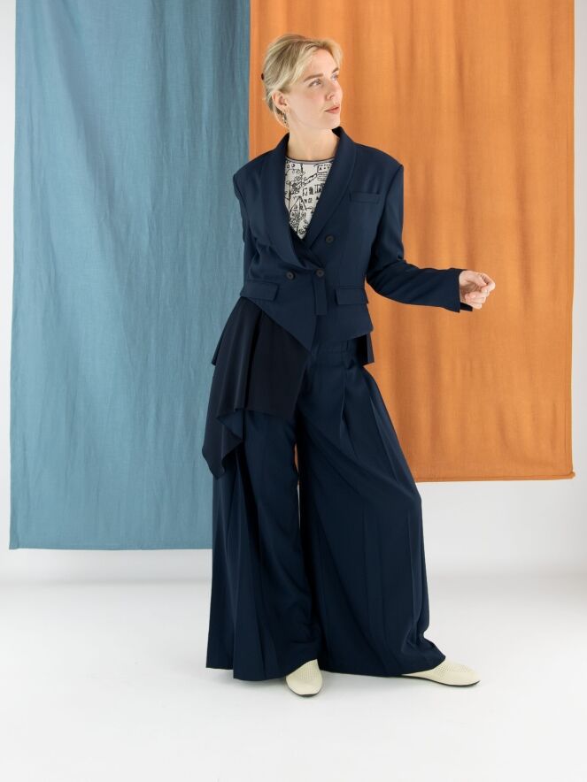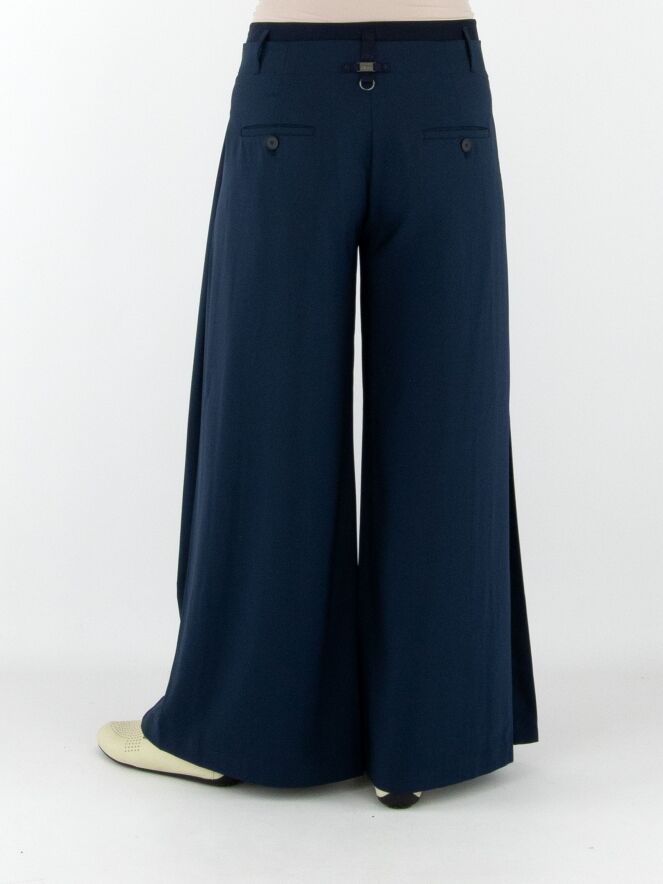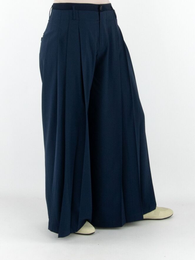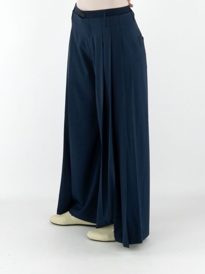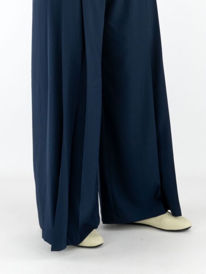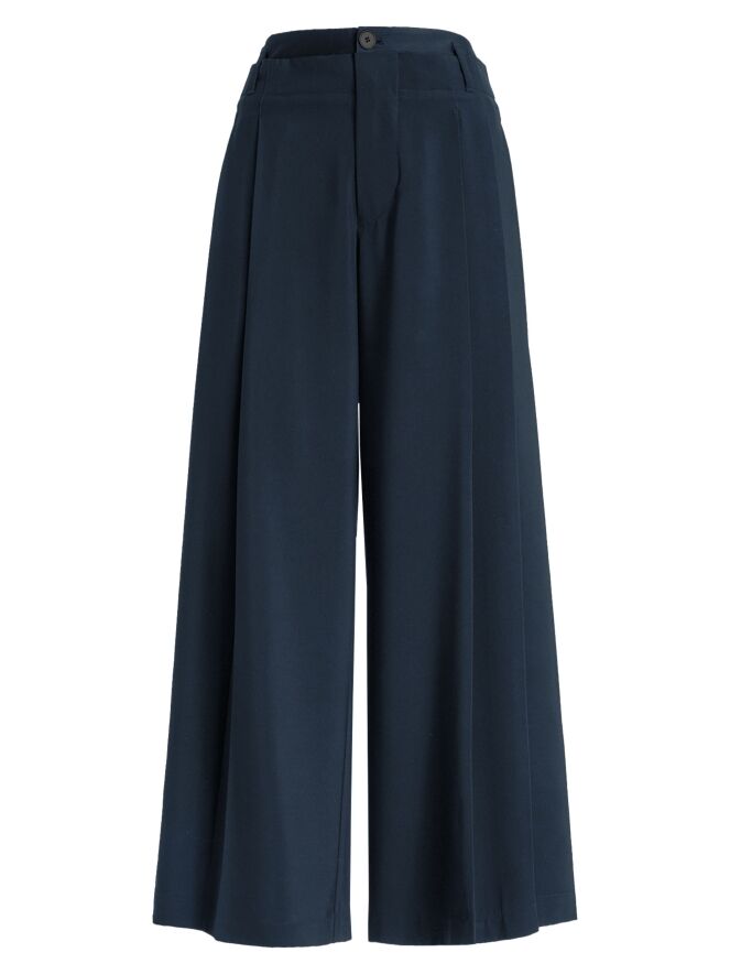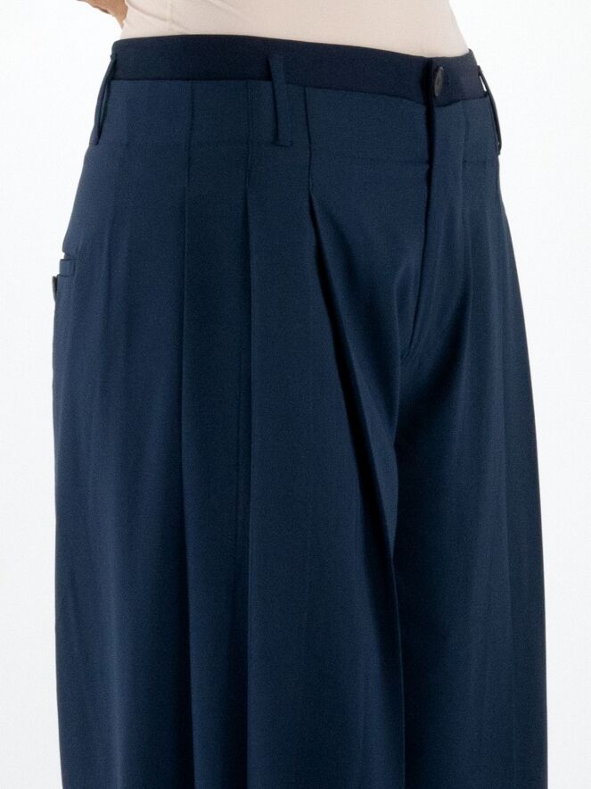 Pantalon de la marque High en bleu nuit. Une seconde couche de tissu satiné mat est ajoutée à la taille, par-dessus le tissu principal. Sur les deux côtés, le tissu est travaillé en quelques plis. Le pantalon dispose de poches fendues et doit être lavé à la main.