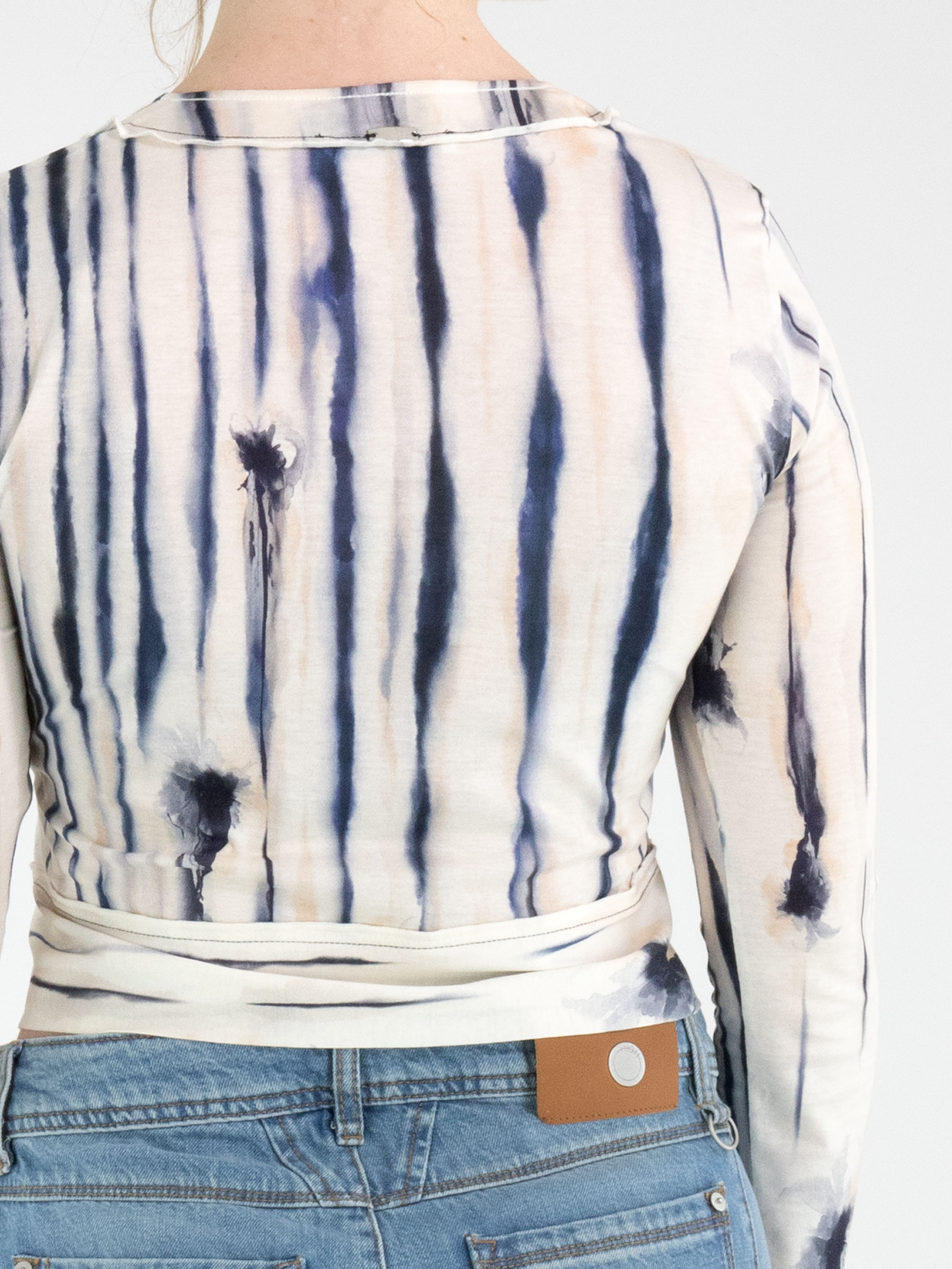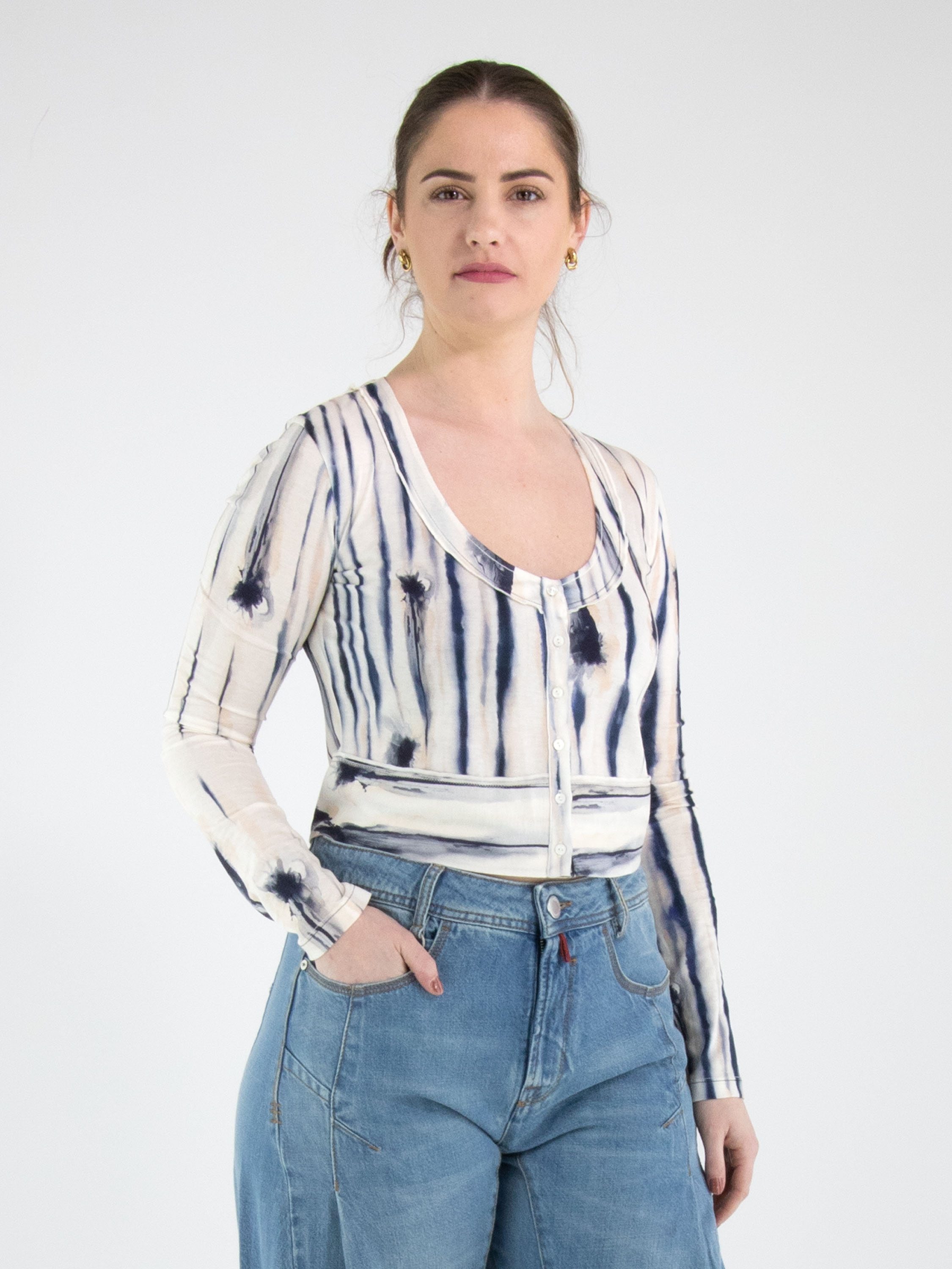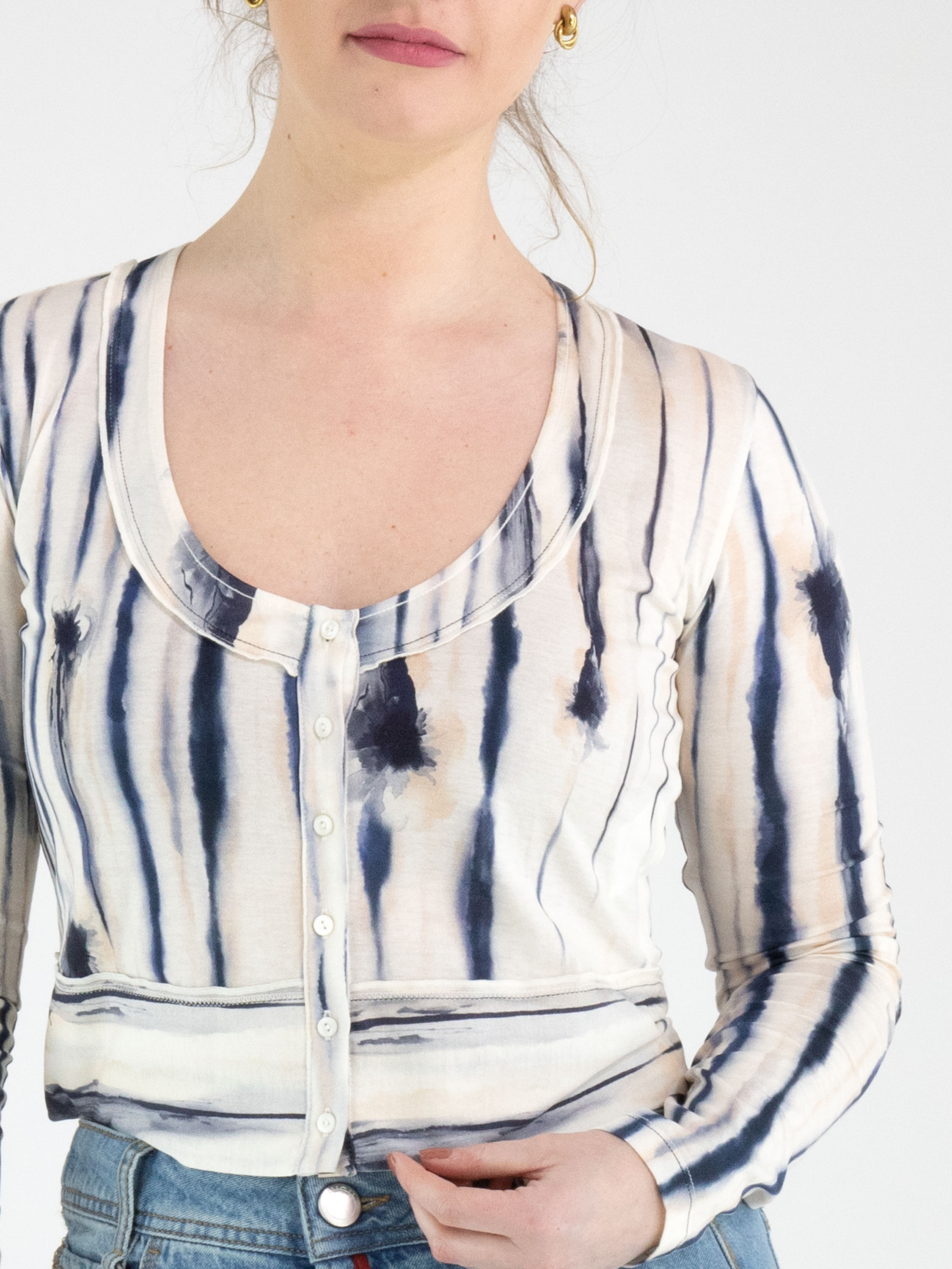 Un cardigan court de High avec un imprimé peint à rayures dans les tons noir, bleu et nude sur un fond écru. Le cardigan possède une encolure ronde profonde et une fermeture à boutons. Ce cardigan peut être lavé à la main.