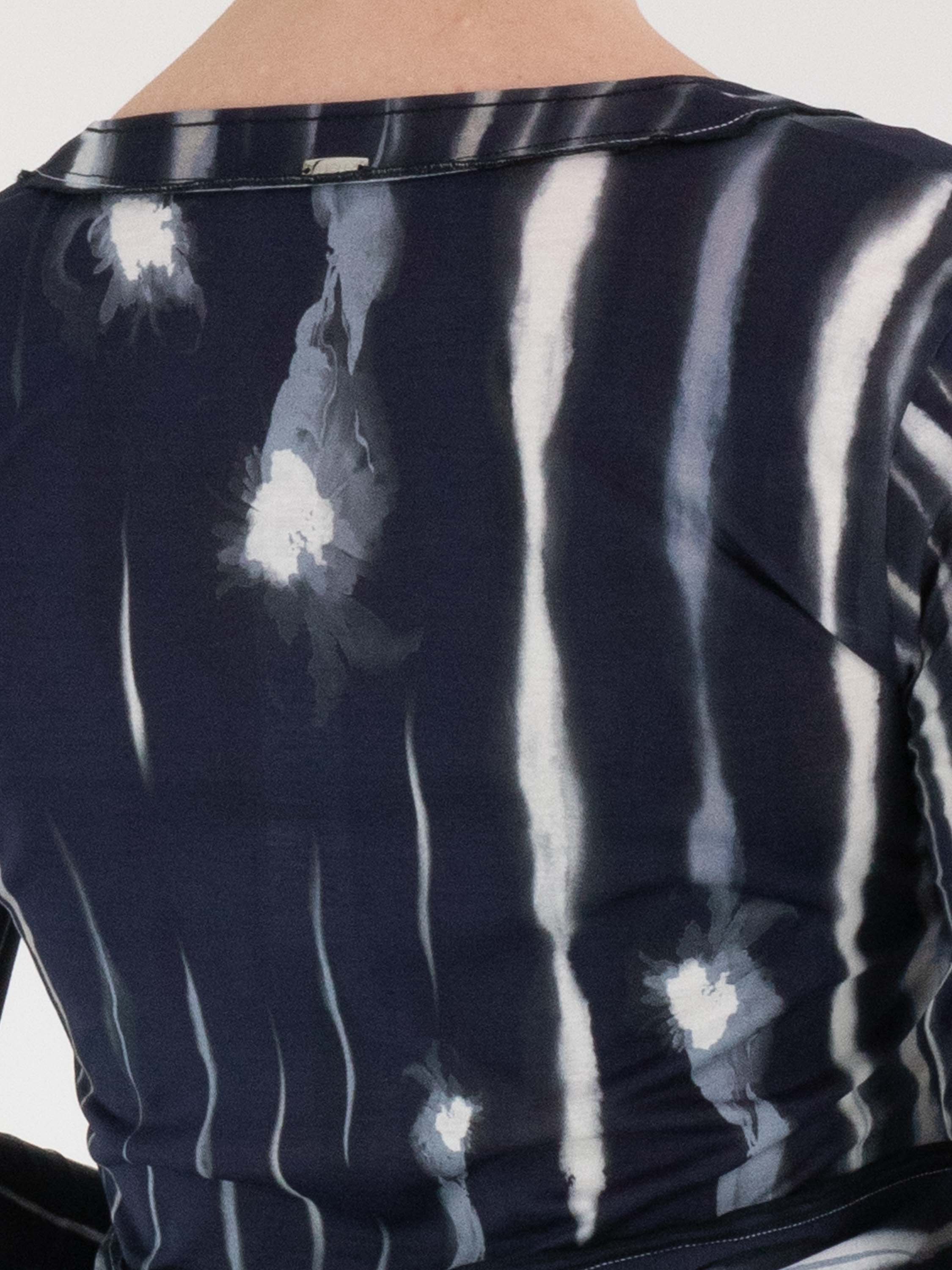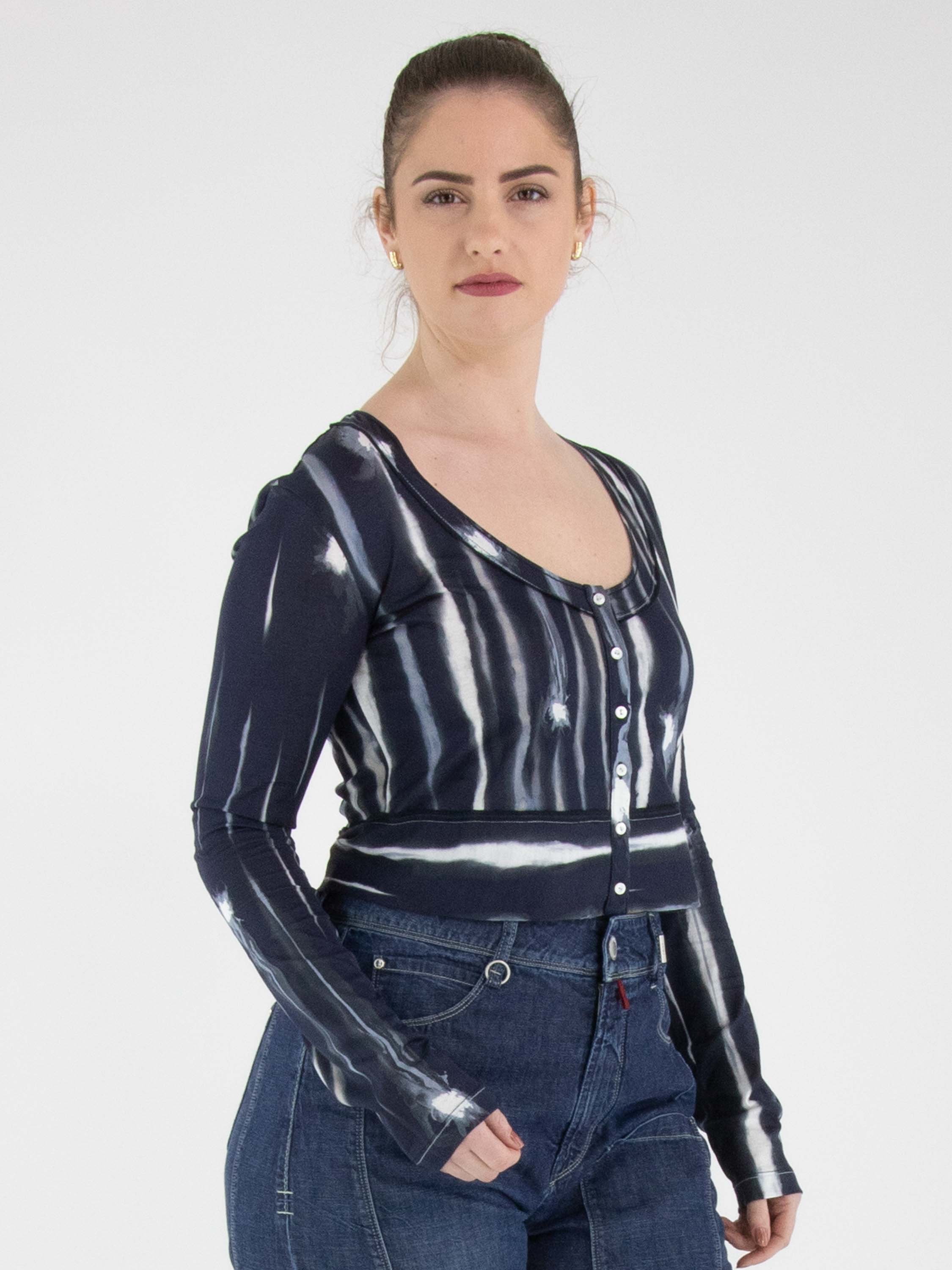 Un cardigan court de High avec un imprimé peint à rayures dans les tons bleu marine et écru. Le cardigan possède une encolure ronde profonde et une fermeture à boutons. Ce cardigan peut être lavé à la main.