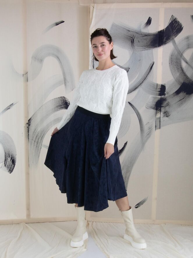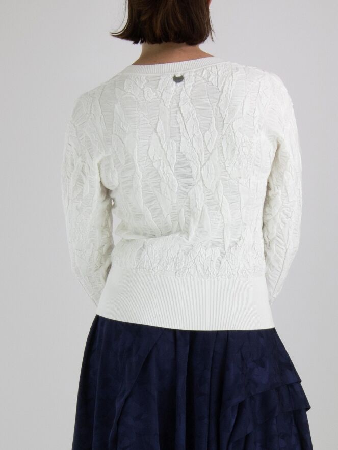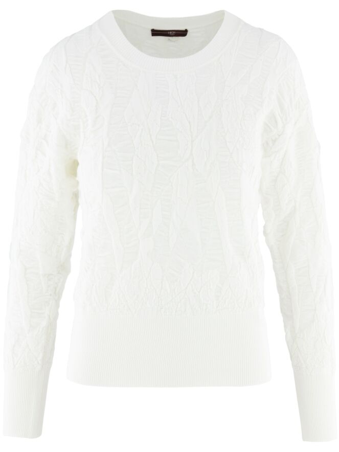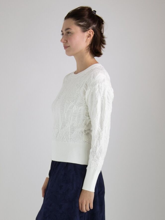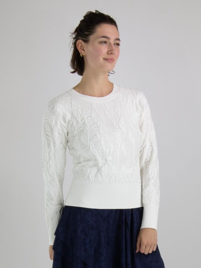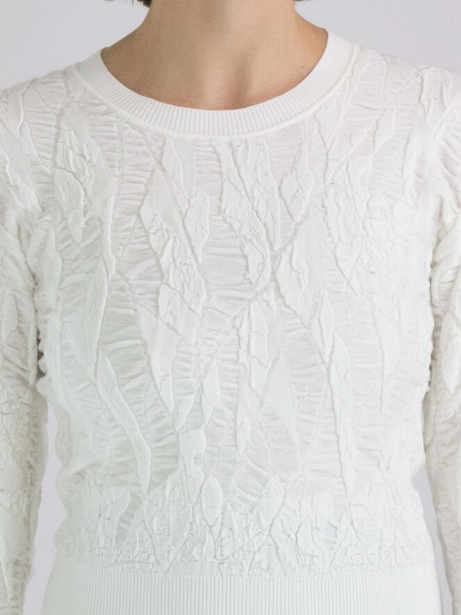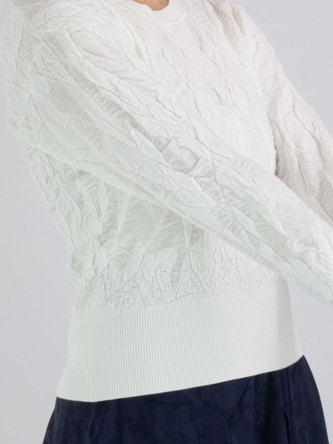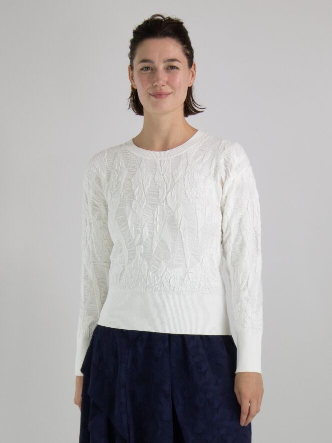 Un pull-over de High en blanc crème. Le tissu présente une structure en relief avec un motif de feuilles. Le long du bord du col rond, aux extrémités des manches courtes et en bas du pull, il y a un bord en tricot finement côtelé. Ce pull-over peut être lavé à la main.