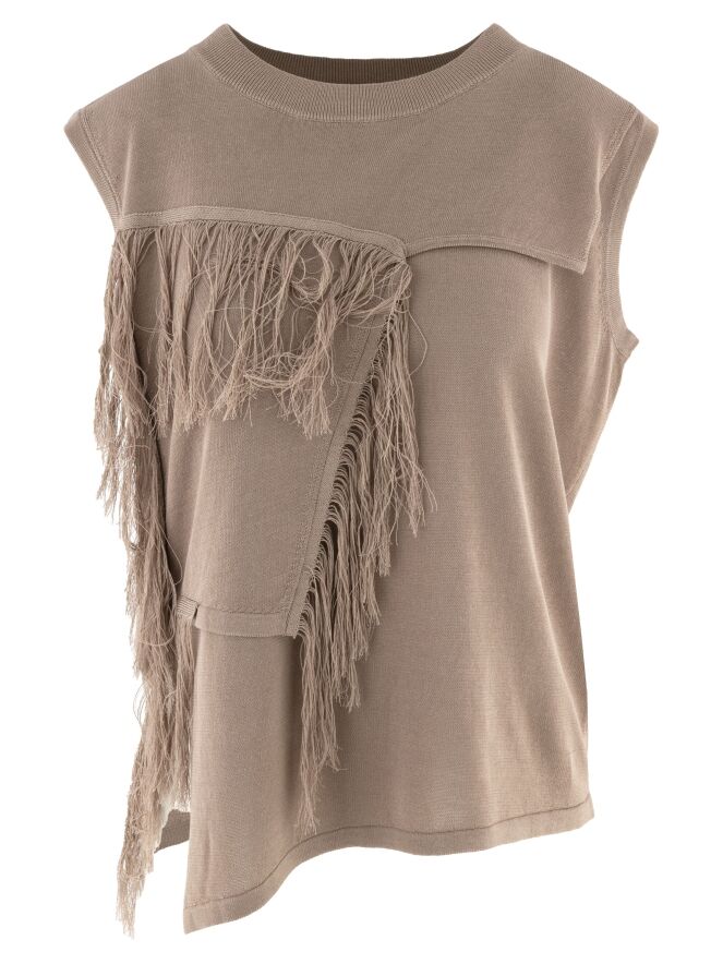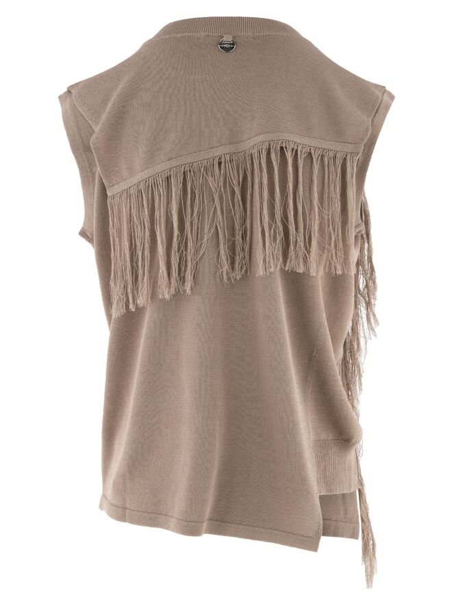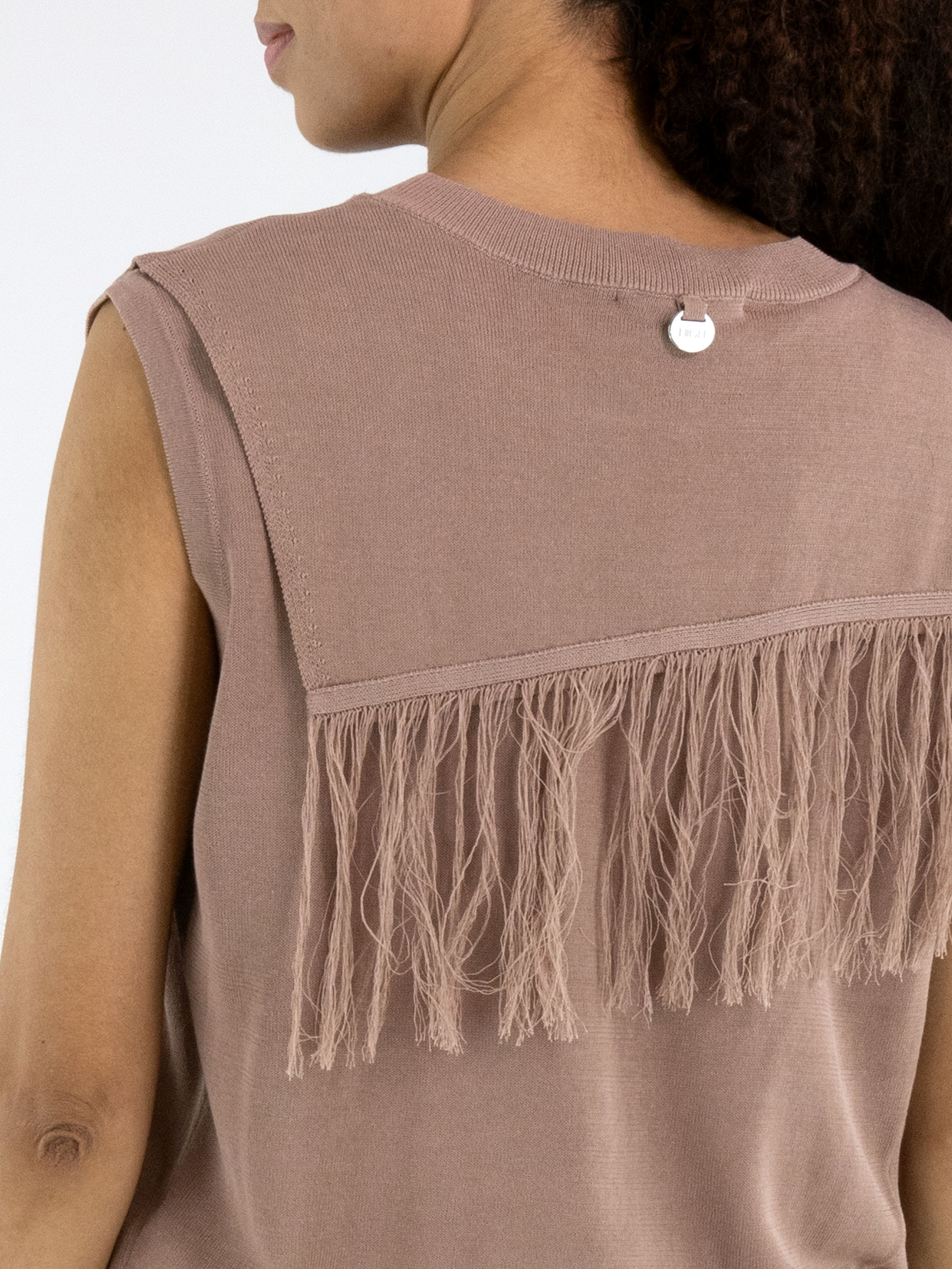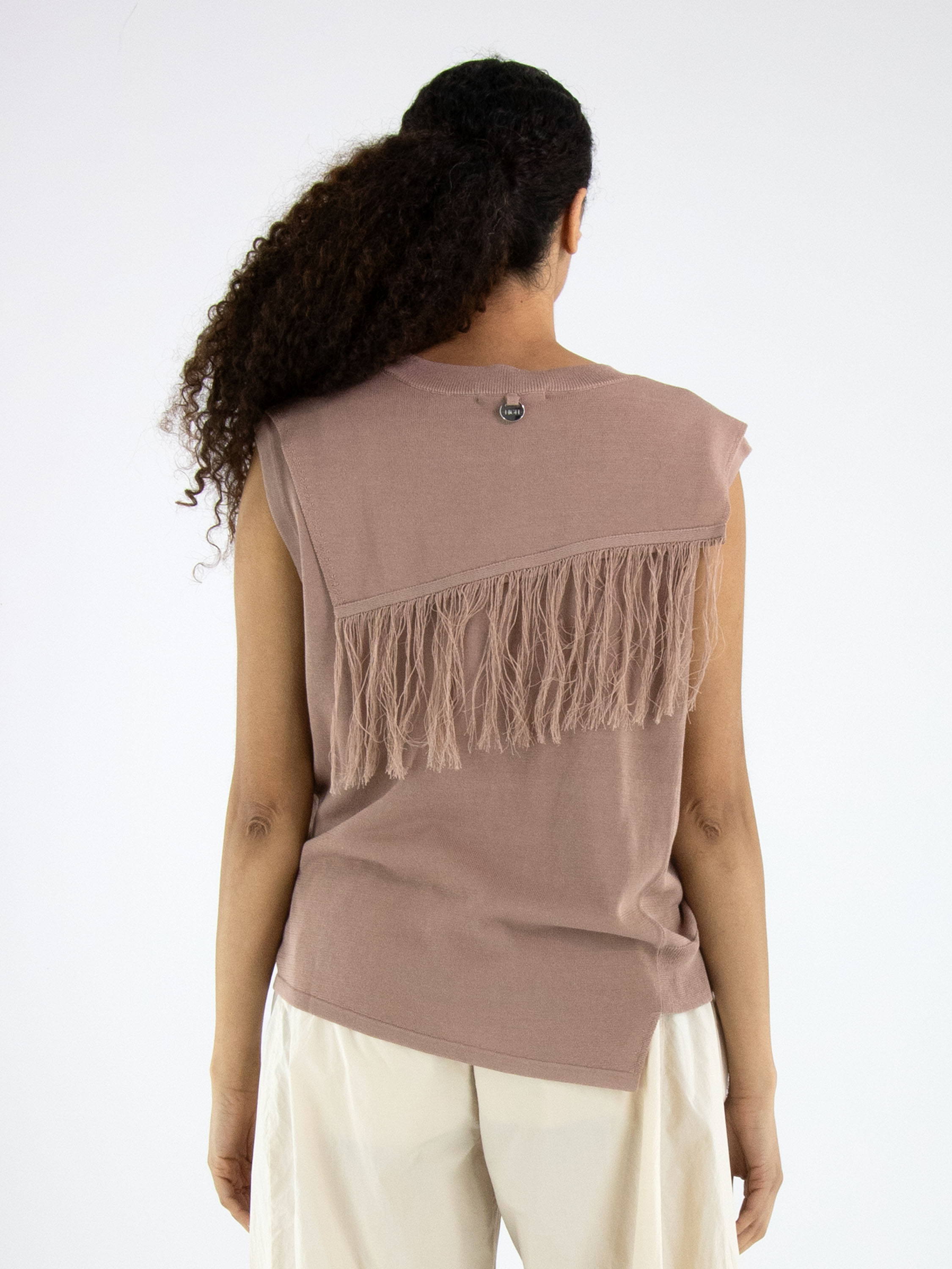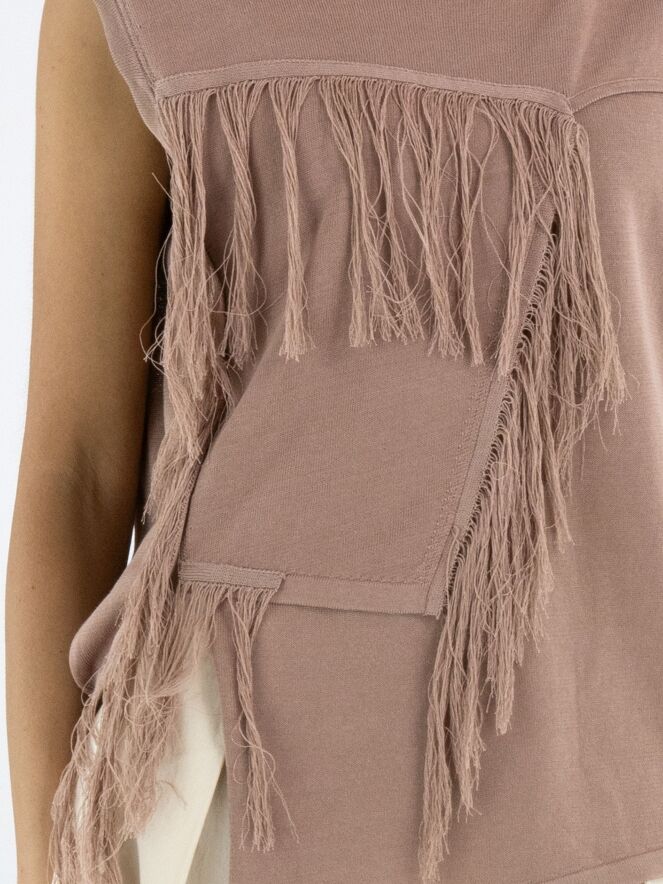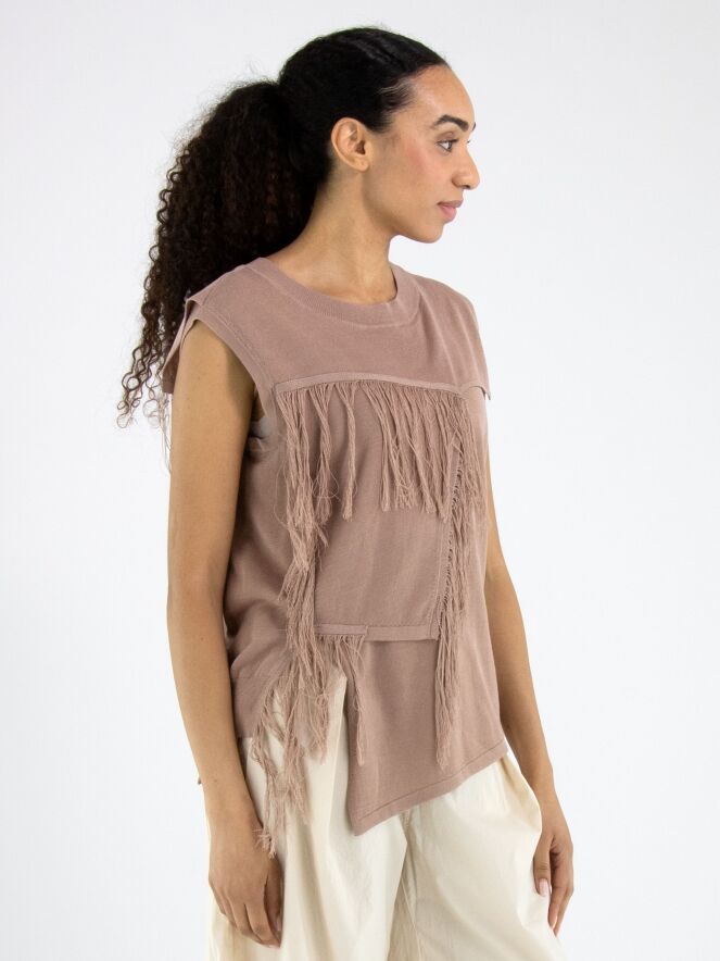 Un pull sans manches de High dans une teinte mauve. À l’arrière, une double épaisseur de tissu descend jusqu’au-dessous des omoplates et est finie par de longues franges le long du bord. À l’avant, une double épaisseur est également appliquée jusqu’à la poitrine et se prolonge sur le côté gauche jusqu’à la taille. Les bords sont également ornés de longues franges. Ce pull sans manches peut être lavé à la main.