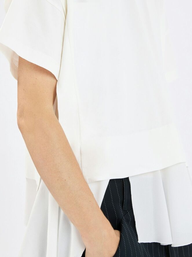T-shirt de High en blanc crème. Doté d’un col rond et de manches courtes, il présente une couture sur le côté droit d’où le tissu se prolonge subtilement, créant un effet contemporain et original. Au bas du modèle, une couche de voile plissée et arrondie apparaît, apportant une finition raffinée et superposée. Ce t-shirt de créateur exclusif doit être lavé à la main.