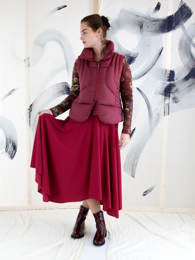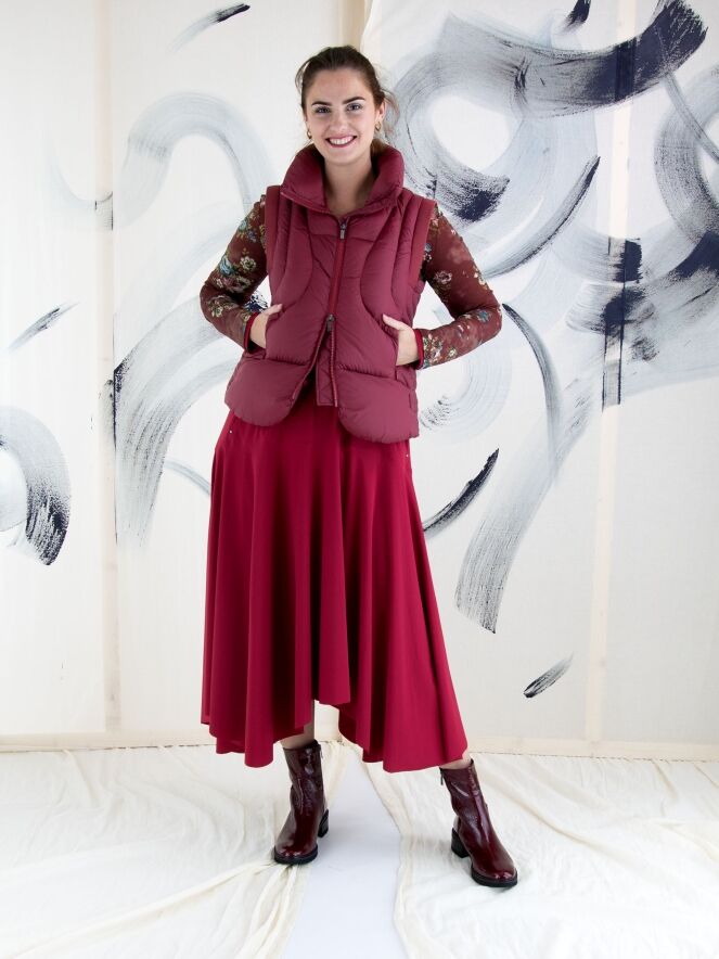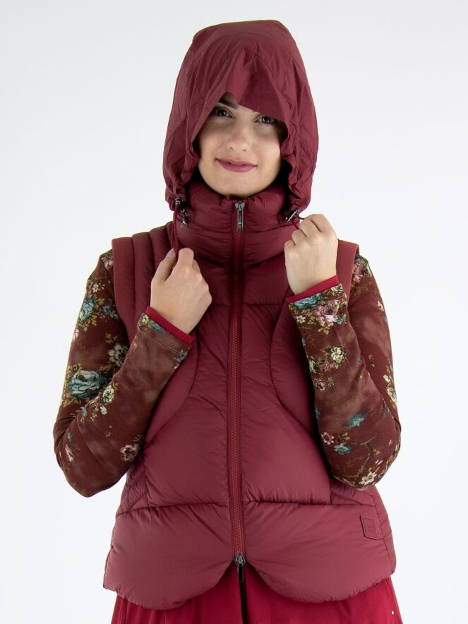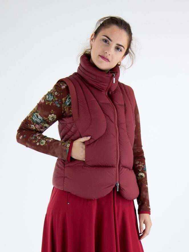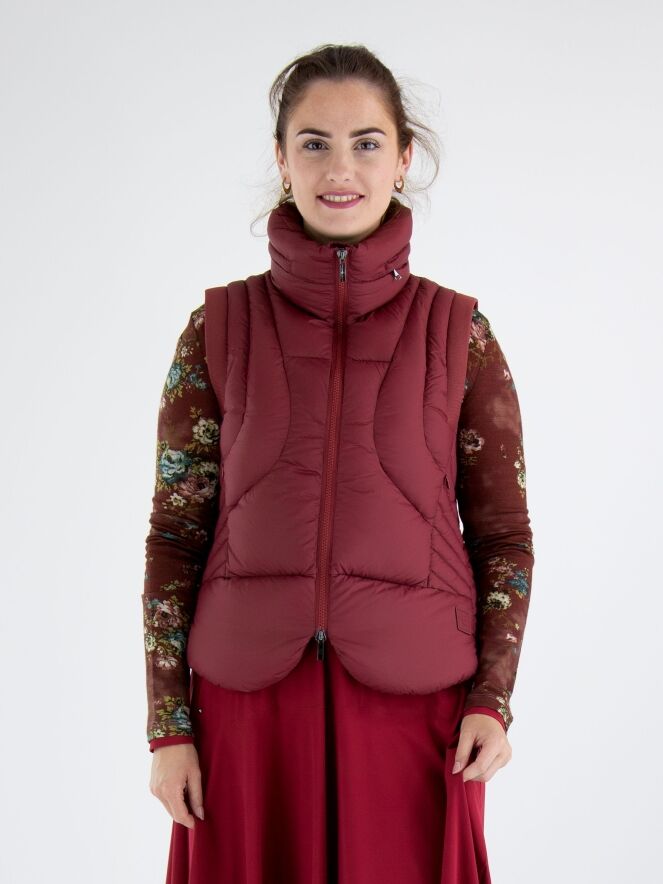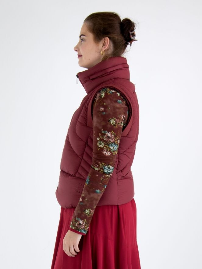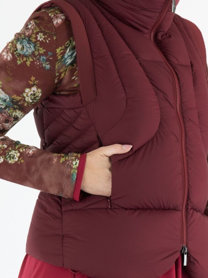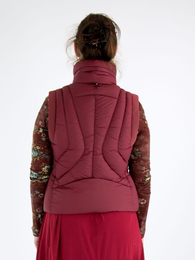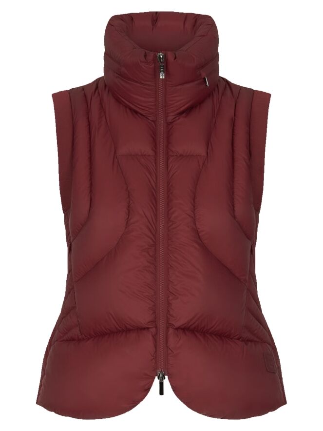 Un gilet matelassé de High en couleur bordeaux. Le gilet possède des poches zippées et des cordons à l'ourlet pour créer un effet plissé. Le long des bords des emmanchures, il y a des poignets en tricot finement côtelés. Ce gilet peut être lavé à 30 degrés Celsius.