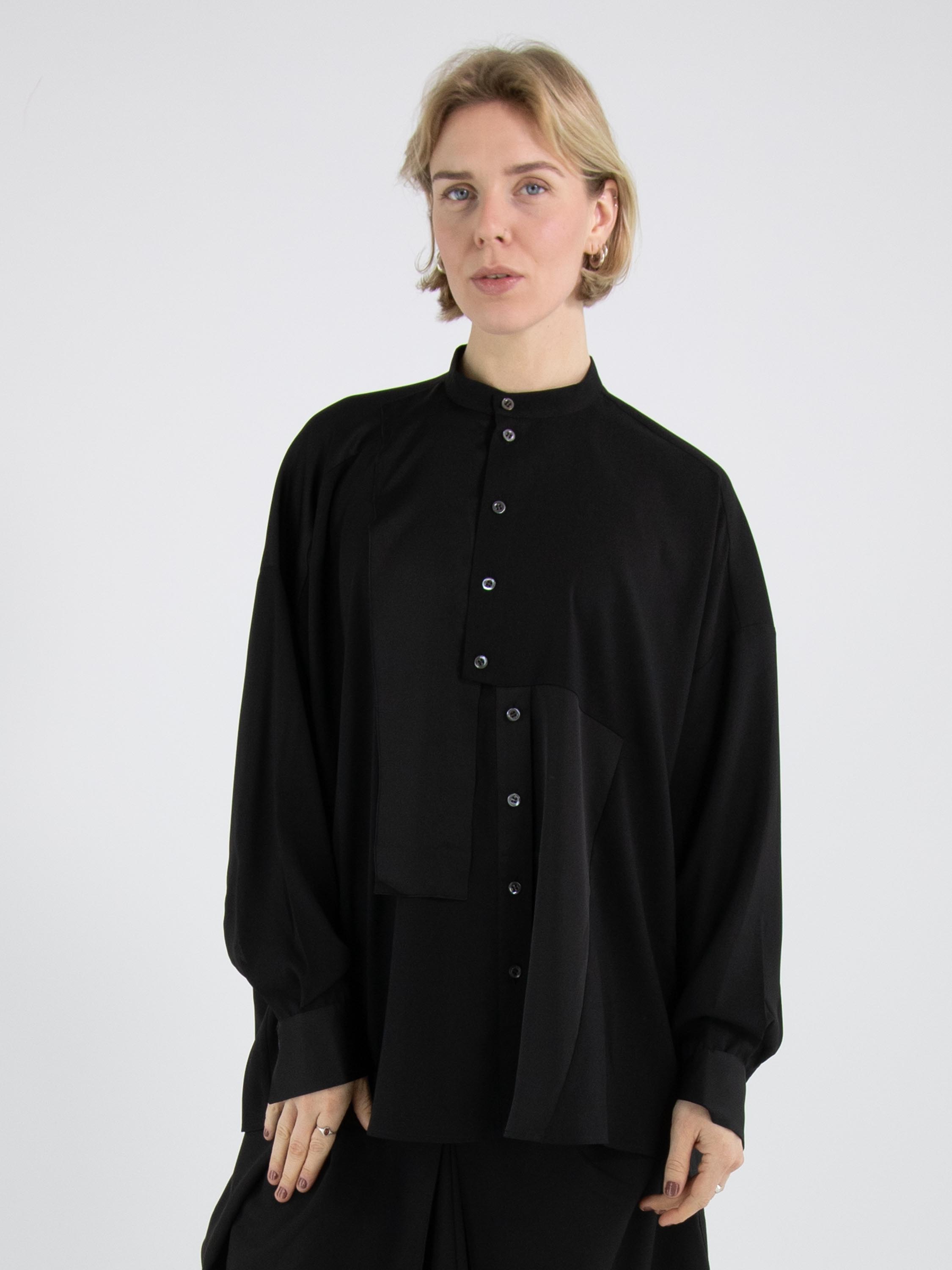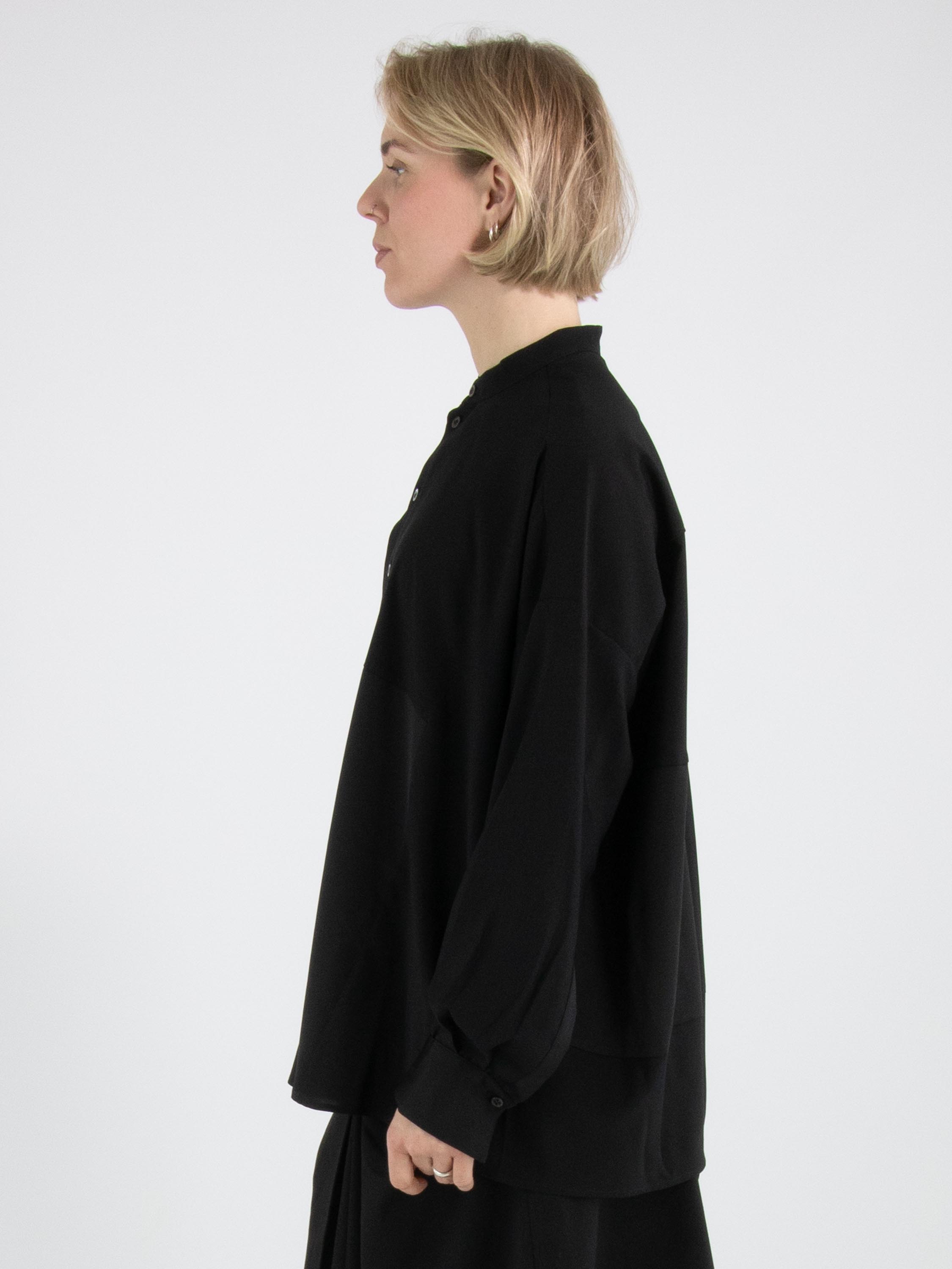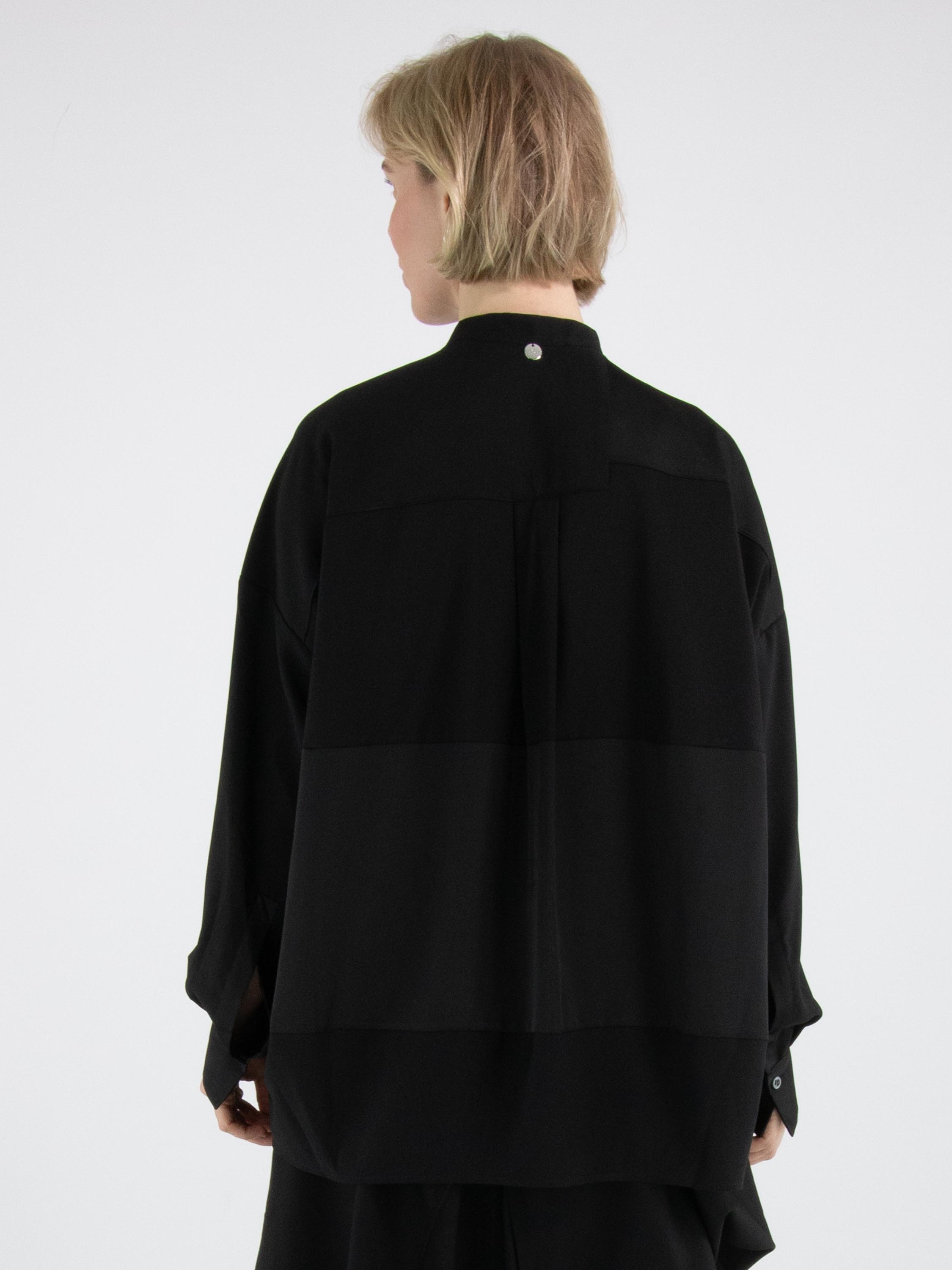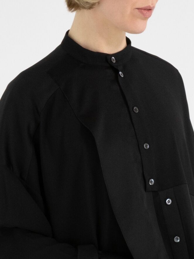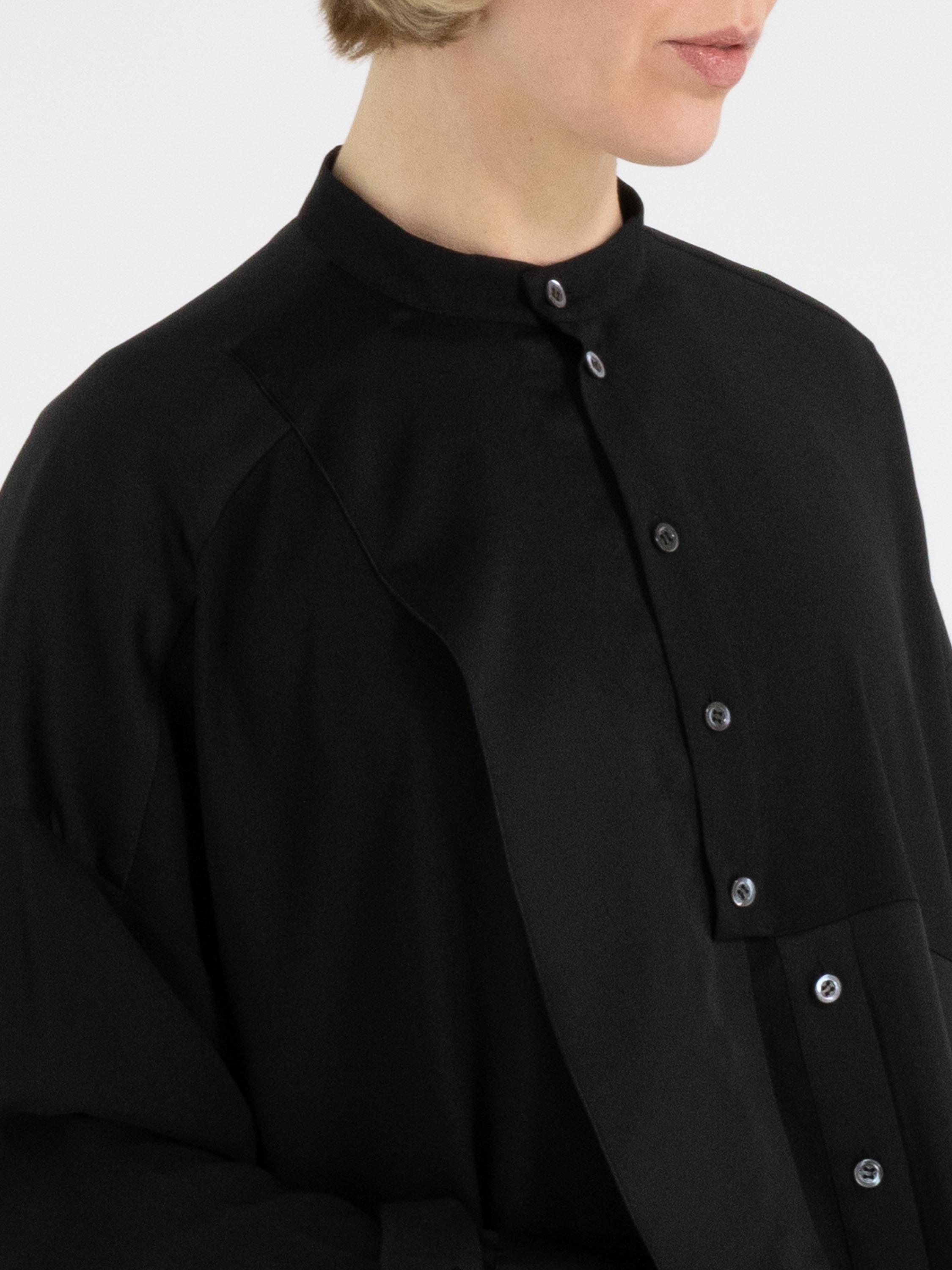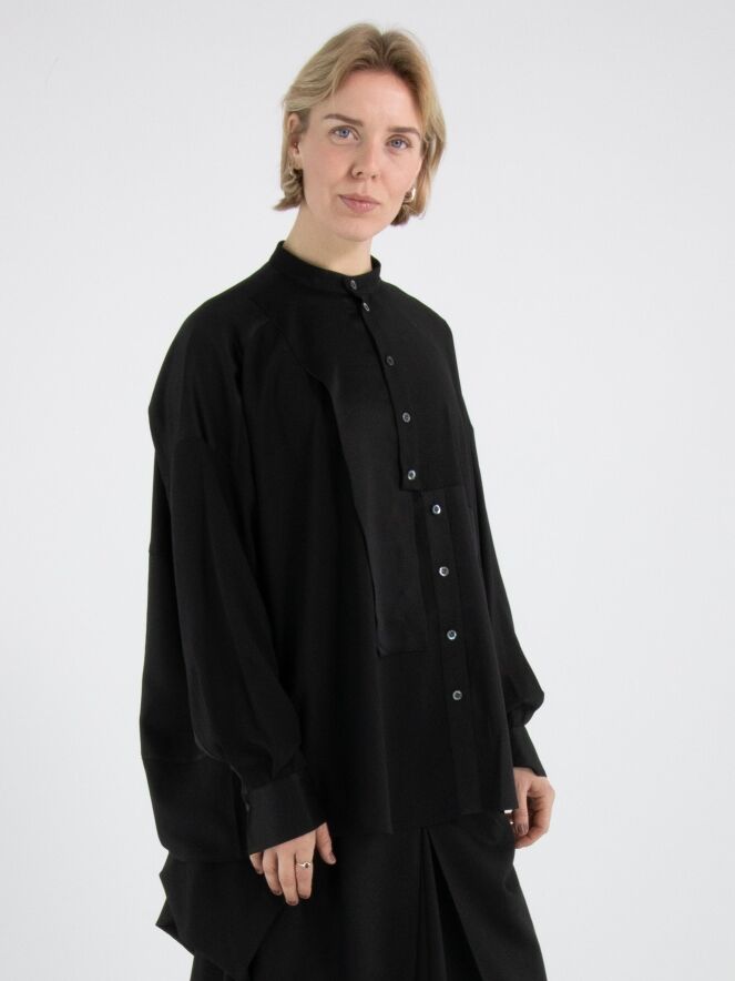 Une blouse de High Tech en noir. Le tissu est en partie mat et en partie en satin mat. De l’encolure jusqu’au-dessous de la poitrine, la patte de boutonnage est centrée. À partir de dessous la poitrine, la fermeture est décalée de quelques centimètres vers la droite, ce qui empêche l’ouverture complète de la blouse. Le long du bord des poignets des manches longues, le tissu est plissé. Cette blouse peut être lavée à la main.