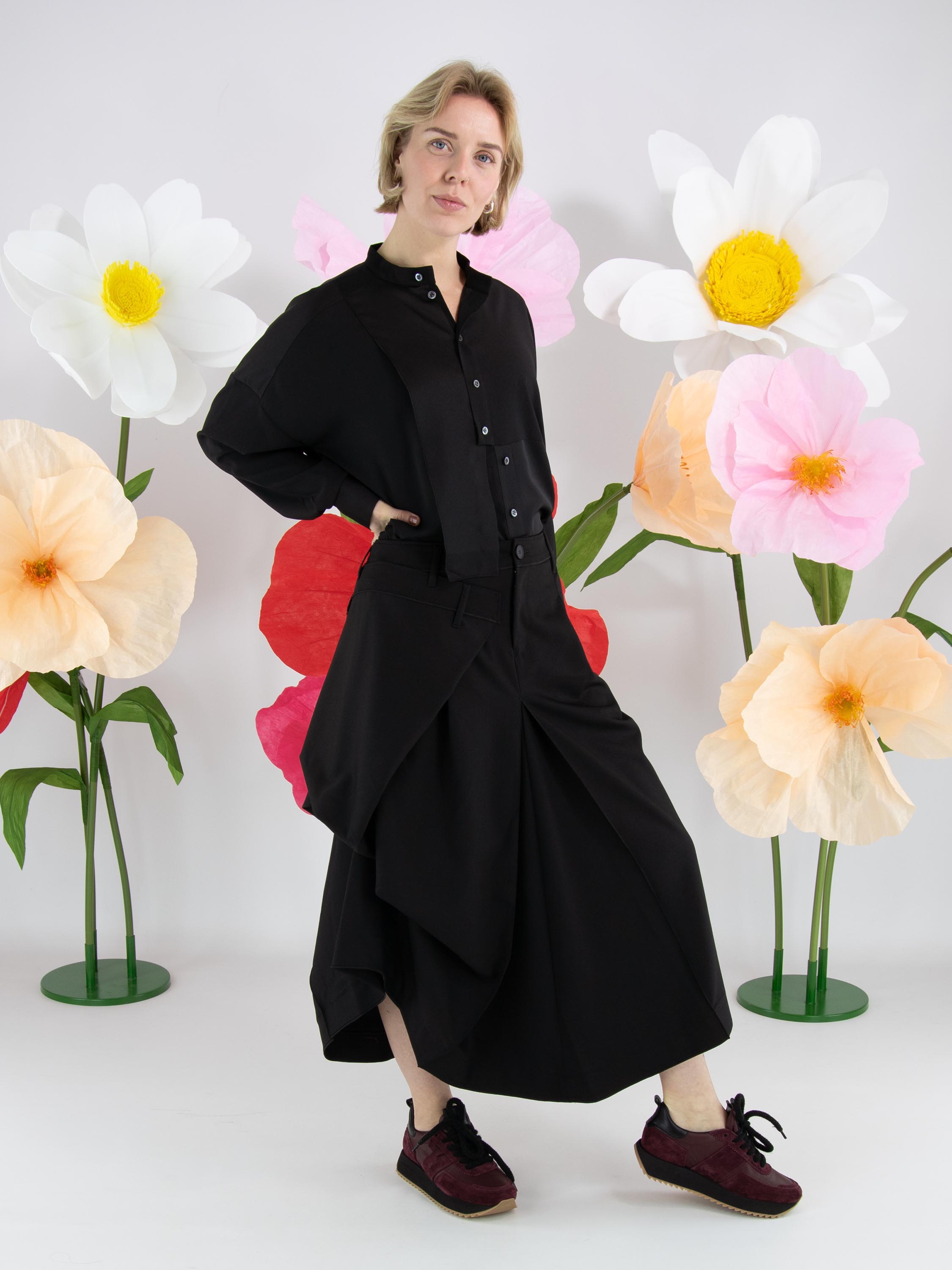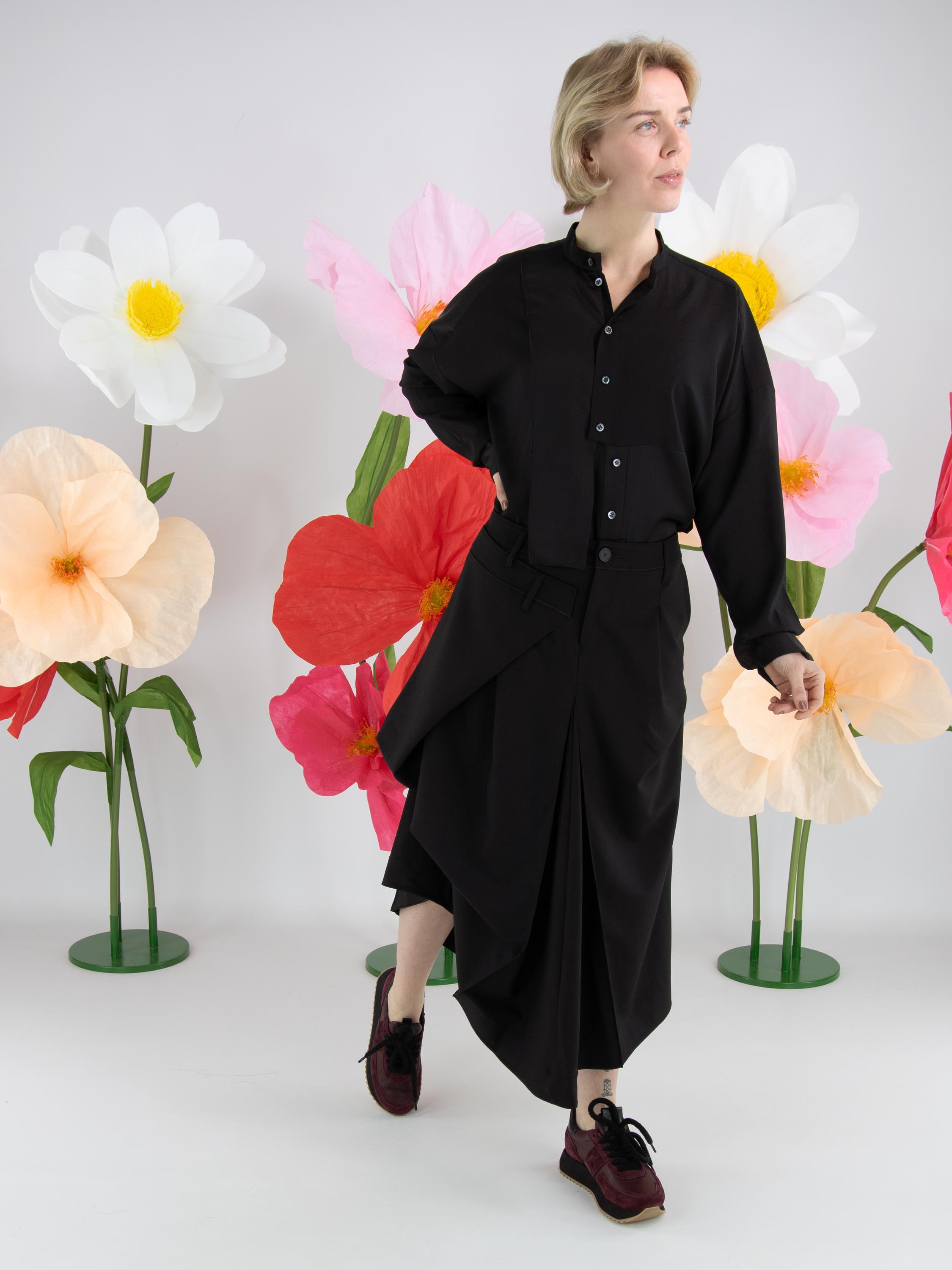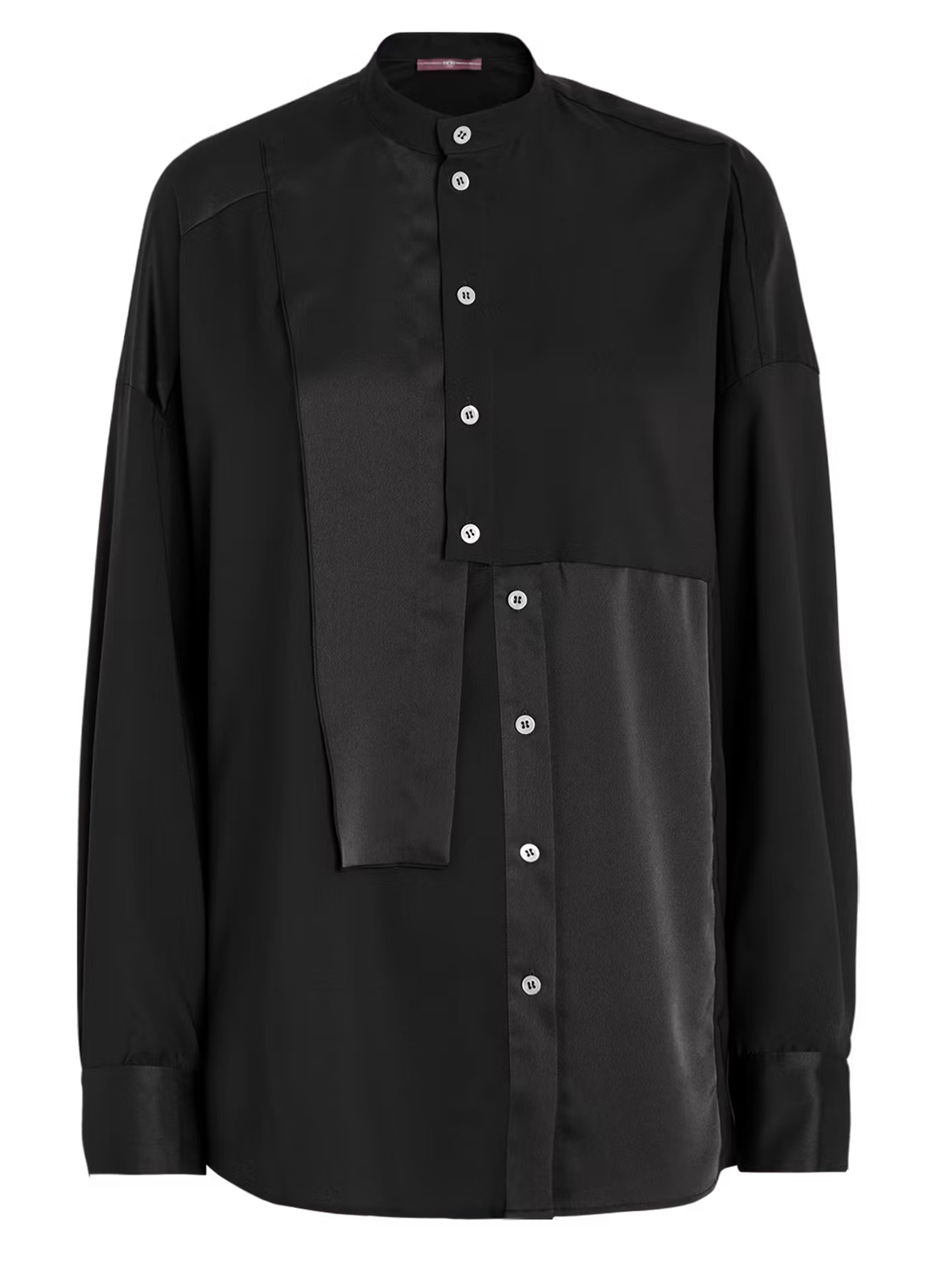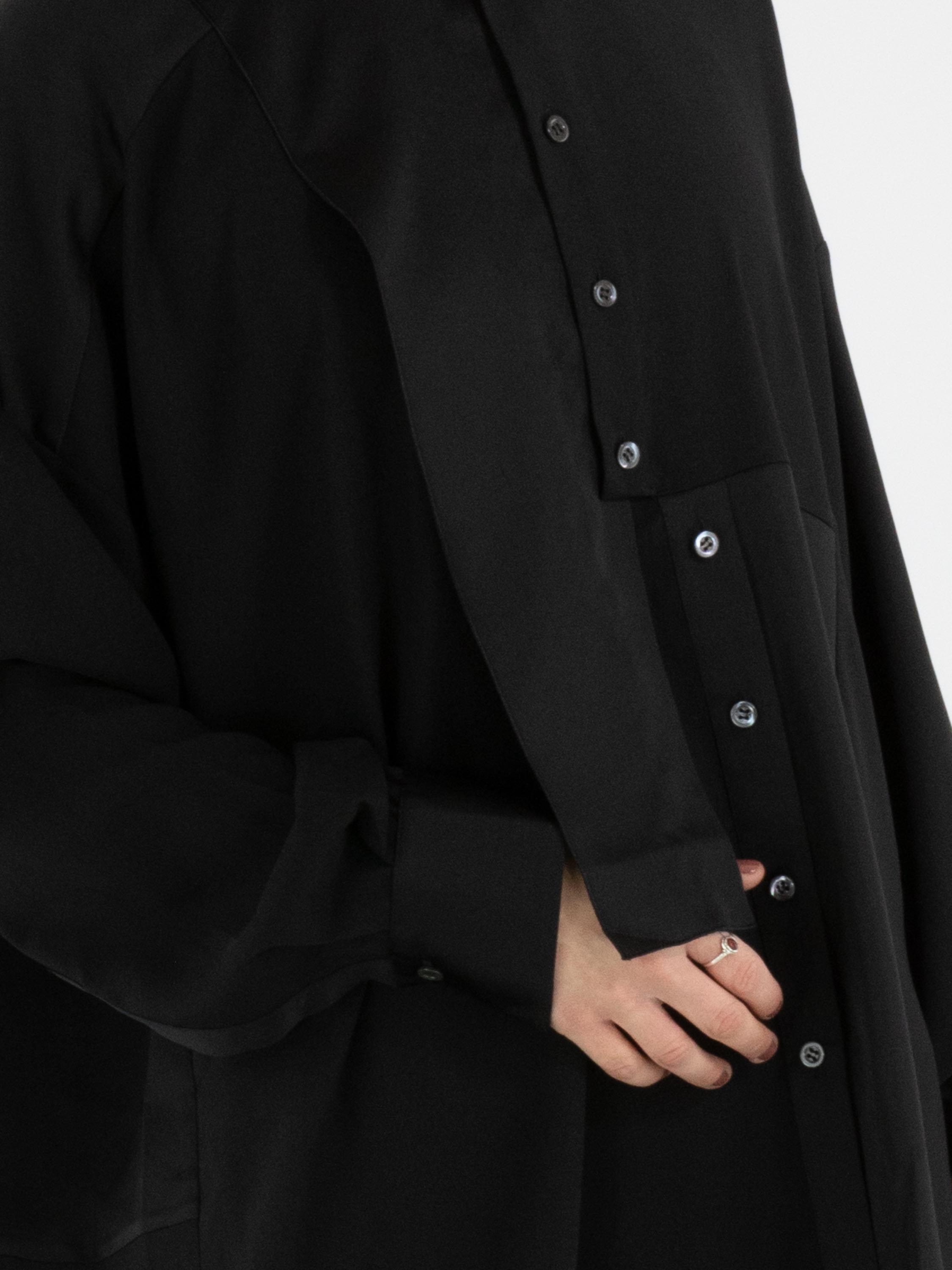 Une blouse de High Tech en noir. Le tissu est en partie mat et en partie en satin mat. De l’encolure jusqu’au-dessous de la poitrine, la patte de boutonnage est centrée. À partir de dessous la poitrine, la fermeture est décalée de quelques centimètres vers la droite, ce qui empêche l’ouverture complète de la blouse. Le long du bord des poignets des manches longues, le tissu est plissé. Cette blouse peut être lavée à la main.