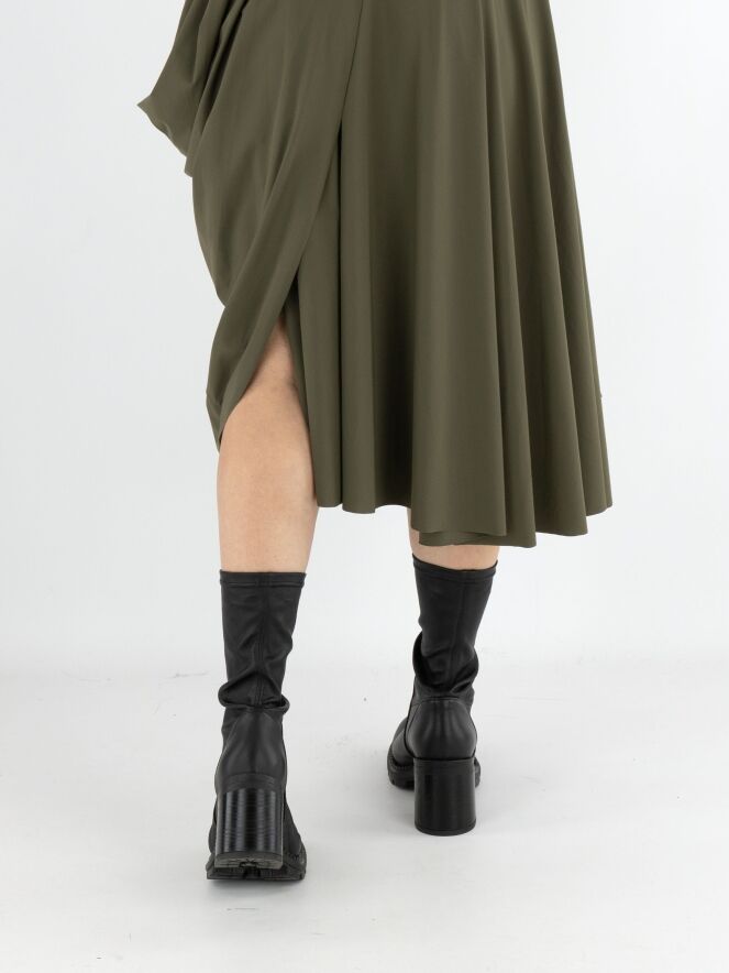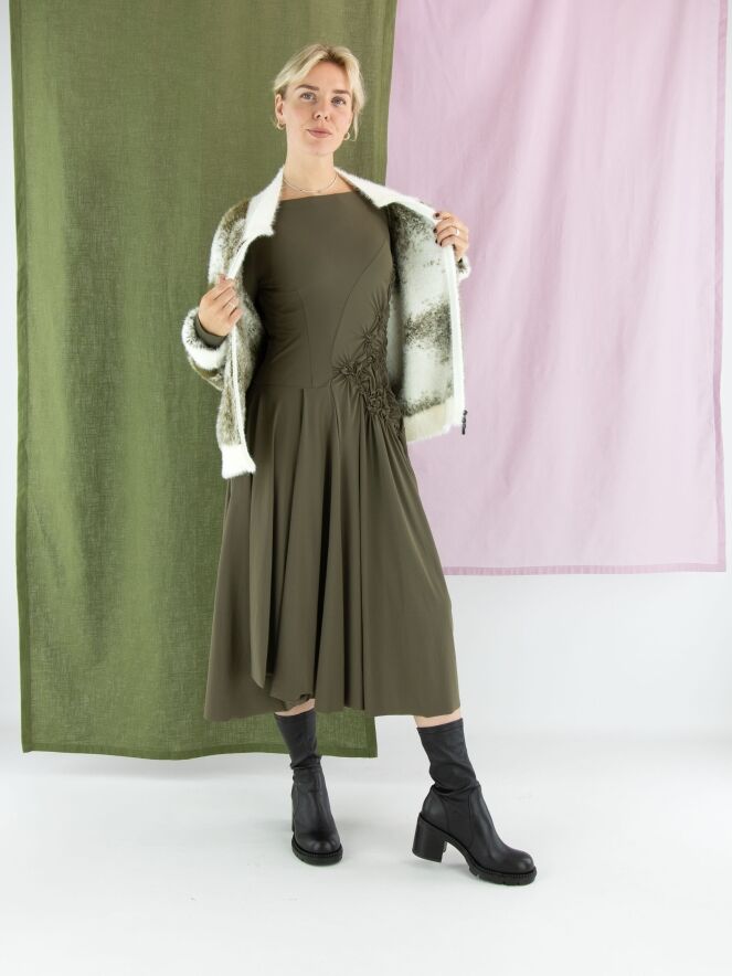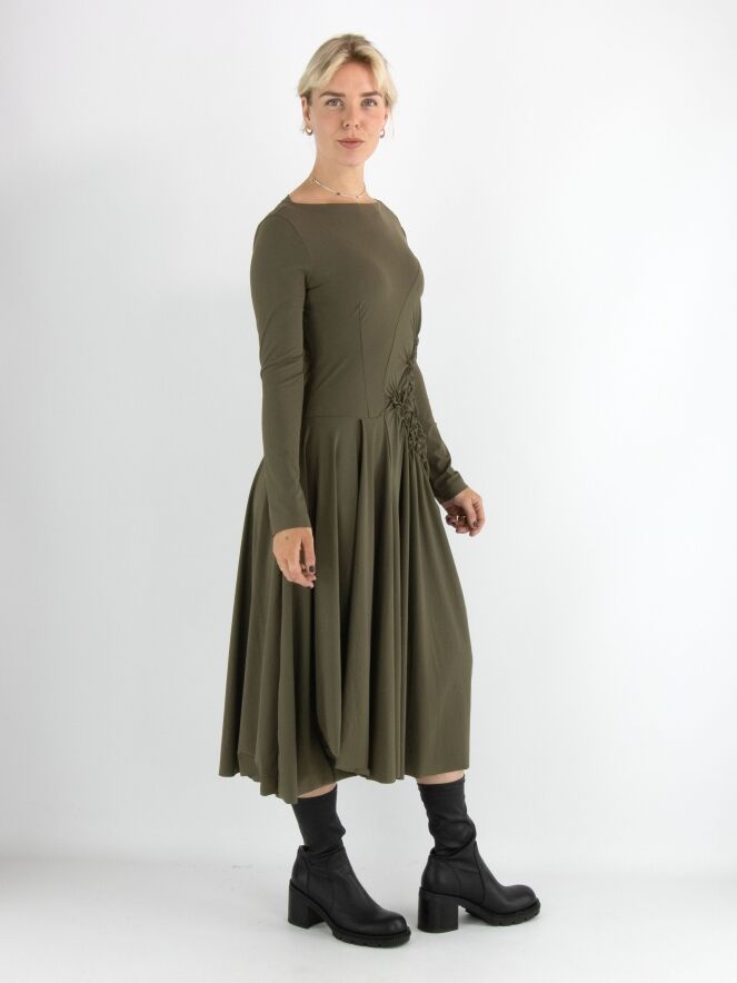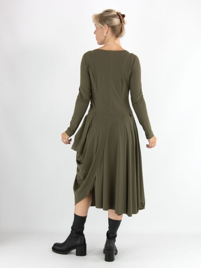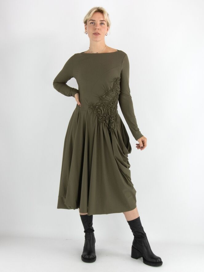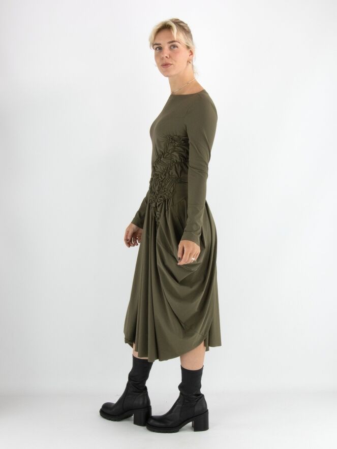 Robe de la marque High en vert olive. Elle présente un col rond et des manches longues. Le tissu est smocké du dessous de l’emmanchure gauche jusqu’à la taille. Sous cette partie smockée, une poche est intégrée au niveau de la taille. À l’arrière, quelques plis partant de la taille apportent du volume. La robe s’évase à partir de la taille. Cette robe doit être lavée à la main.