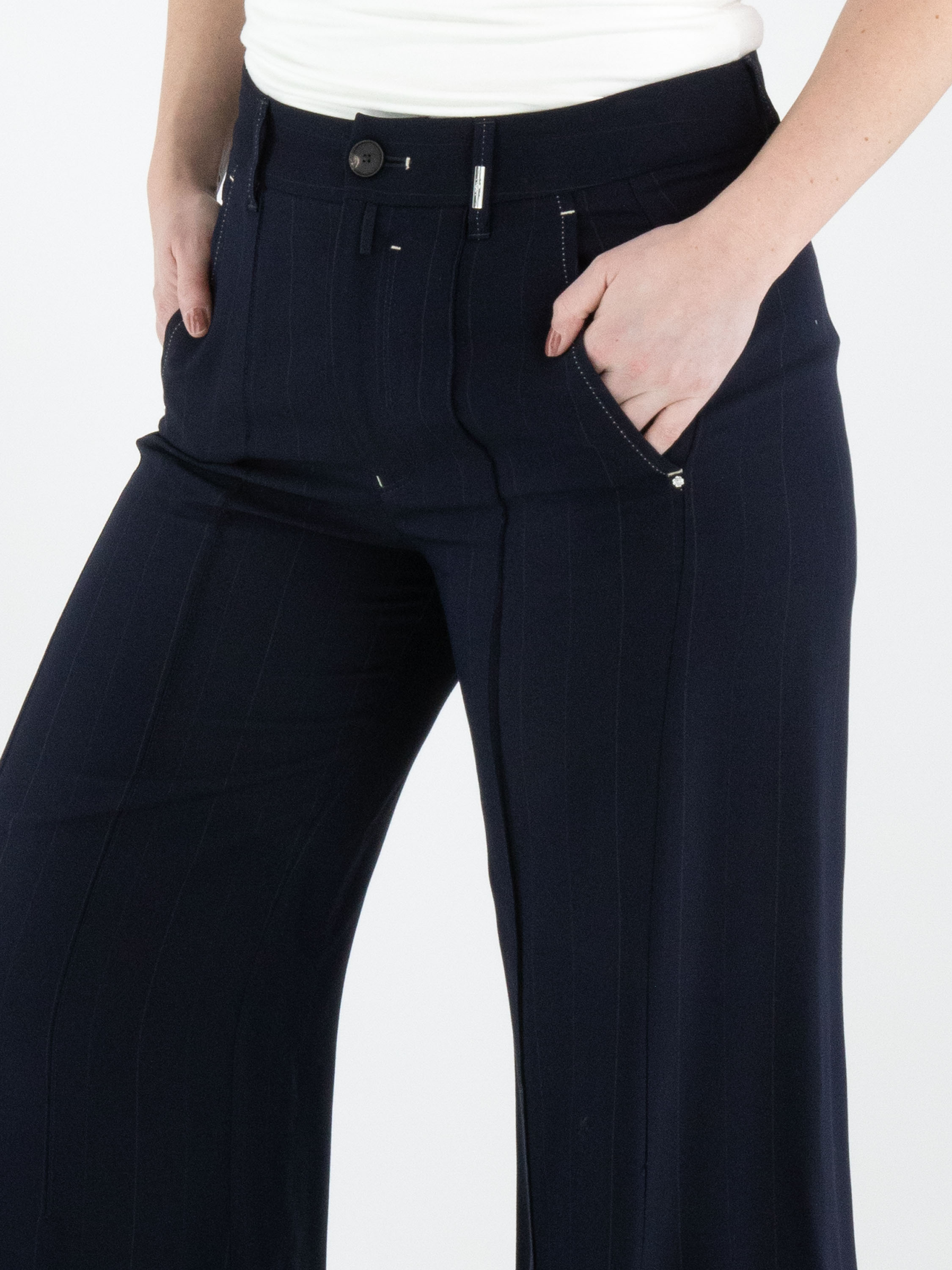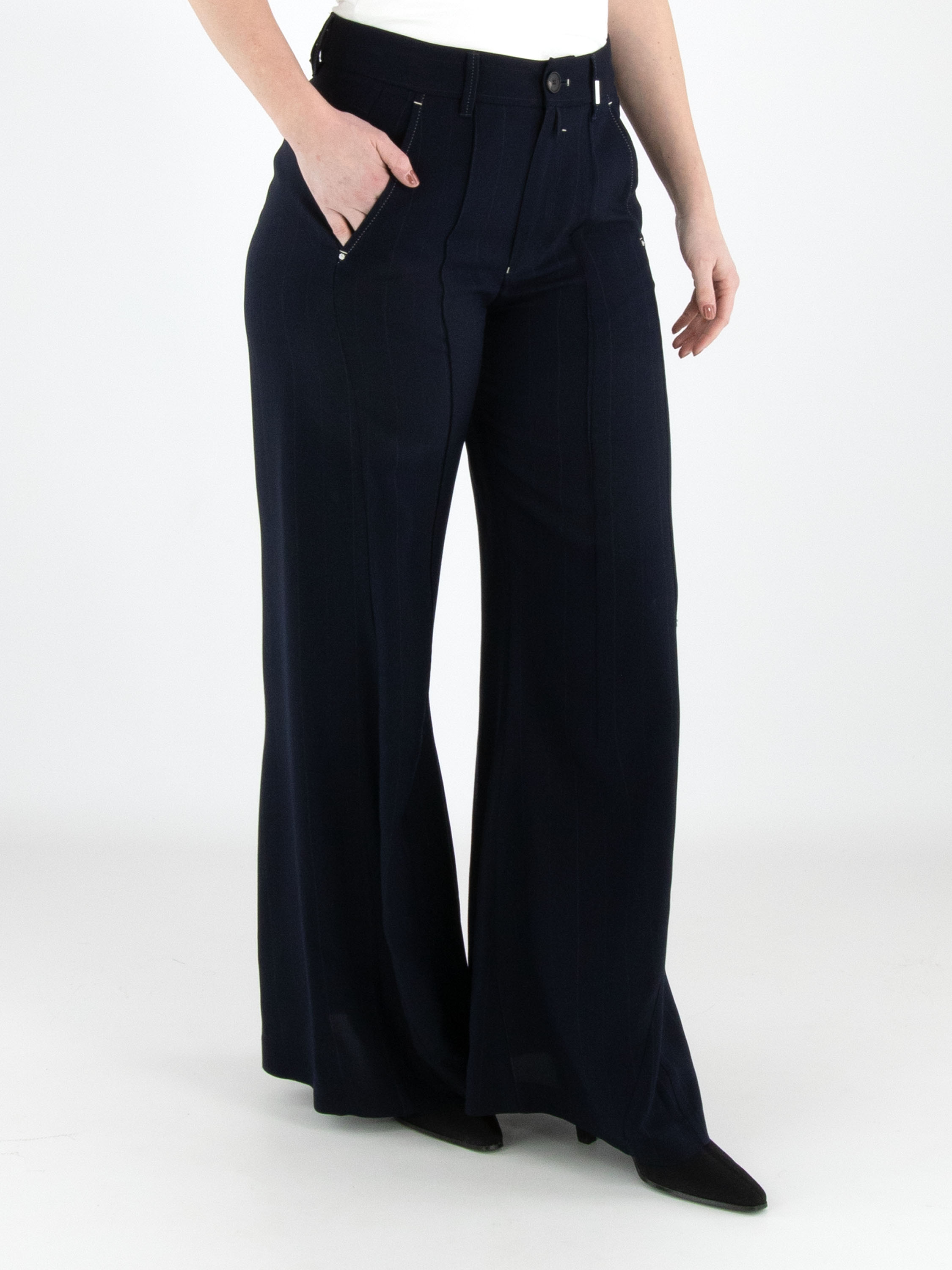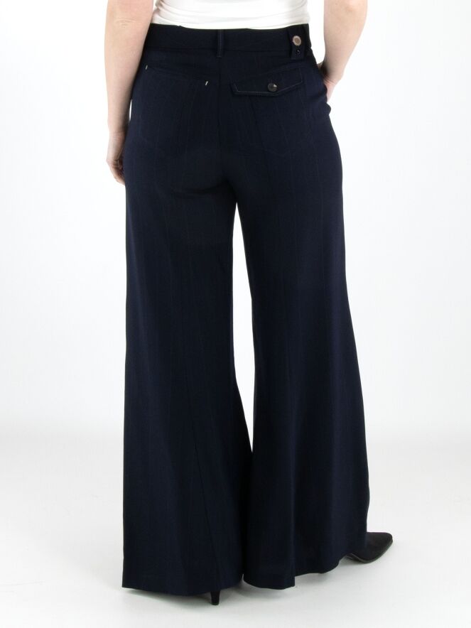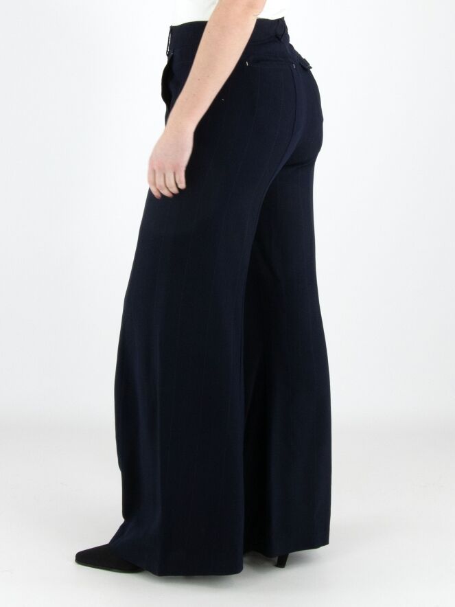 Un pantalon évasé design de High, très ample au bas des jambes. Le tissu est à fines rayures. À l’avant se trouvent une couture et une couture inversée. Le bord des poches fendues est souligné d’un fil de couture blanc. À l’arrière, le pantalon a deux poches dont une avec rabat. Ce pantalon ne doit pas être lavé.