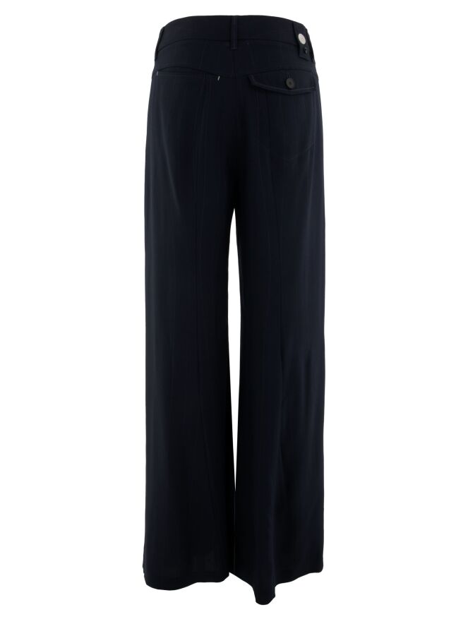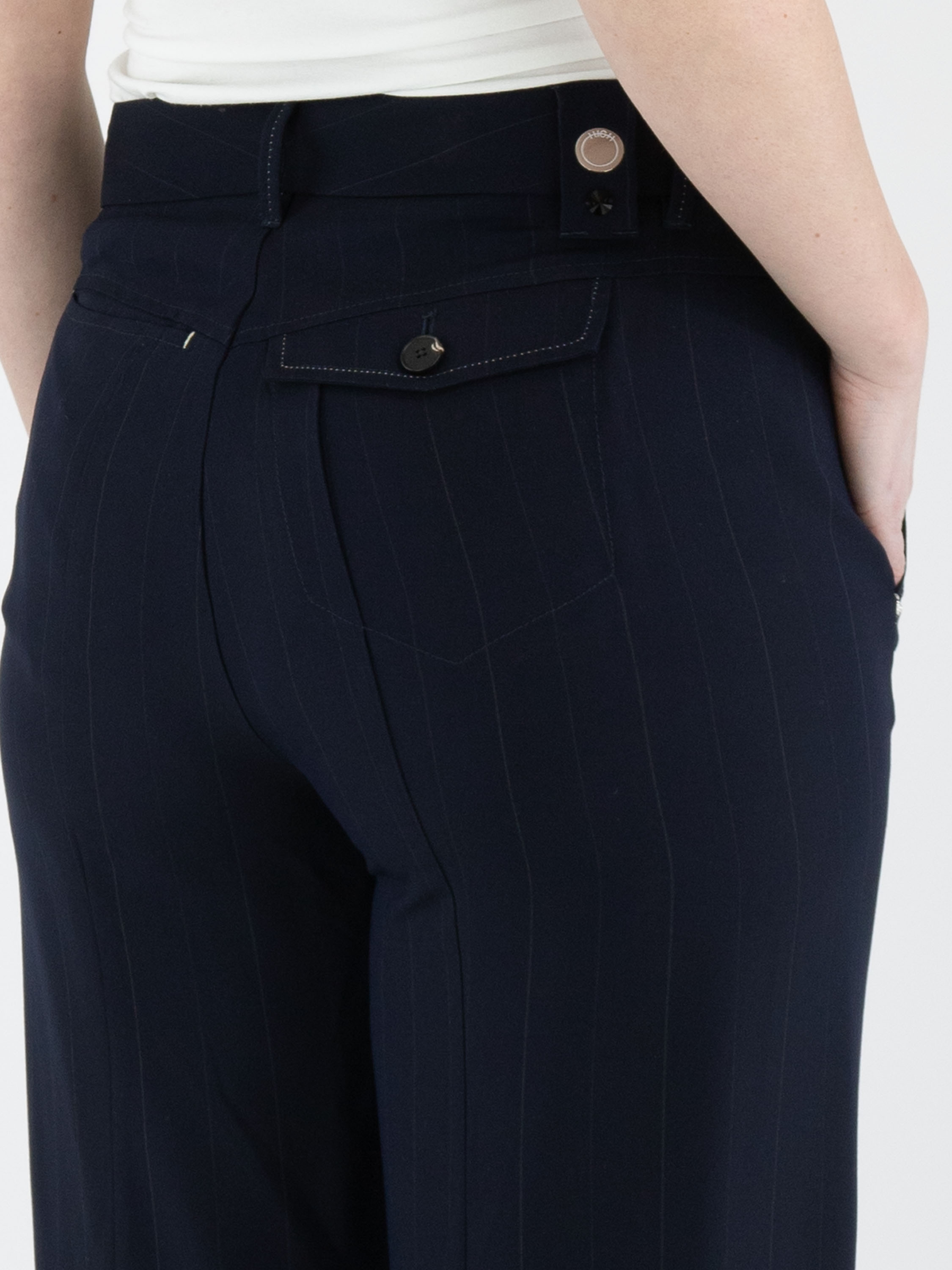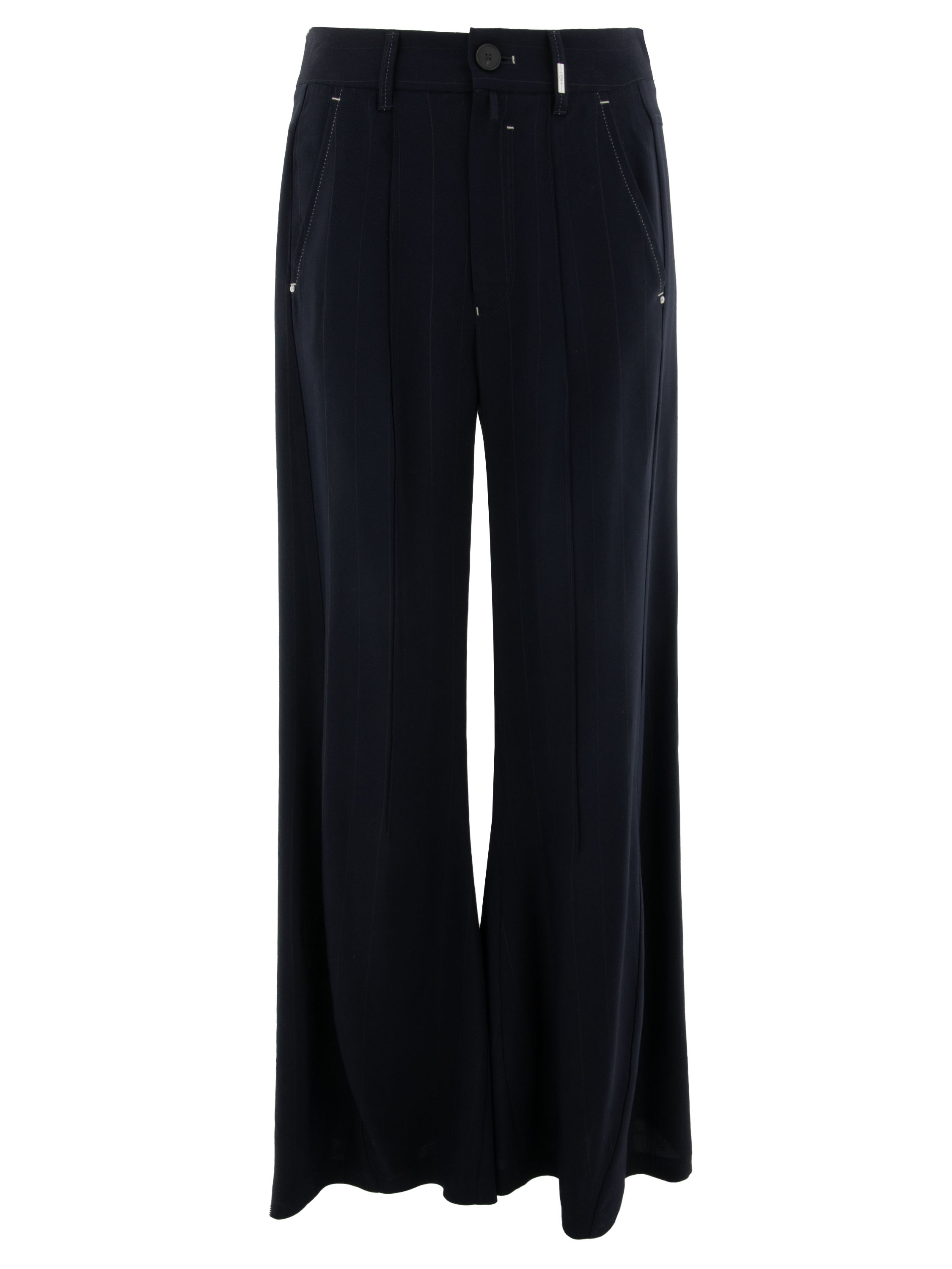 Un pantalon évasé design de High, très ample au bas des jambes. Le tissu est à fines rayures. À l’avant se trouvent une couture et une couture inversée. Le bord des poches fendues est souligné d’un fil de couture blanc. À l’arrière, le pantalon a deux poches dont une avec rabat. Ce pantalon ne doit pas être lavé.