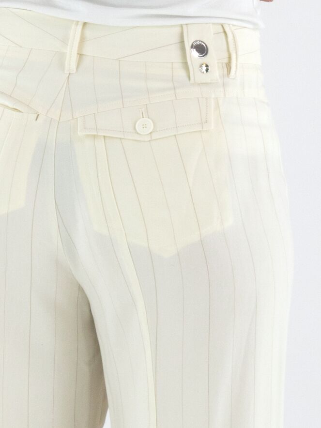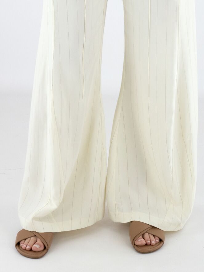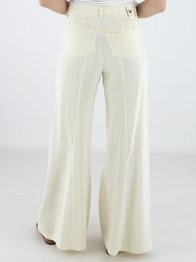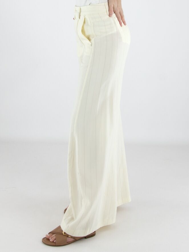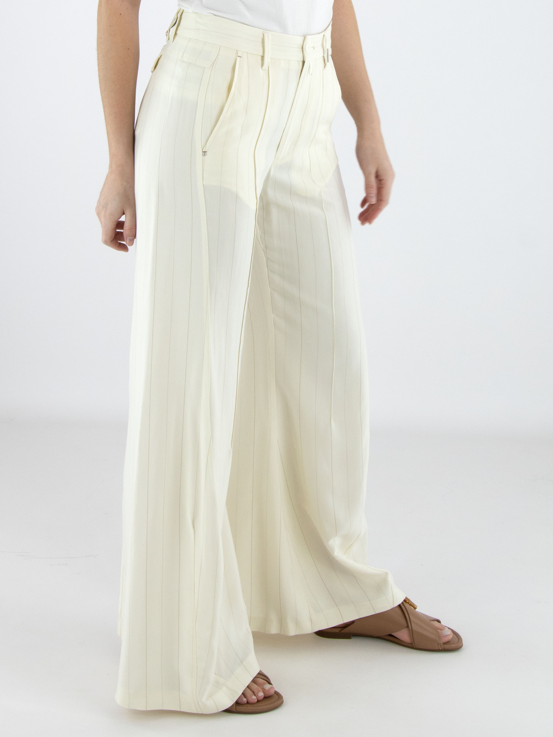 Pantalon large de High dans un motif à fines rayures craie en blanc crème et camel. Les jambes s’évasent subtilement pour créer une silhouette féminine et contemporaine. Doté de poches latérales, ce pantalon de créateur exclusif ne doit pas être lavé.