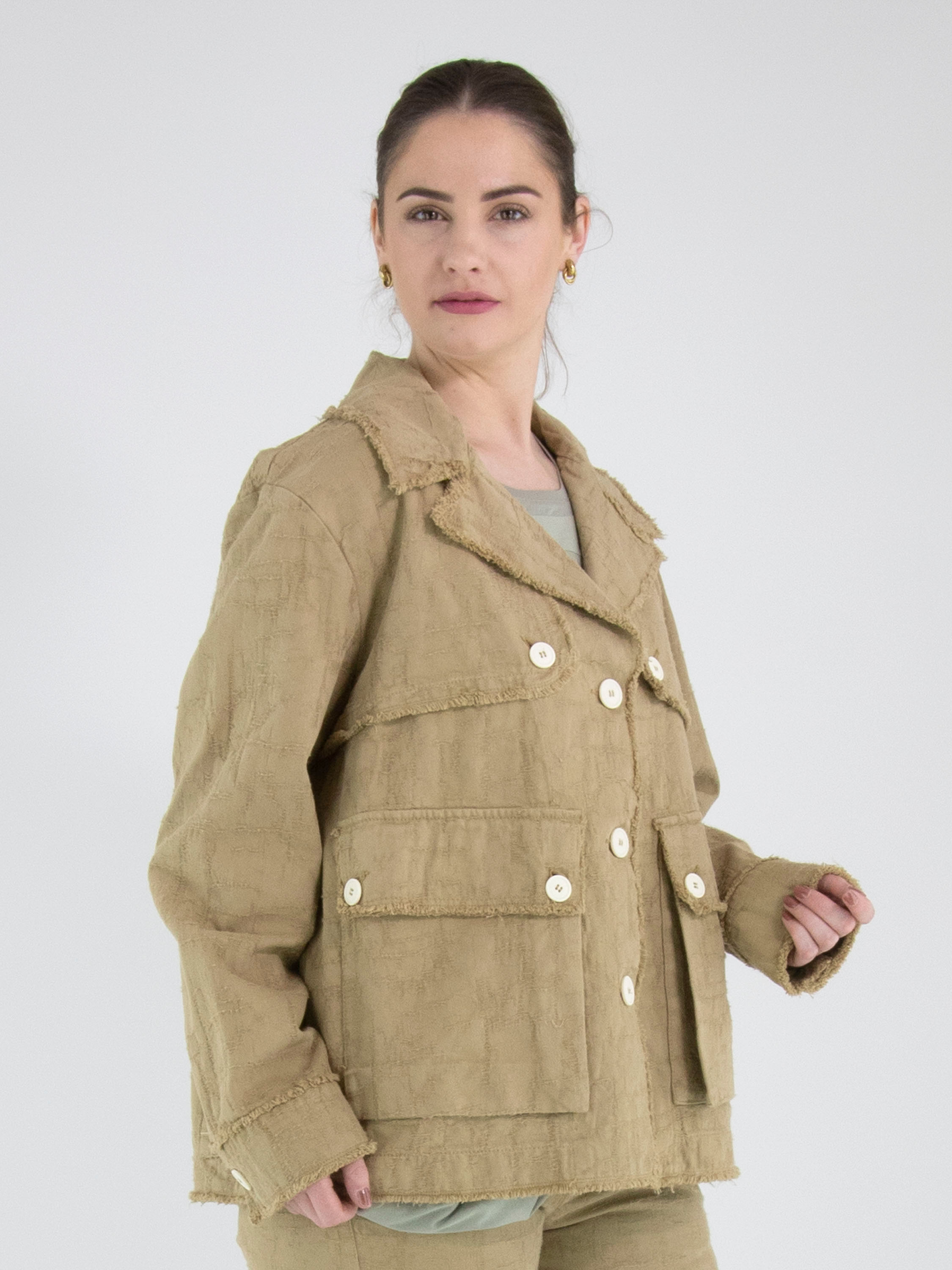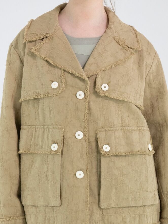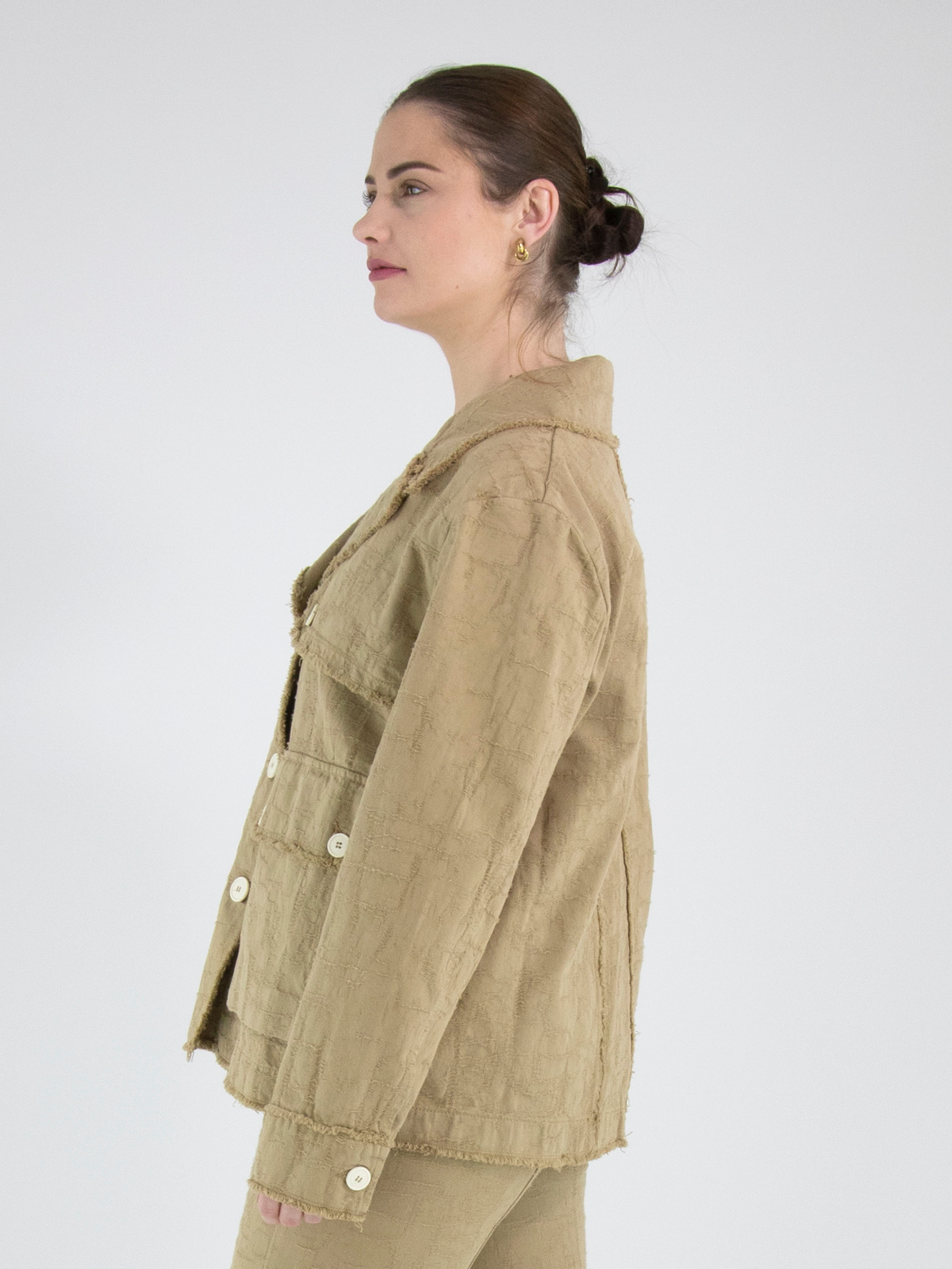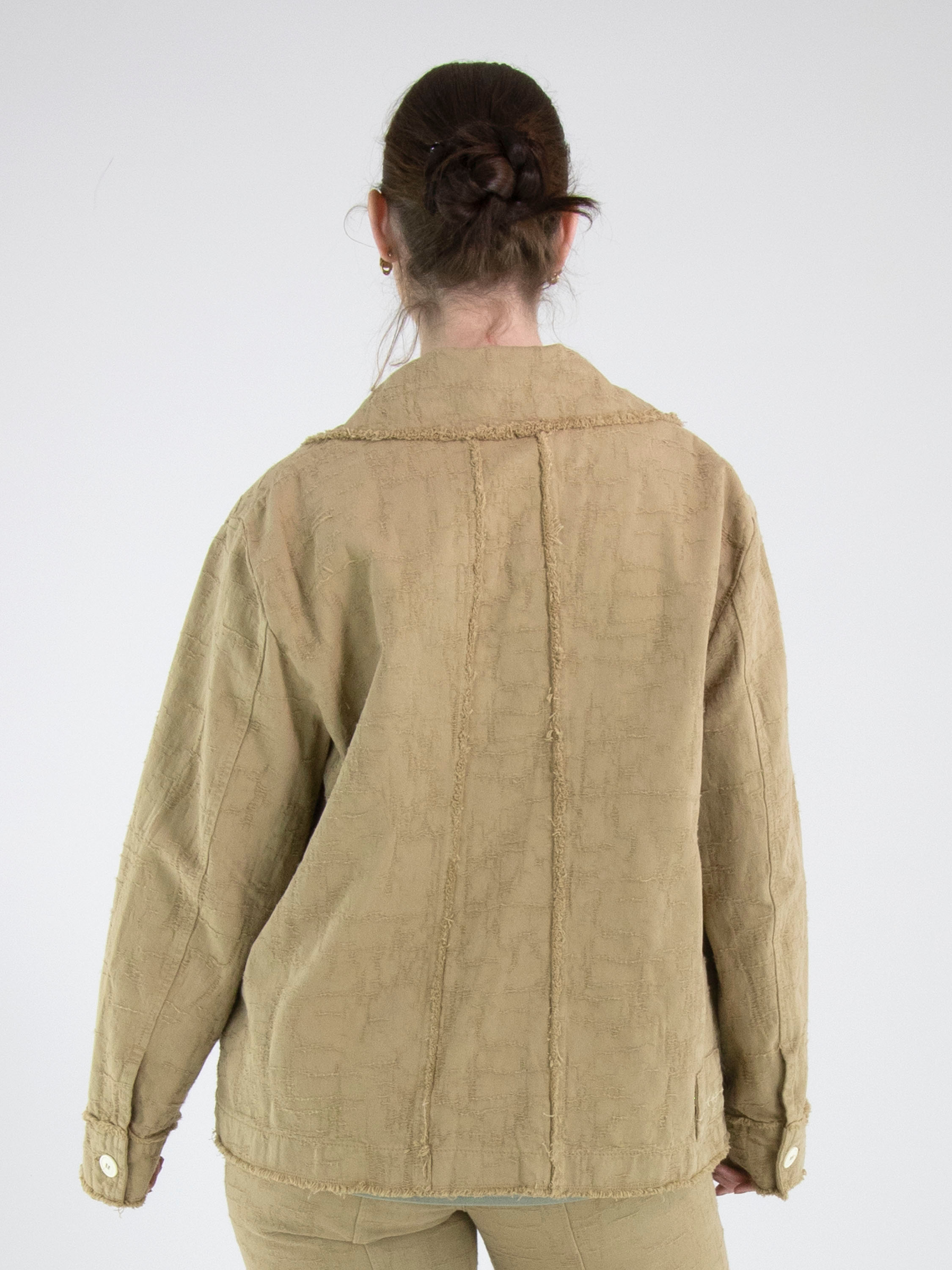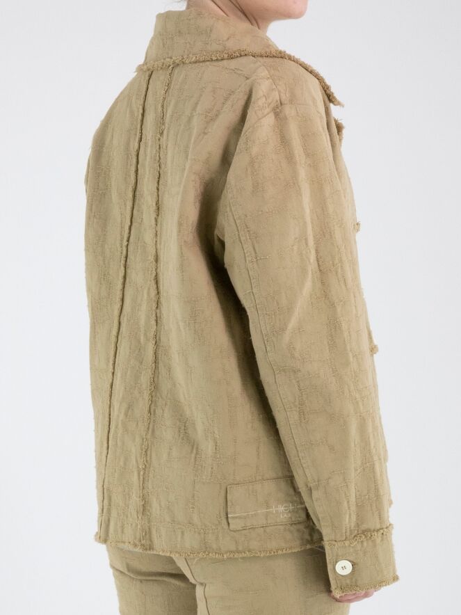Un blazer ample de High en camel. Le tissu présente une structure visible avec un aspect gabardine. Tous les bords du tissu sont finement effilochés. Le blazer est doté d’une fermeture à trois boutons blanc crème, repris également sur les poches poitrine et en détail sur la gabardine. Ce blazer peut être lavé à 30 degrés.