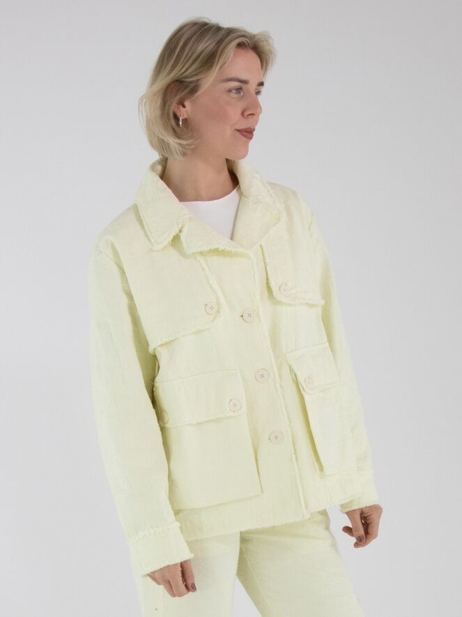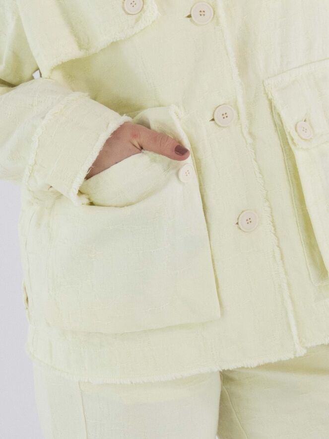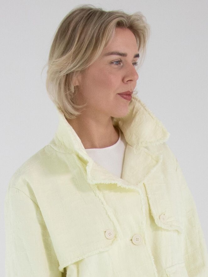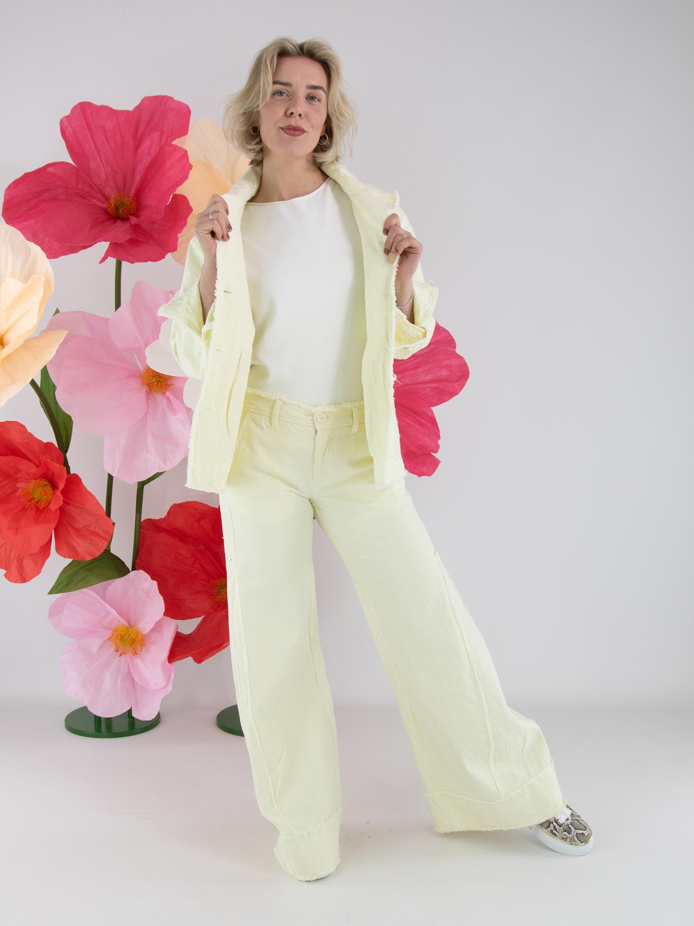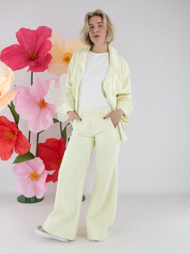Un blazer ample de High dans une teinte jaune pastel. Le tissu présente une structure visible avec un aspect gabardine. Tous les bords du tissu sont finement effilochés. Le blazer est doté d’une fermeture à trois boutons blanc crème, également repris sur les poches poitrine et en détail sur la gabardine. Ce blazer peut être lavé à 30 degrés.