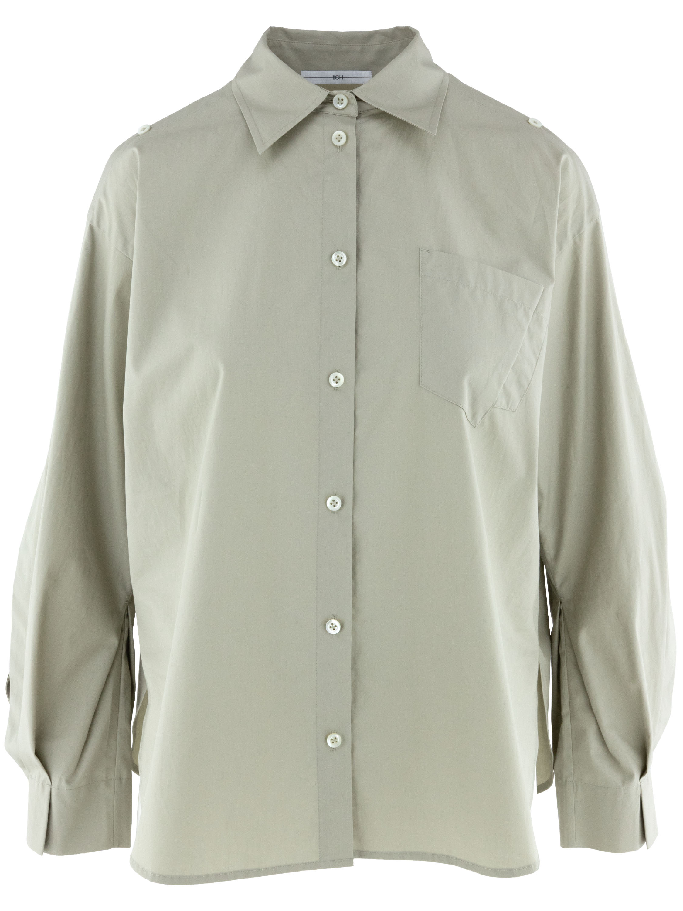 Une blouse de High dans une douce teinte vert olive. La poche poitrine présente une double couture asymétrique. Le haut des manches longues est ouvert depuis l’épaule et partiellement fermé par des boutons. Cette blouse peut être lavée à la main.