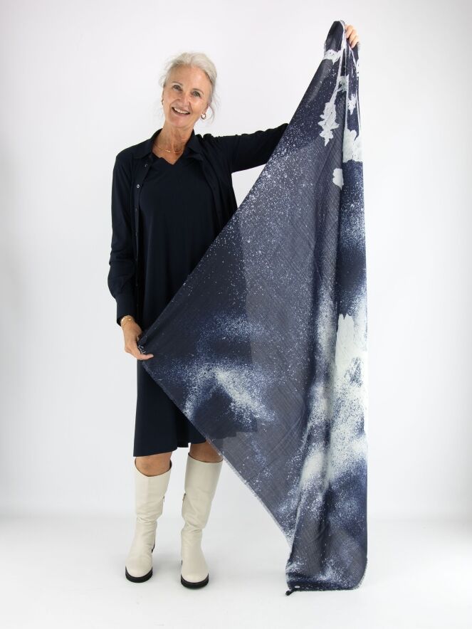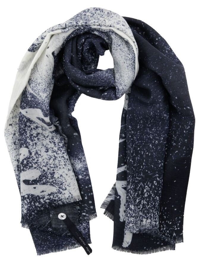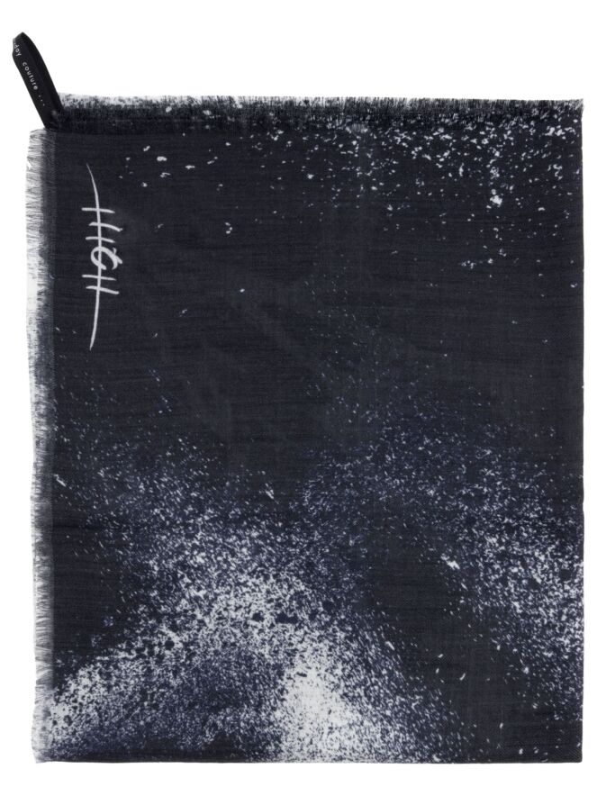 Une écharpe de la marque High avec un dégradé moucheté allant du bleu marine au blanc cassé. Les extrémités sont finement effilochées. Cette écharpe ne doit pas être lavée.
