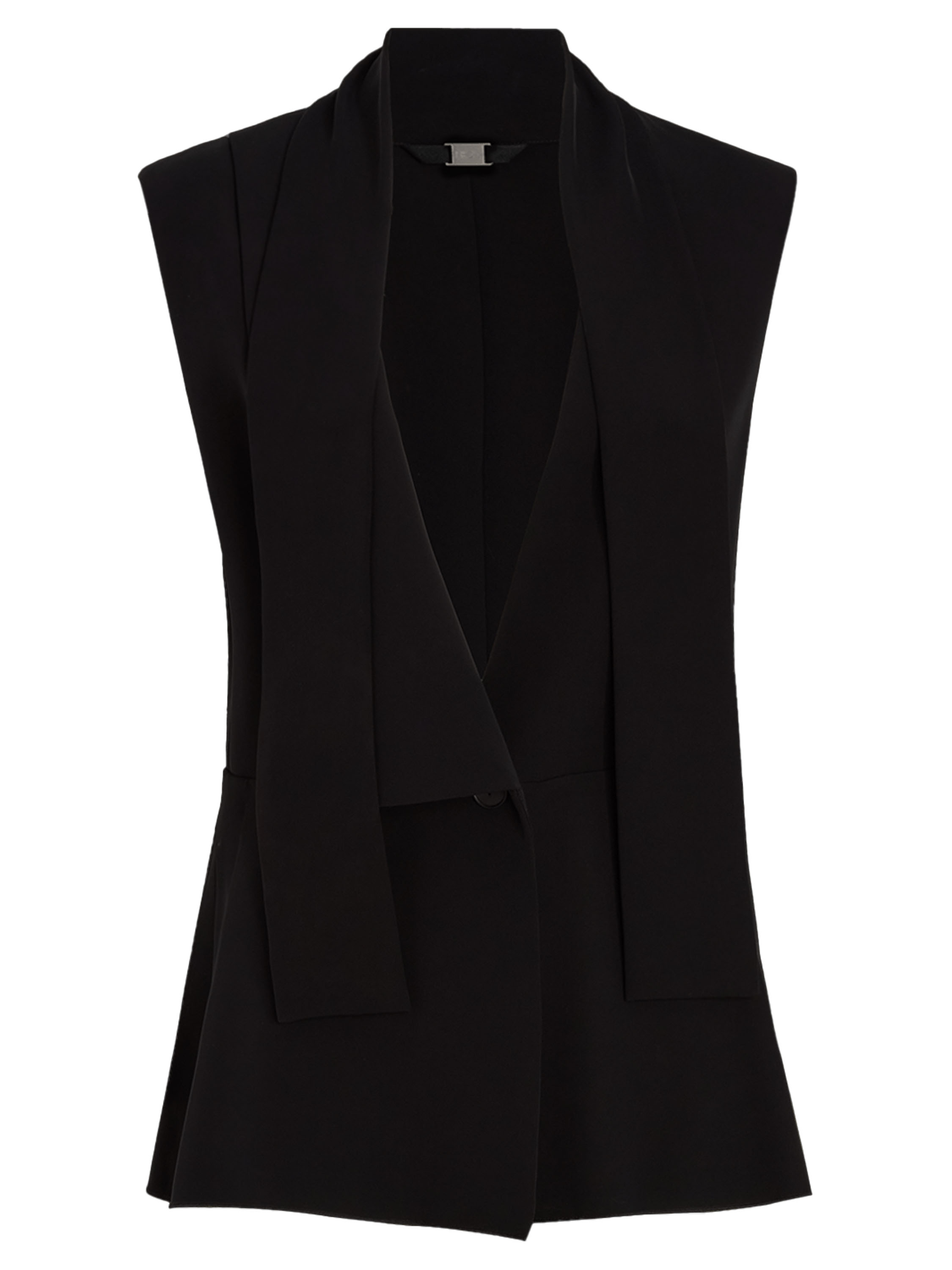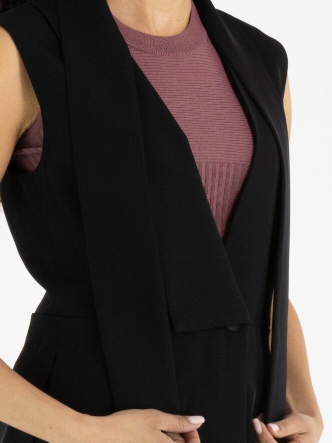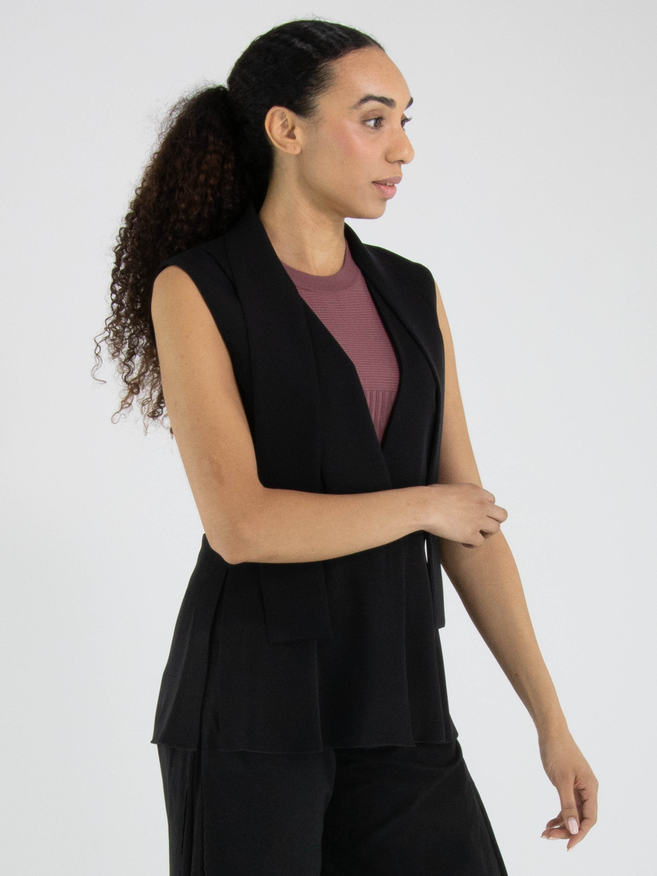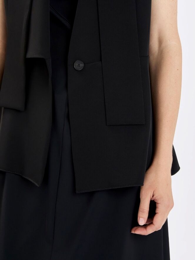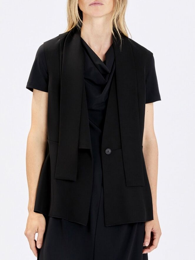 Gilet de High en noir. Le côté droit est doté d’un col, tandis que le côté gauche reste sans col, créant une allure asymétrique et contemporaine. Depuis les épaules, deux longs liens dans le même tissu tombent élégamment et évoquent visuellement un effet col châle. La fermeture se fait par un bouton unique à la taille. Des fentes latérales remontent jusqu’à la ligne de taille pour plus de liberté de mouvement. Ce gilet de créateur exclusif peut être lavé à 30 degrés.