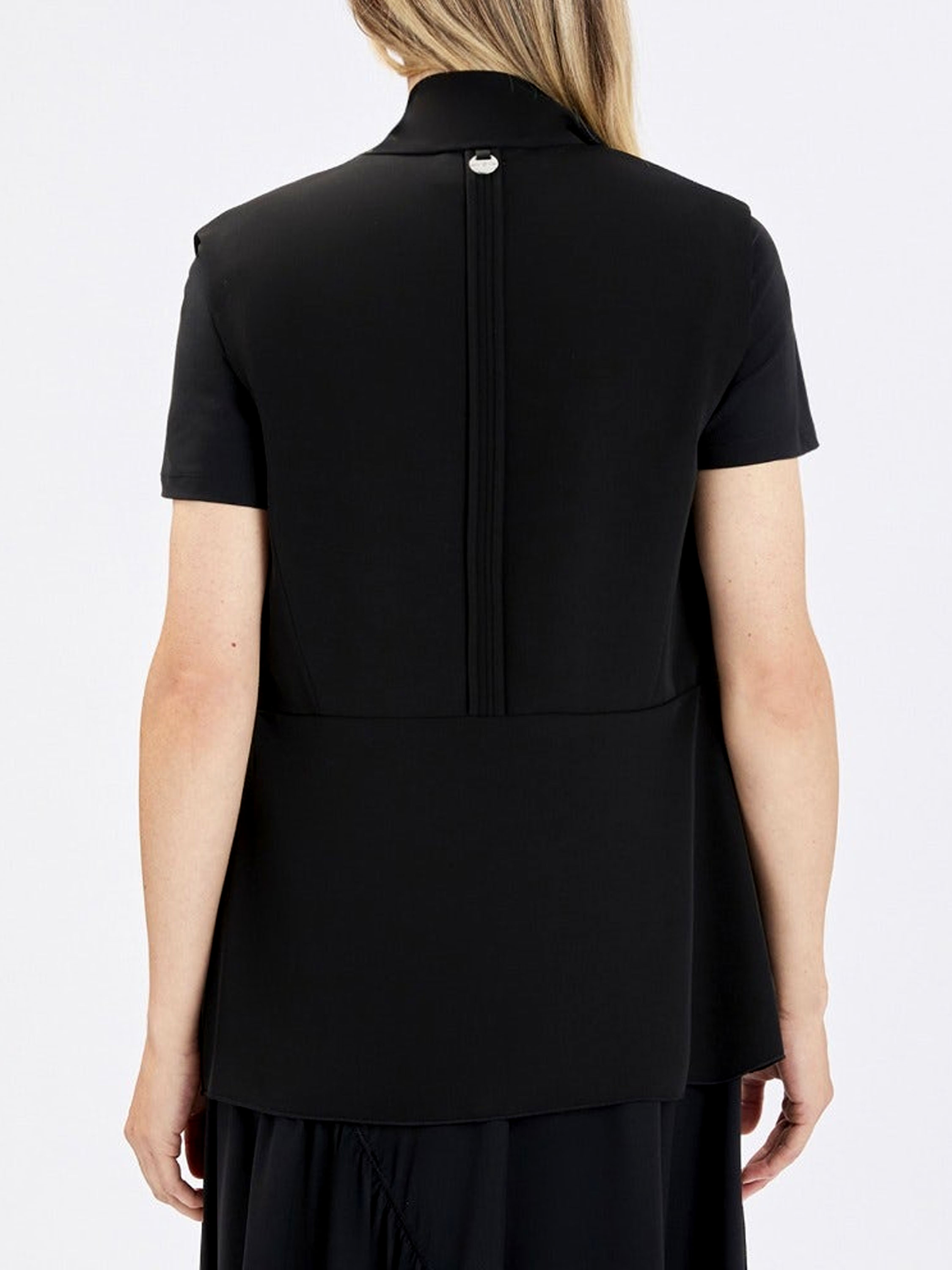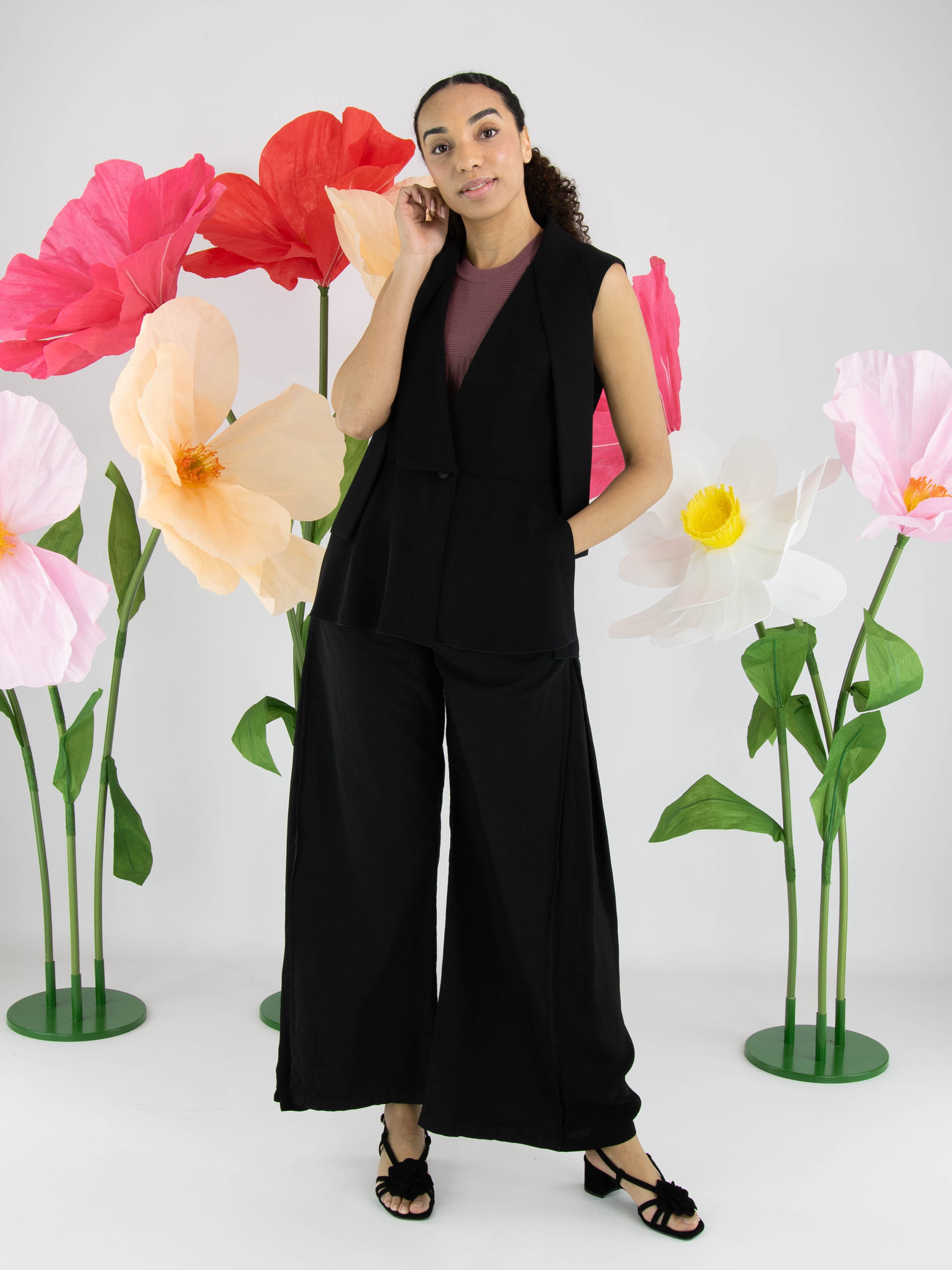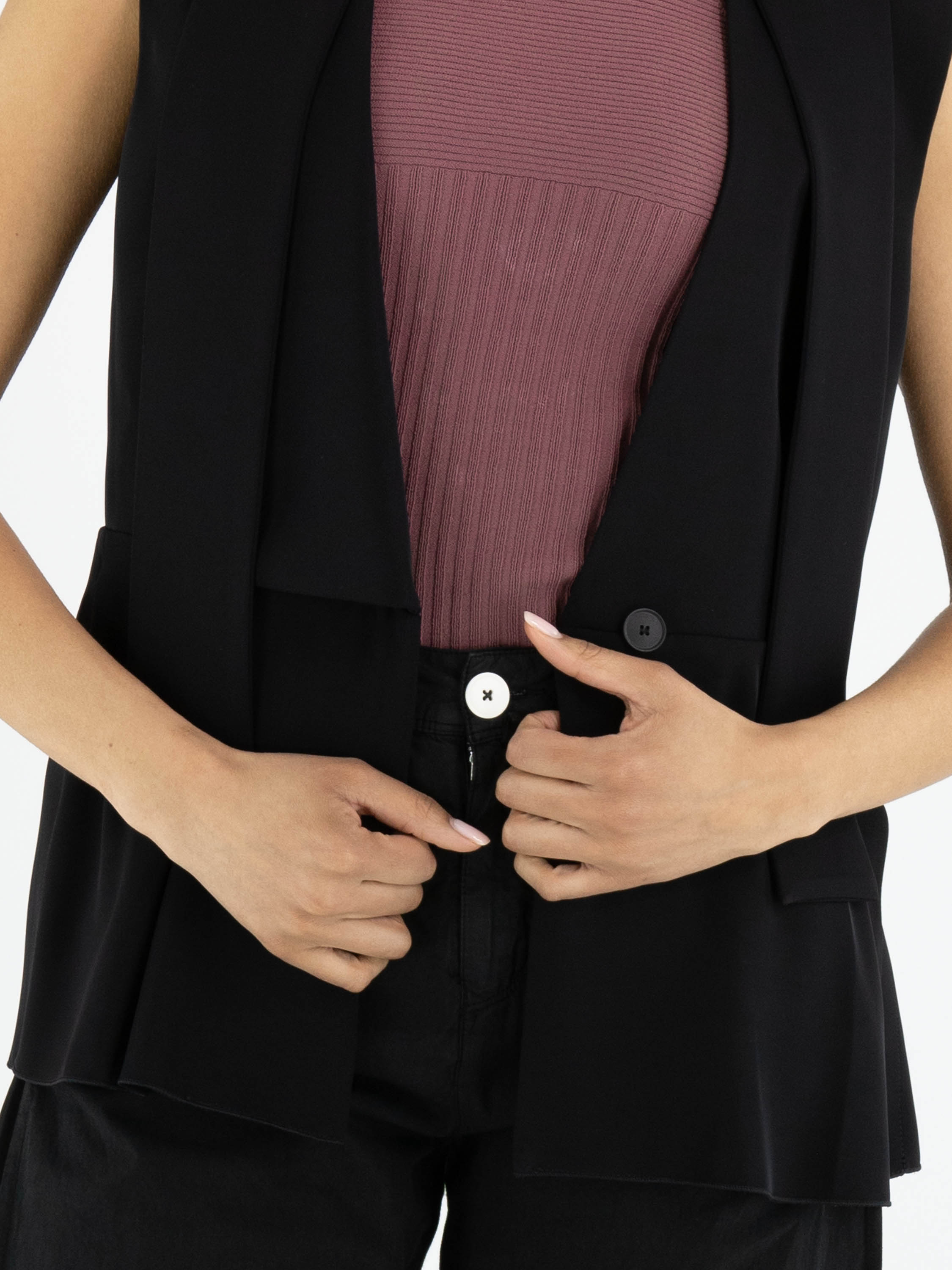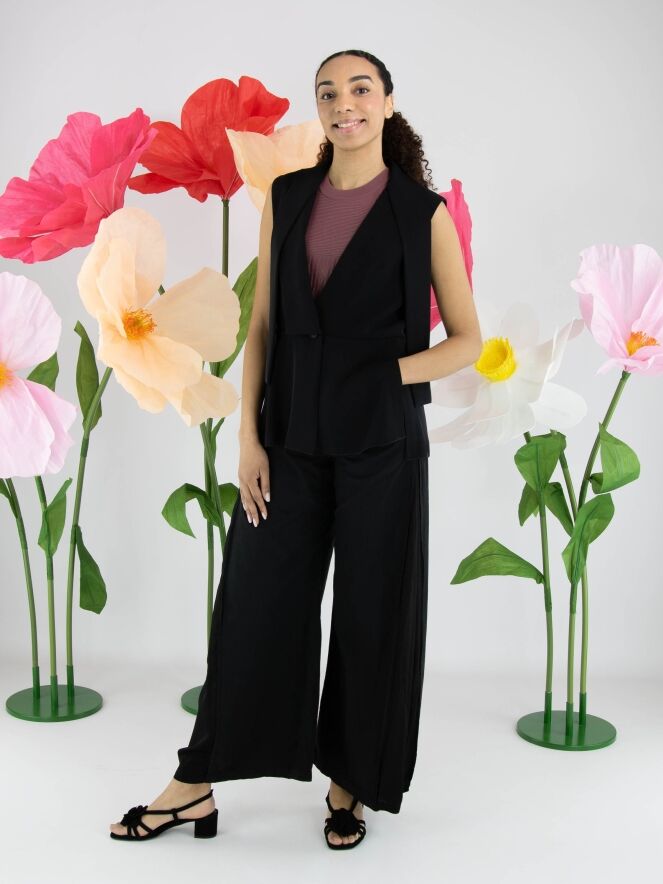 Gilet de High en noir. Le côté droit est doté d’un col, tandis que le côté gauche reste sans col, créant une allure asymétrique et contemporaine. Depuis les épaules, deux longs liens dans le même tissu tombent élégamment et évoquent visuellement un effet col châle. La fermeture se fait par un bouton unique à la taille. Des fentes latérales remontent jusqu’à la ligne de taille pour plus de liberté de mouvement. Ce gilet de créateur exclusif peut être lavé à 30 degrés.