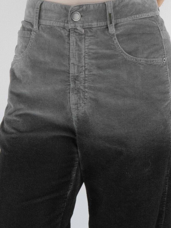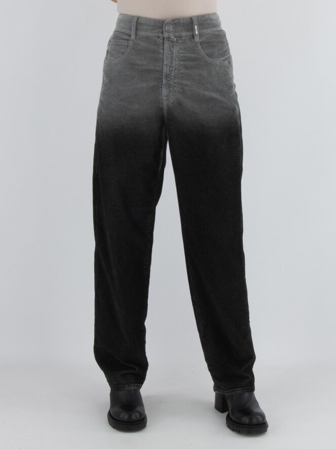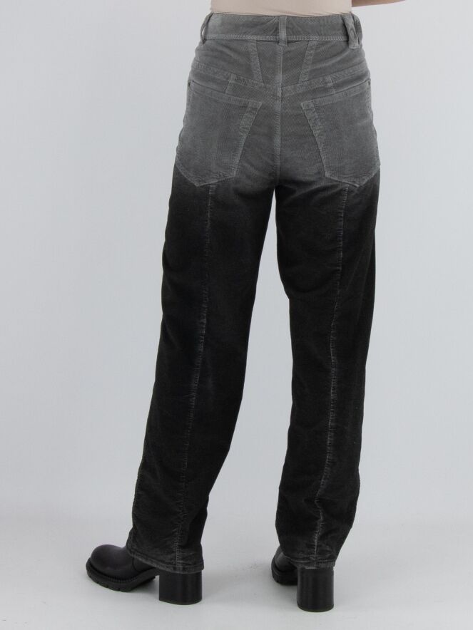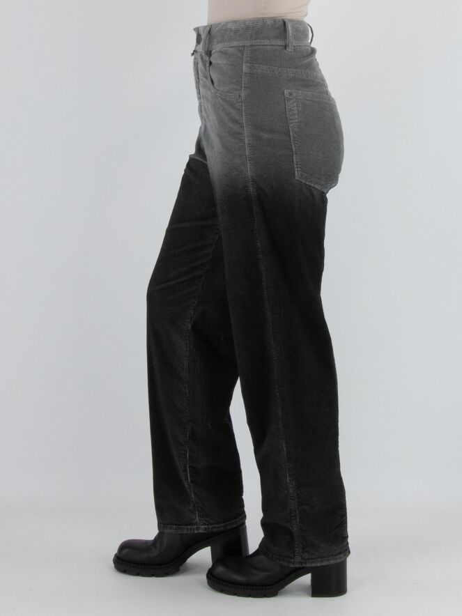 Pantalon en velours côtelé de la marque High, avec un dégradé de gris vers anthracite. Confectionné dans une coupe classique 5 poches. Ce pantalon doit être lavé à la main.