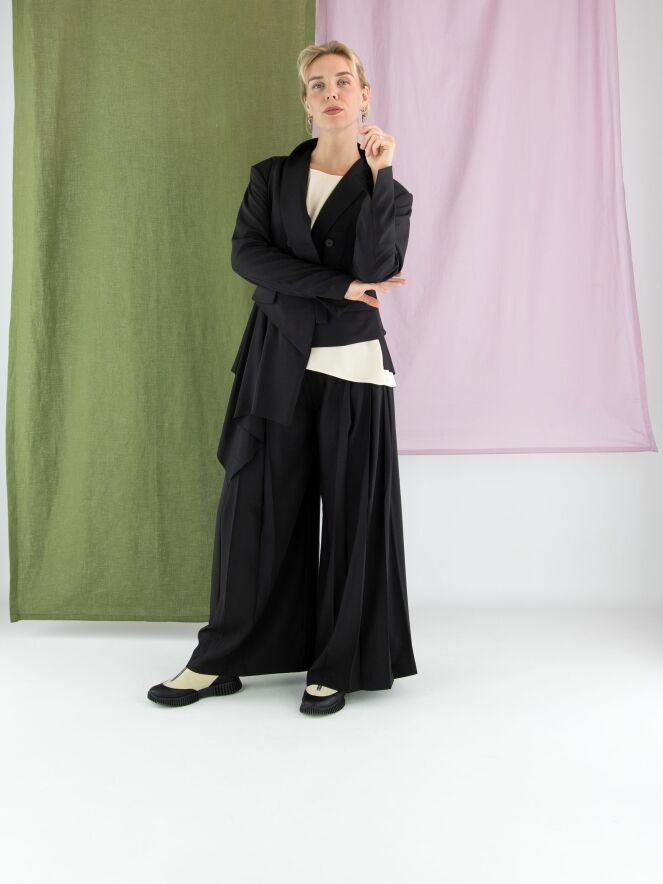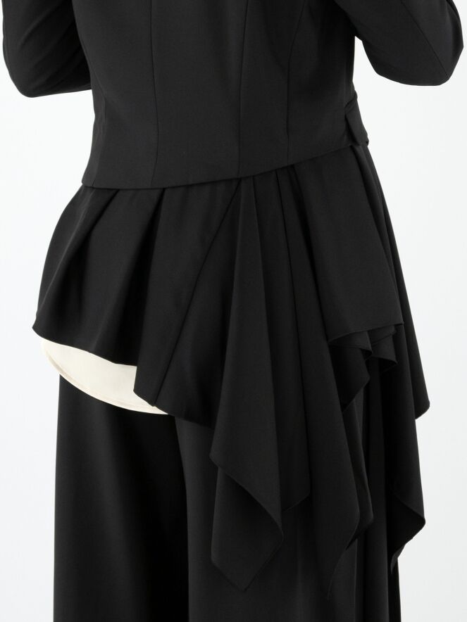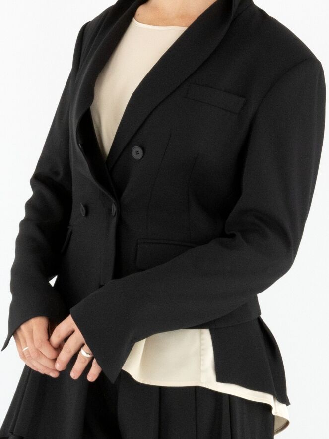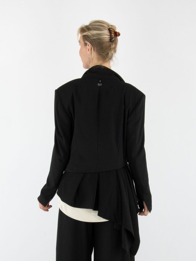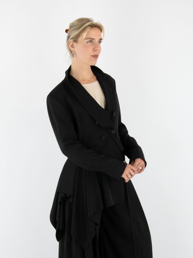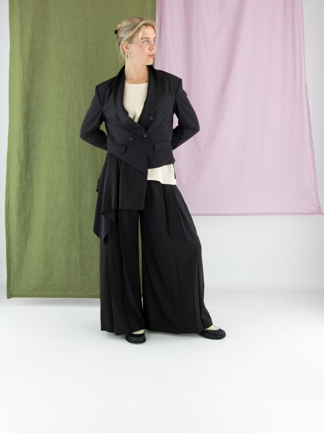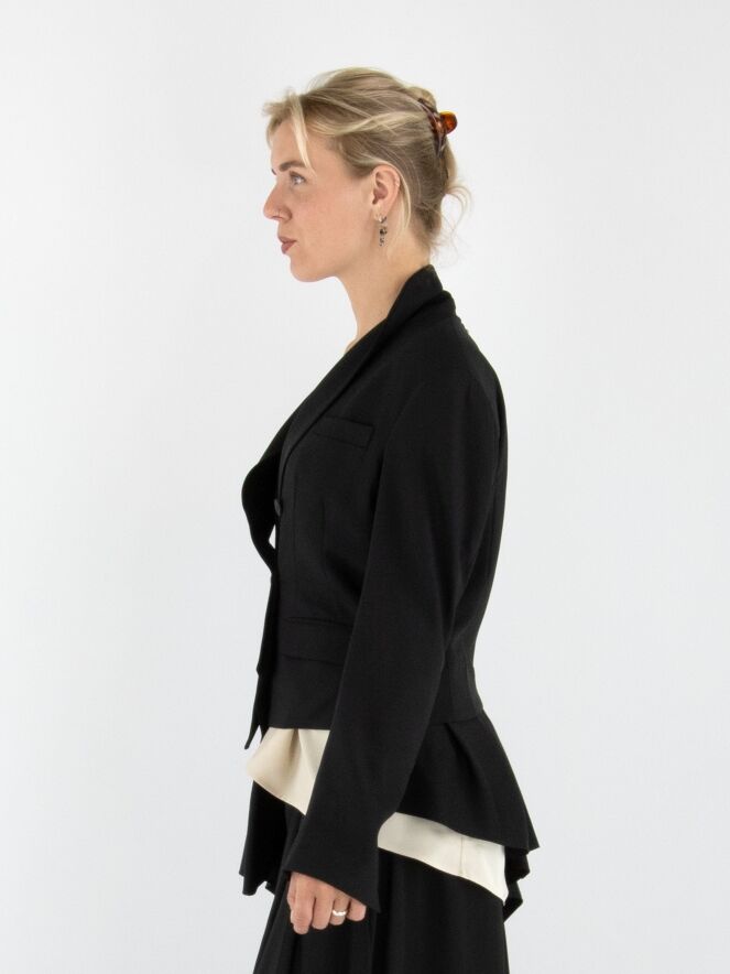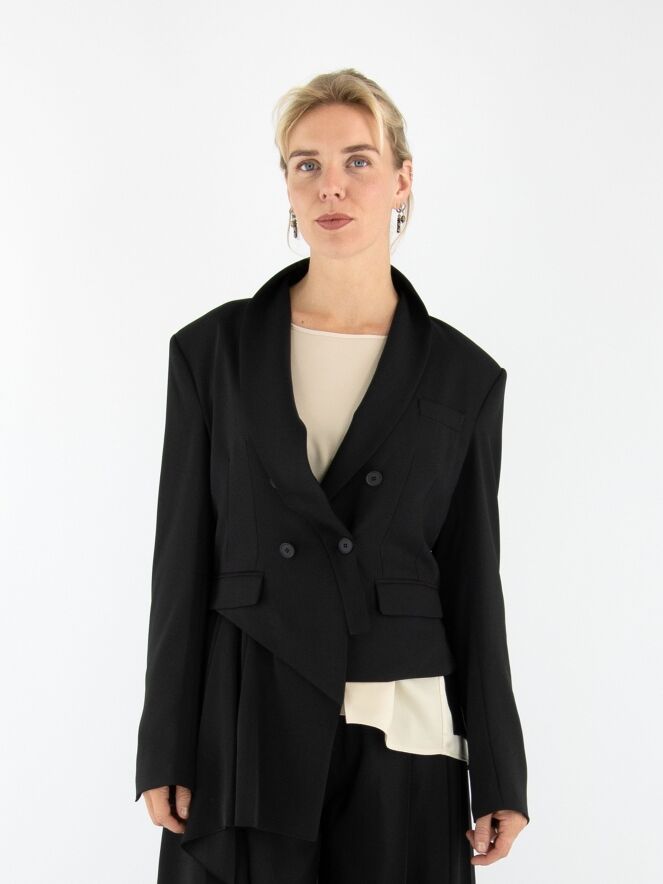 Blazer court croisé de la marque High en noir. Le revers droit du col est partiellement détaché de la veste et fixé au niveau de la fermeture croisée. Sur le bas droit, un empiècement en satin mat traverse en diagonale depuis le côté droit, passant par le dos jusqu’au côté gauche. Le blazer est entièrement doublé et ne doit pas être lavé.