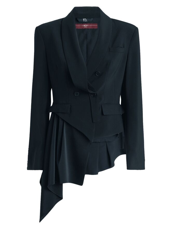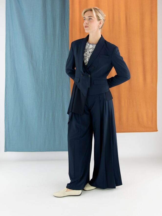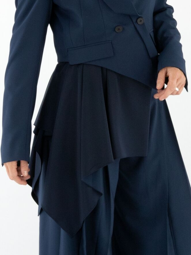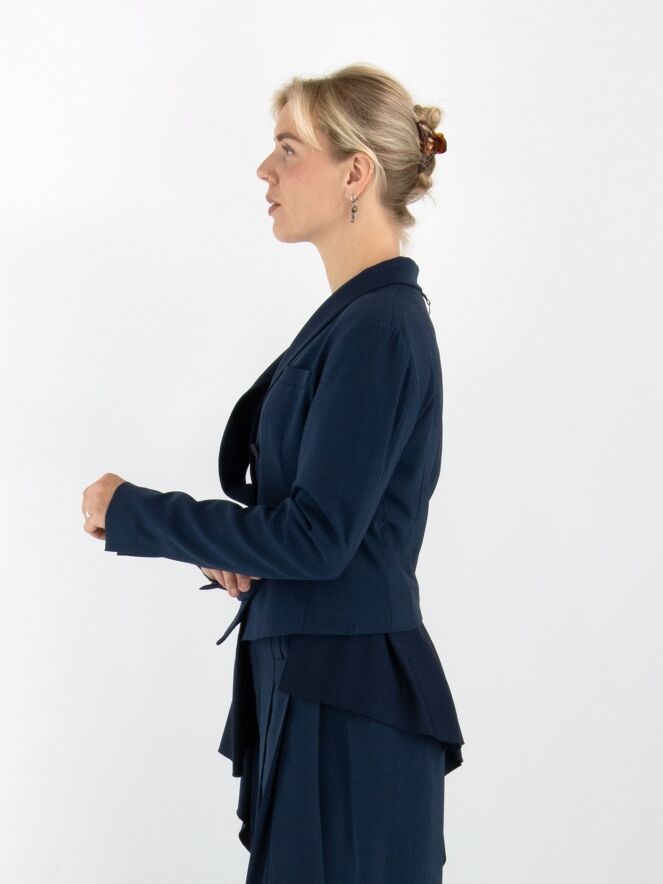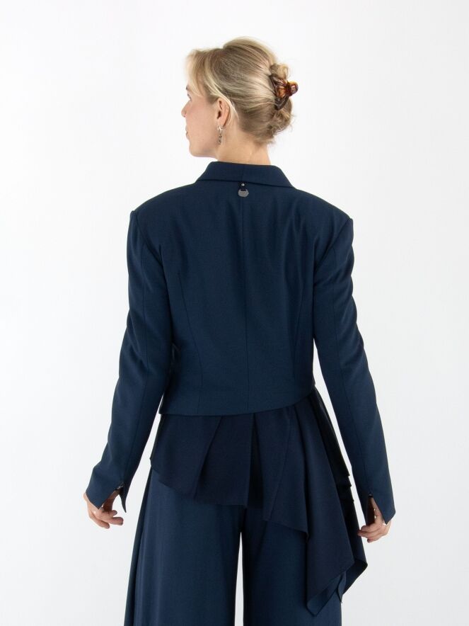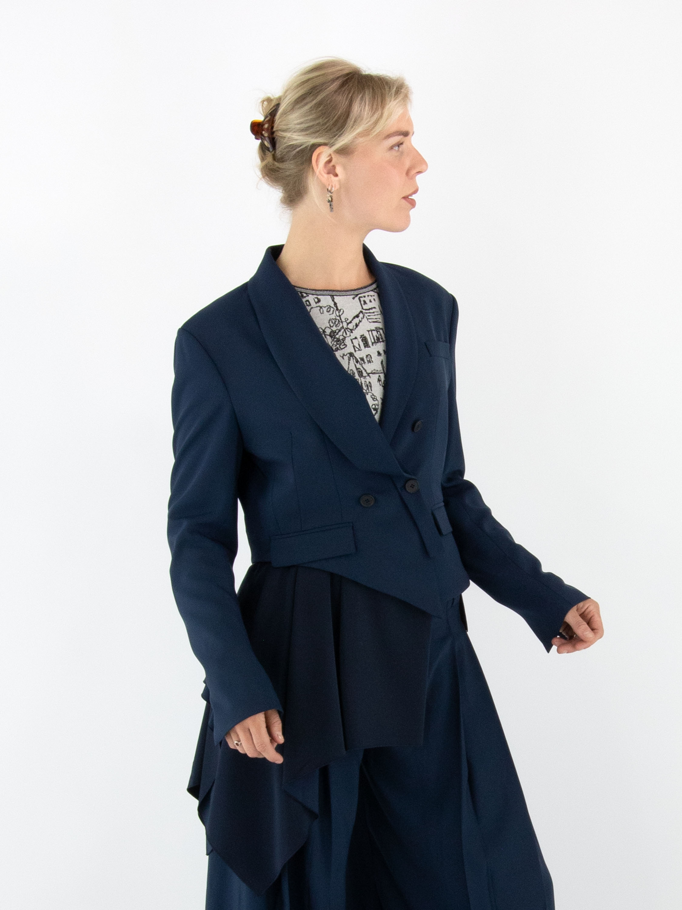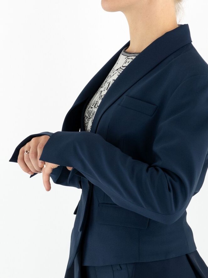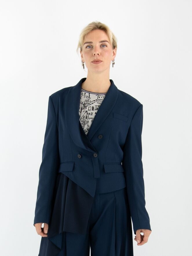 Blazer court croisé de High en bleu nuit. Le revers droit du col est partiellement détaché et fixé au niveau de la fermeture, créant un effet design raffiné. Dans la partie inférieure droite, une incrustation en satin mat traverse en diagonale du côté droit au dos jusqu’au côté gauche. Le blazer est entièrement doublé et ne peut pas être lavé.