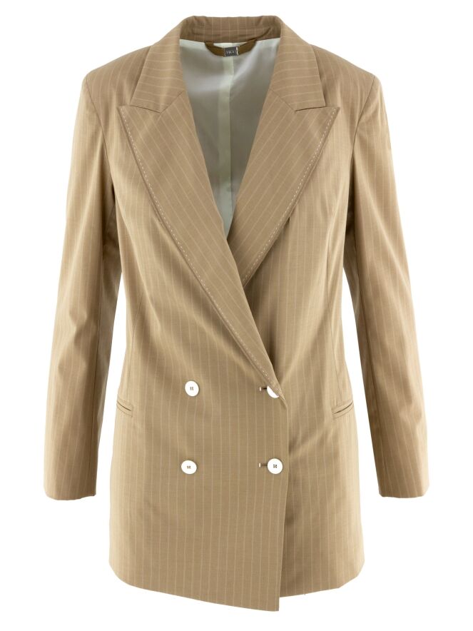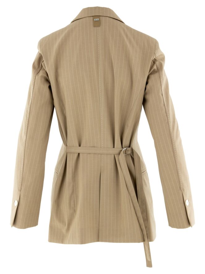 Un blazer croisé de High à structure à fines rayures craie de couleur camel. Un fil de couture décoratif blanc longe les bords des revers ainsi que le centre du dos. Le blazer est doté de boutons blanc cassé et est entièrement doublé. À l’arrière, à hauteur de la taille, se trouve une patte dans le même tissu que le blazer, avec une boucle argentée permettant de créer une silhouette légèrement cintrée si souhaité. Ce blazer ne doit pas être lavé.