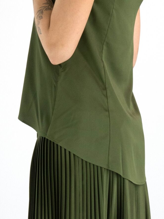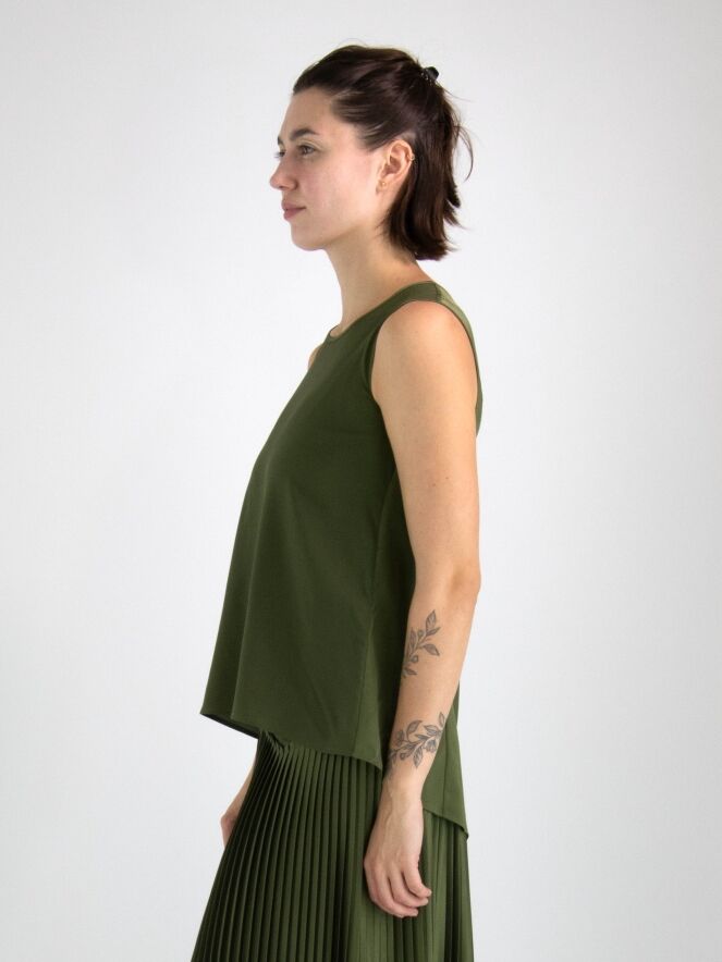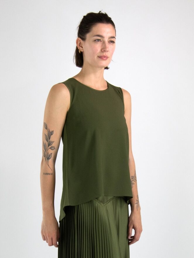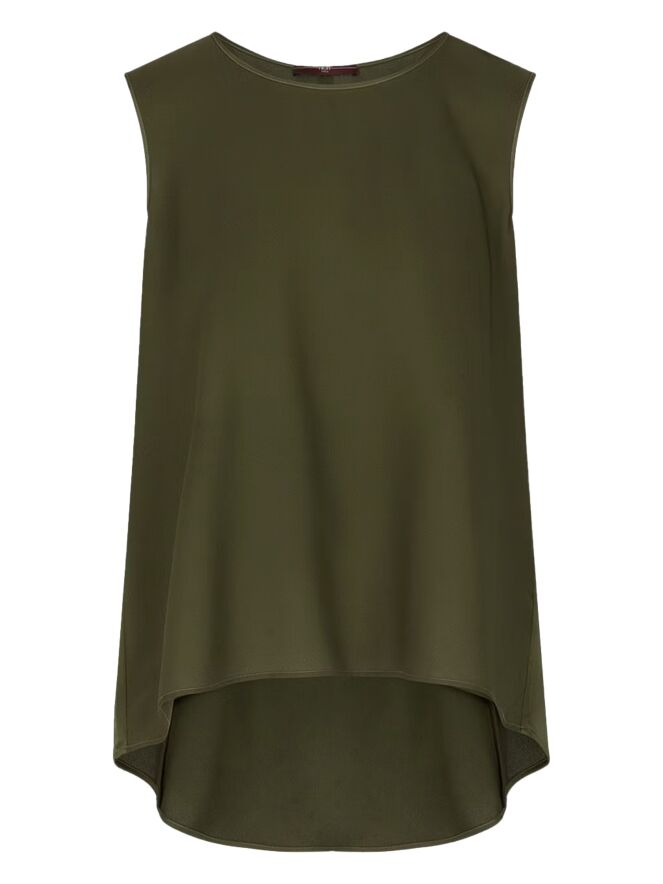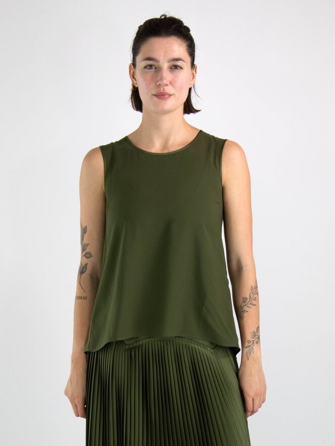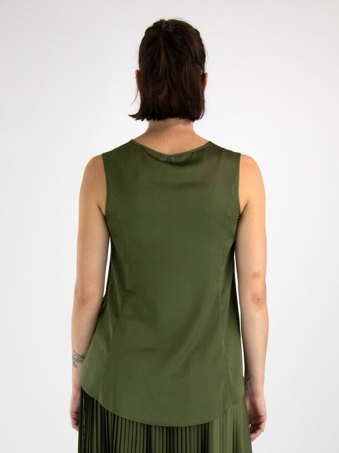 Un top de High en vert olive. Le top a un col rond et une légère forme en A. Le devant est mat et l'arrière est en satin mat. Ce top peut être lavé à la main.