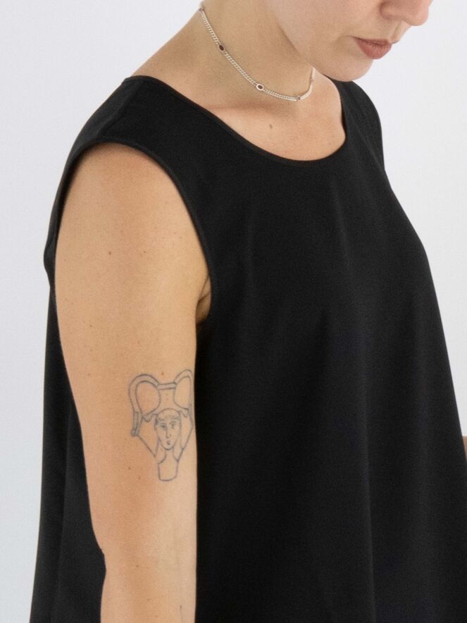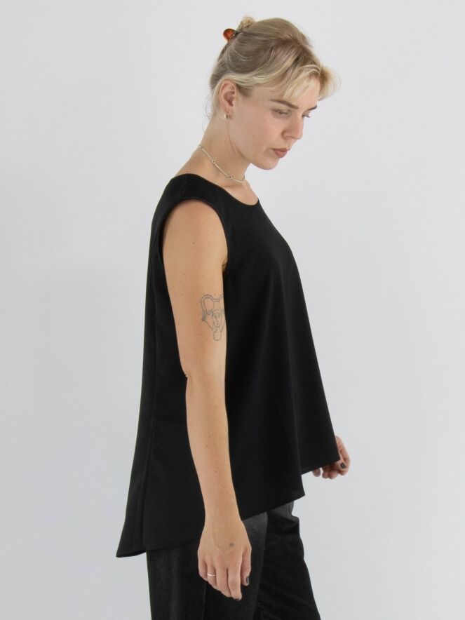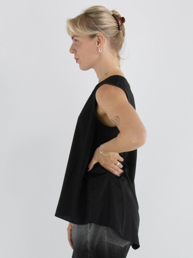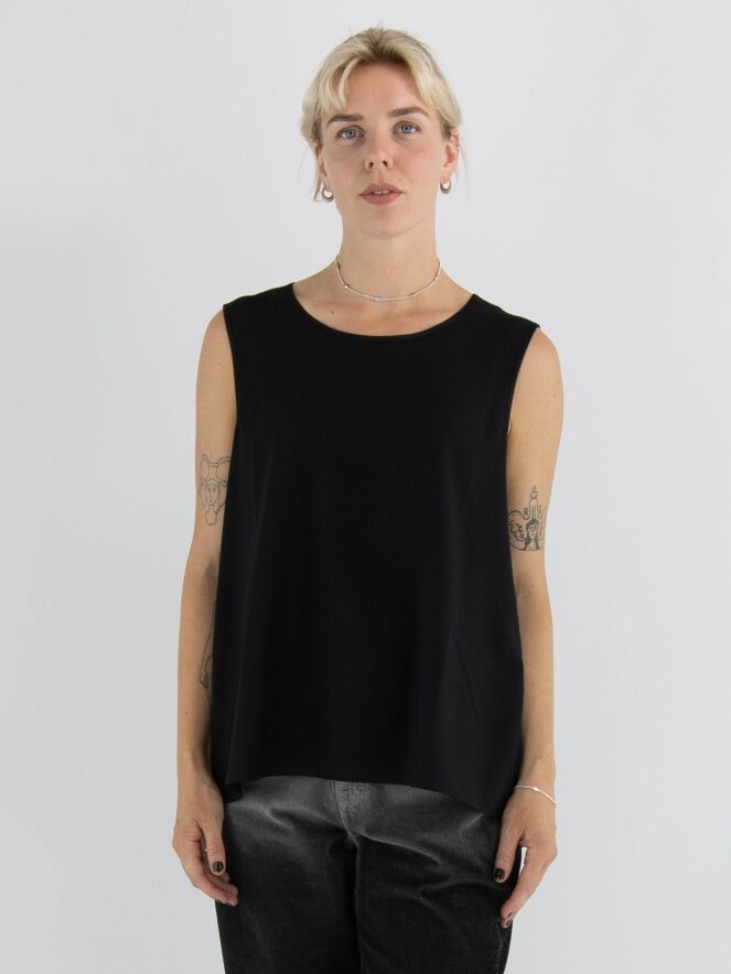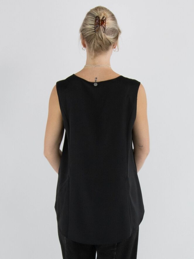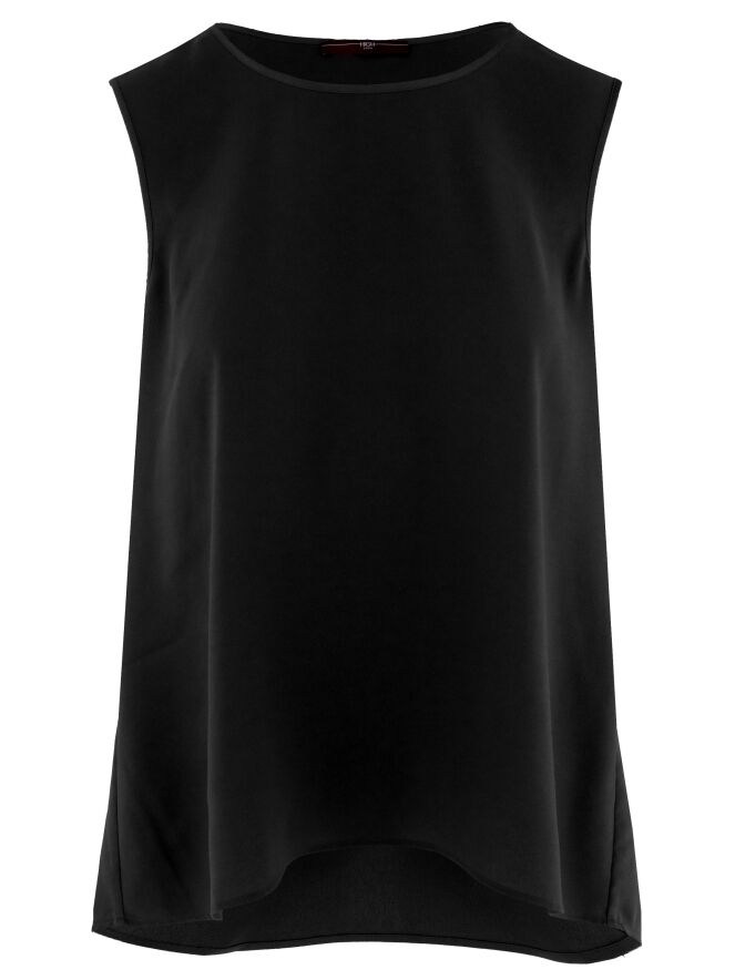 Top de la marque High en noir. Elle présente une encolure ronde et une légère forme évasée. Le devant est en tissu mat, tandis que le dos est en satin mat. Ce top doit être lavé à la main.