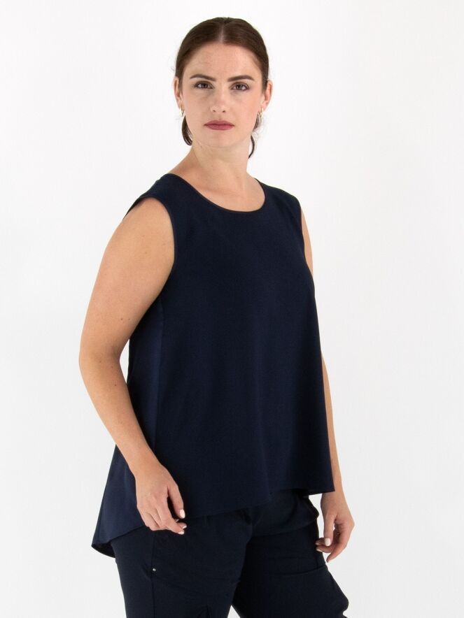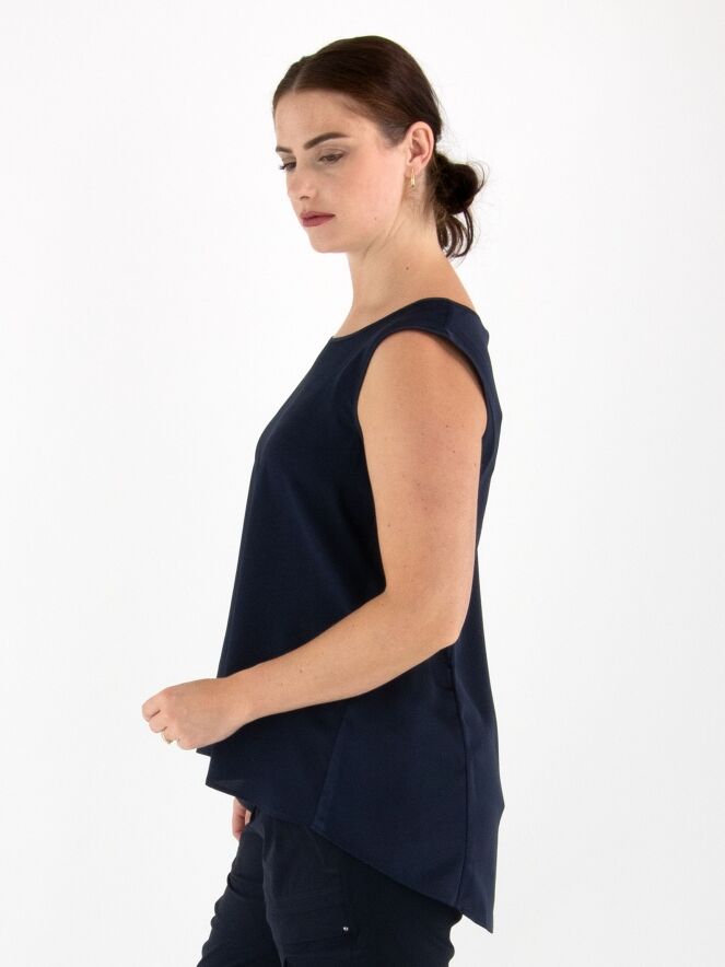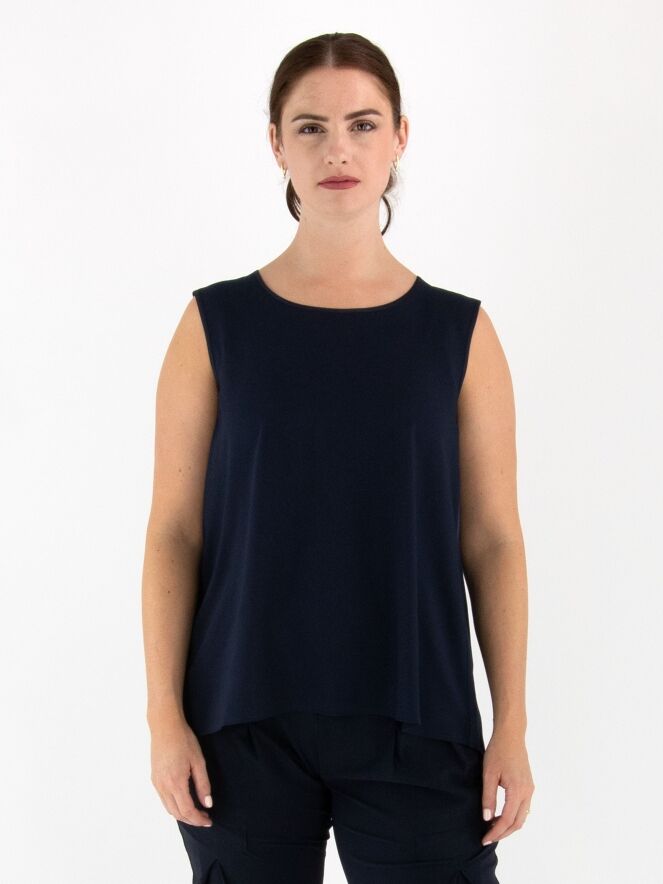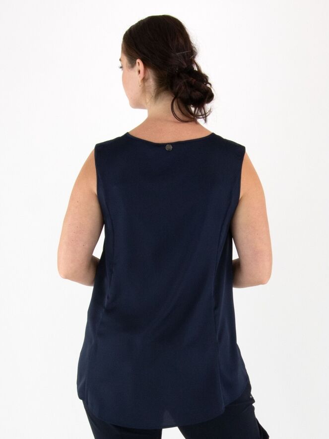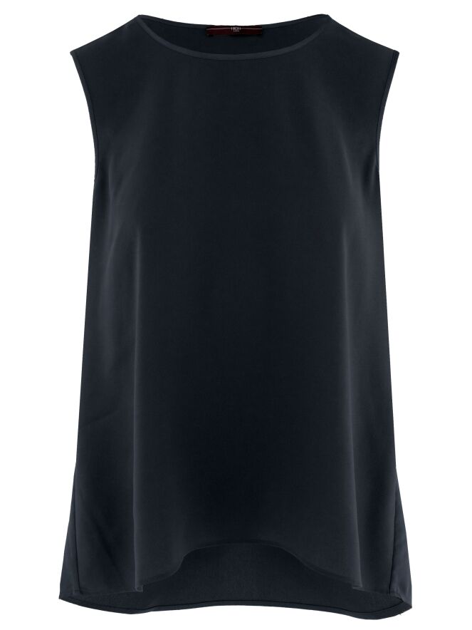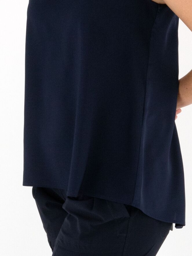 Top de la marque High en bleu marine. Il présente une encolure ronde et une légère coupe en A. L'avant est en tissu mat, l'arrière en satin mat. Ce top doit être lavé à la main.