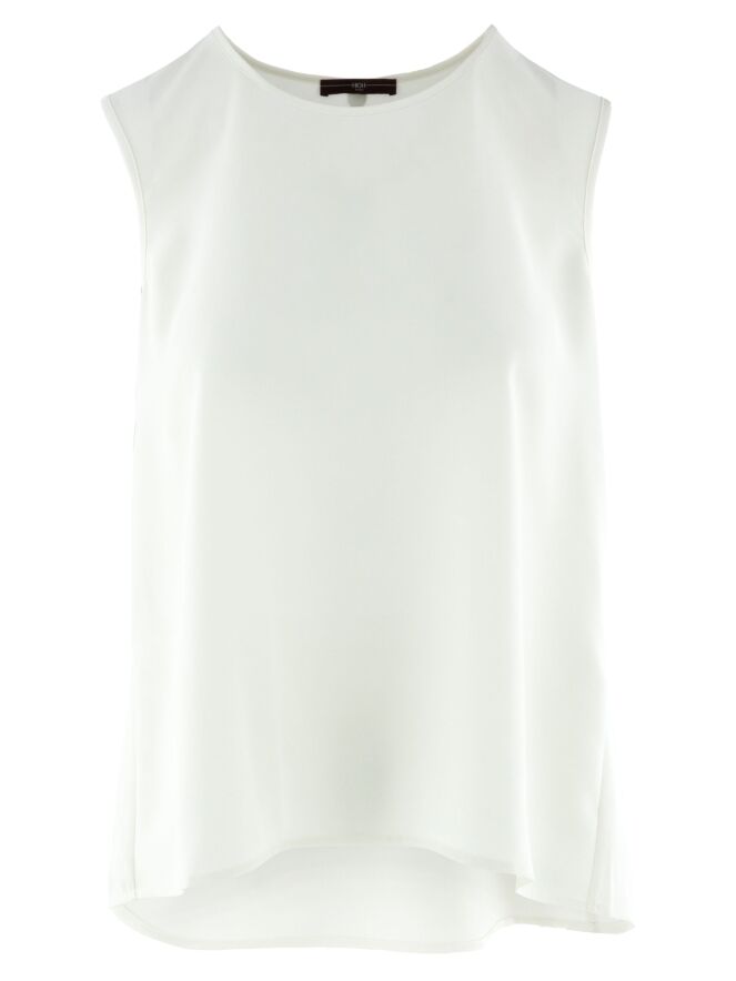 Un haut de High en blanc cassé. Le haut possède une encolure ronde et une légère ligne A. Le devant est réalisé dans un tissu mat, tandis que le dos est en satin mat. Ce haut peut être lavé à la main.