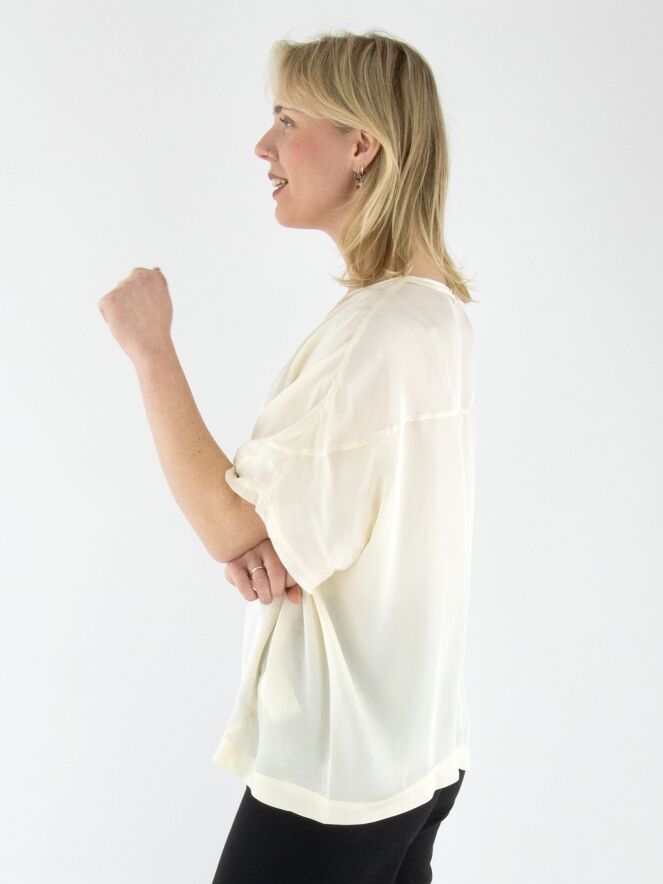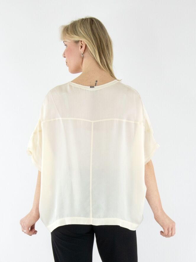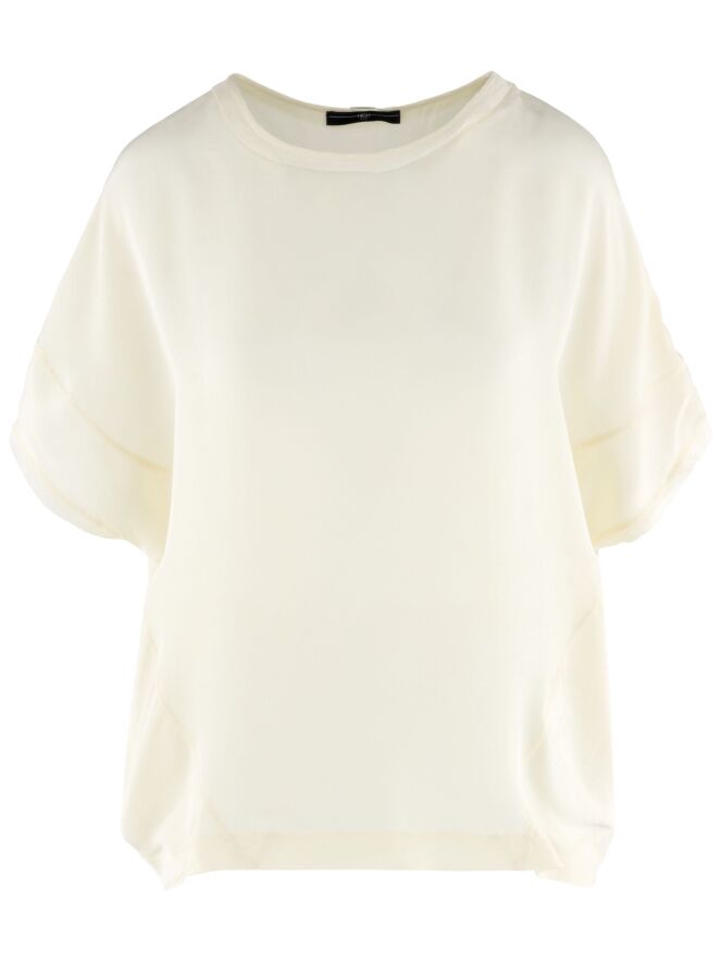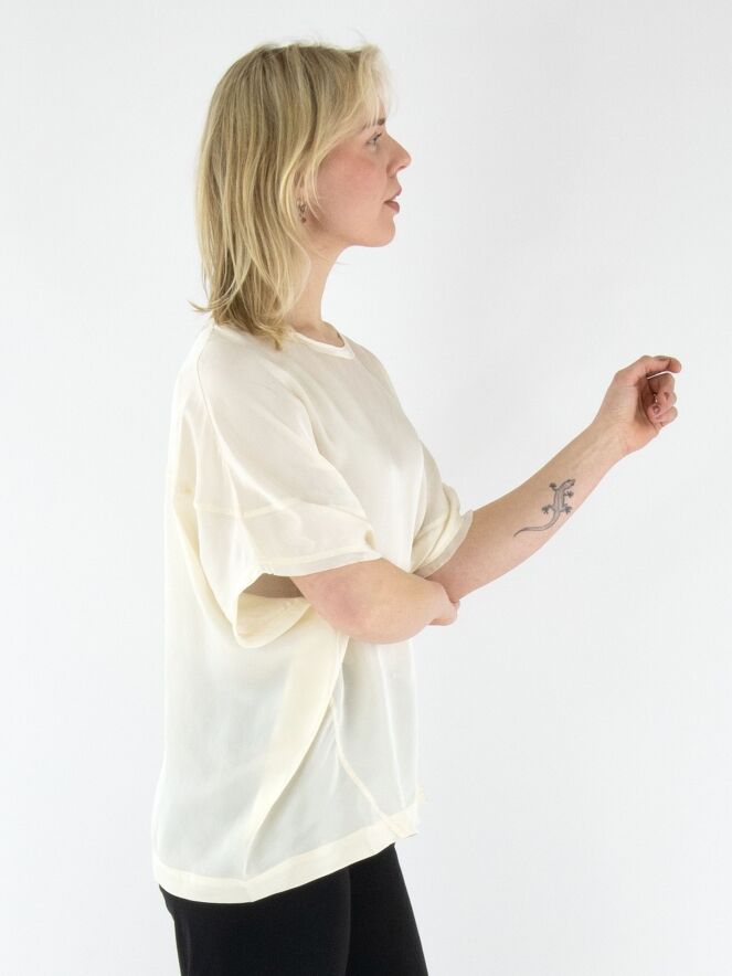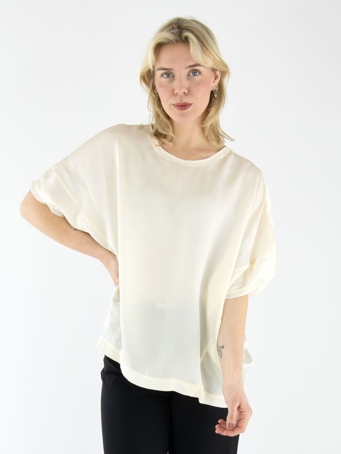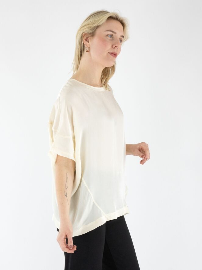 Un t-shirt en satin mat de High de couleur blanc crème. Le long du bord de l’encolure ronde et aux extrémités des manches courtes, une bordure en voile est présente. Ce t-shirt doit être lavé à la main.