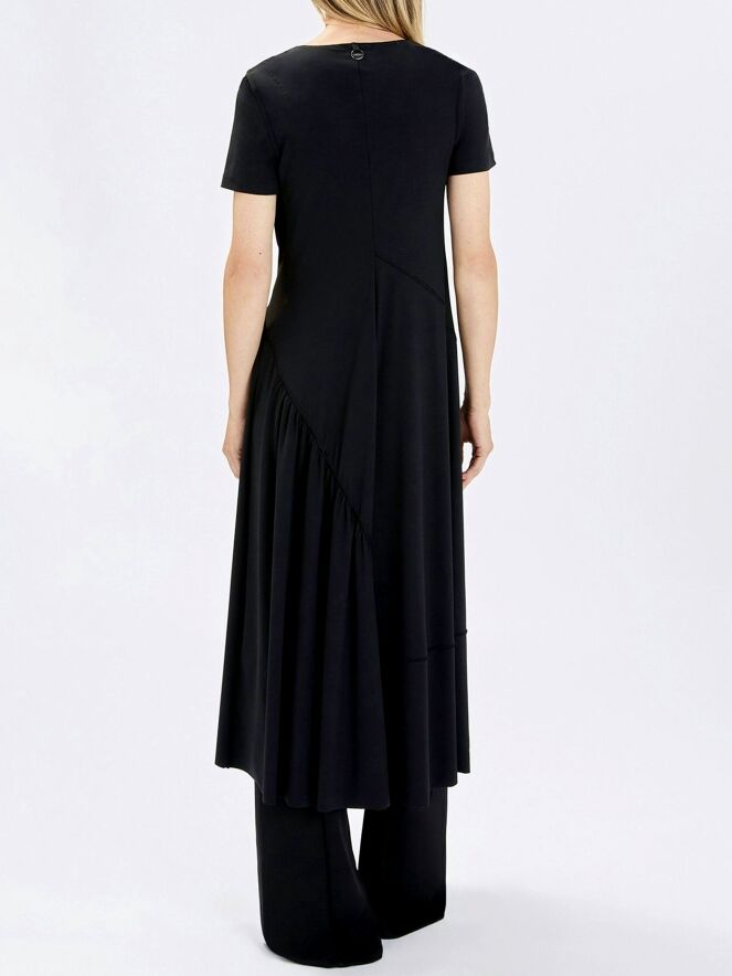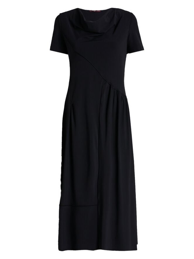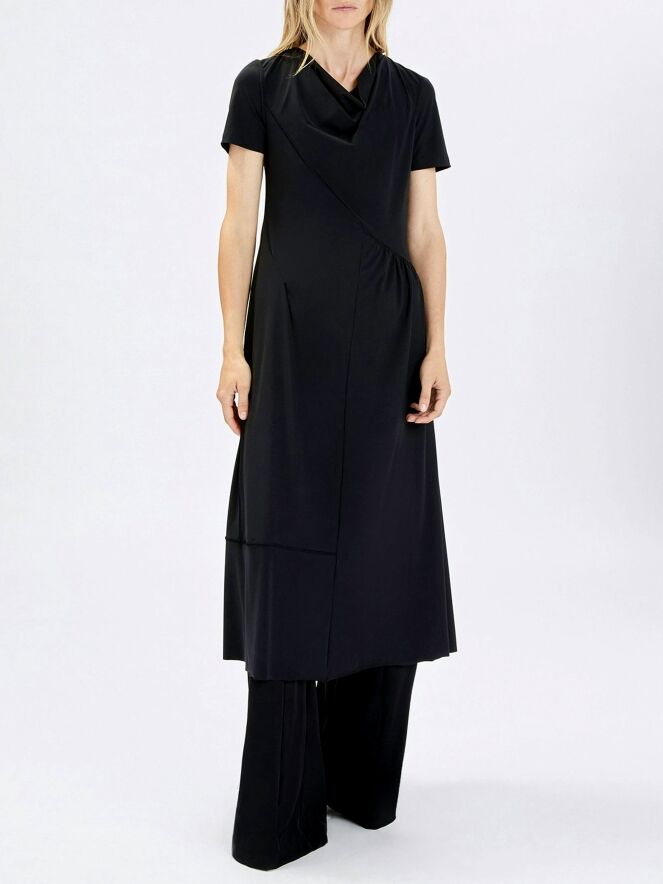 Robe de High dans une élégante teinte bleu marine. Dotée d’un col délicatement drapé et de manches courtes, elle offre une allure fluide et féminine. Une couture diagonale part de l’épaule gauche pour rejoindre le côté droit de la taille. Sous cette couture, le tissu est finement plissé à la taille, créant un détail raffiné. À partir de la taille, la robe s’évase en une coupe A flatteuse. Cette robe de créateur exclusive peut être lavée à 30 degrés.