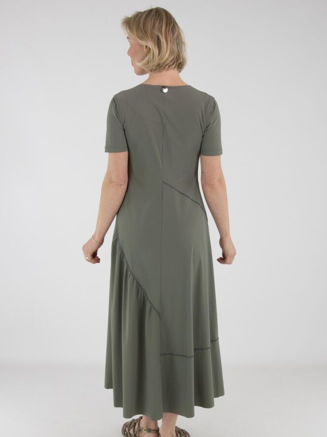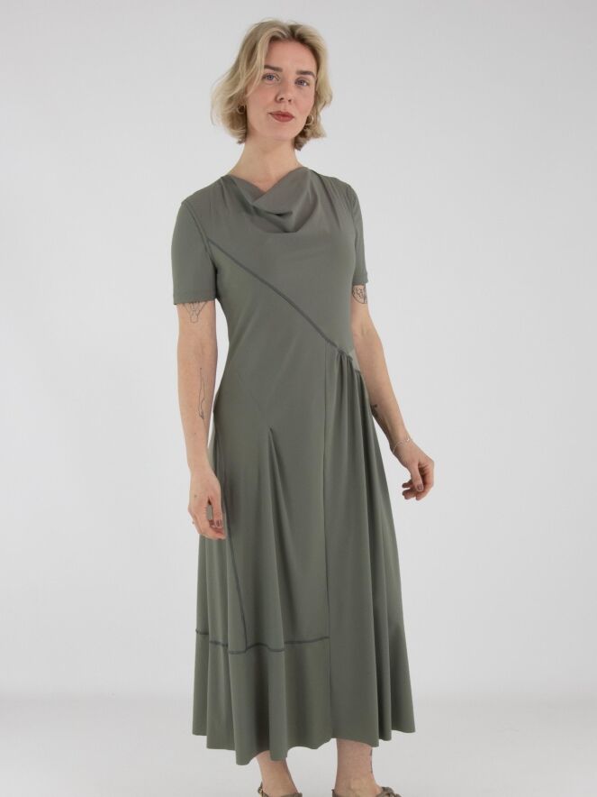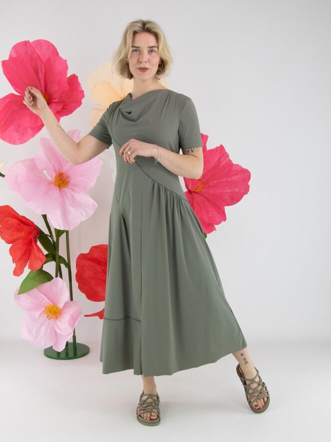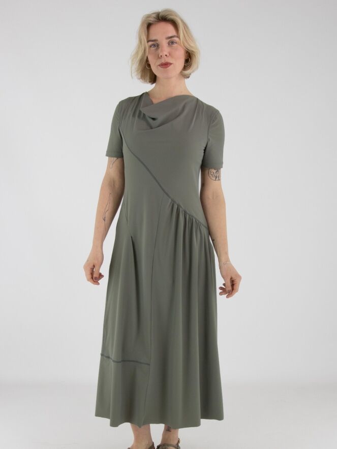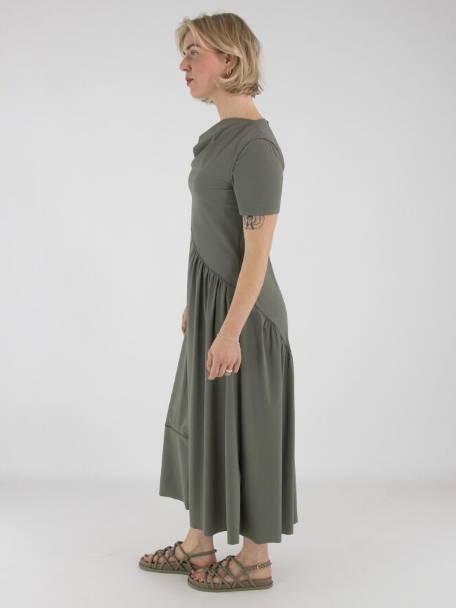 Une robe de High dans une teinte vert olive. La robe présente un col drapé et des manches courtes. Depuis l’épaule gauche, une couture diagonale descend vers le côté droit de la taille. À la taille, le tissu est finement plissé sous cette couture. À partir de la taille, la robe s’évase largement en ligne A. Cette robe peut être lavée à 30 degrés.