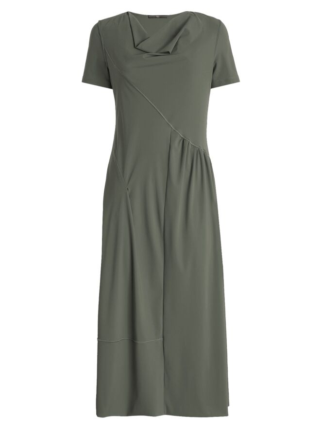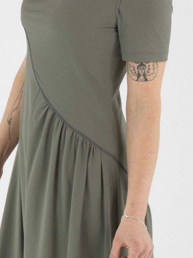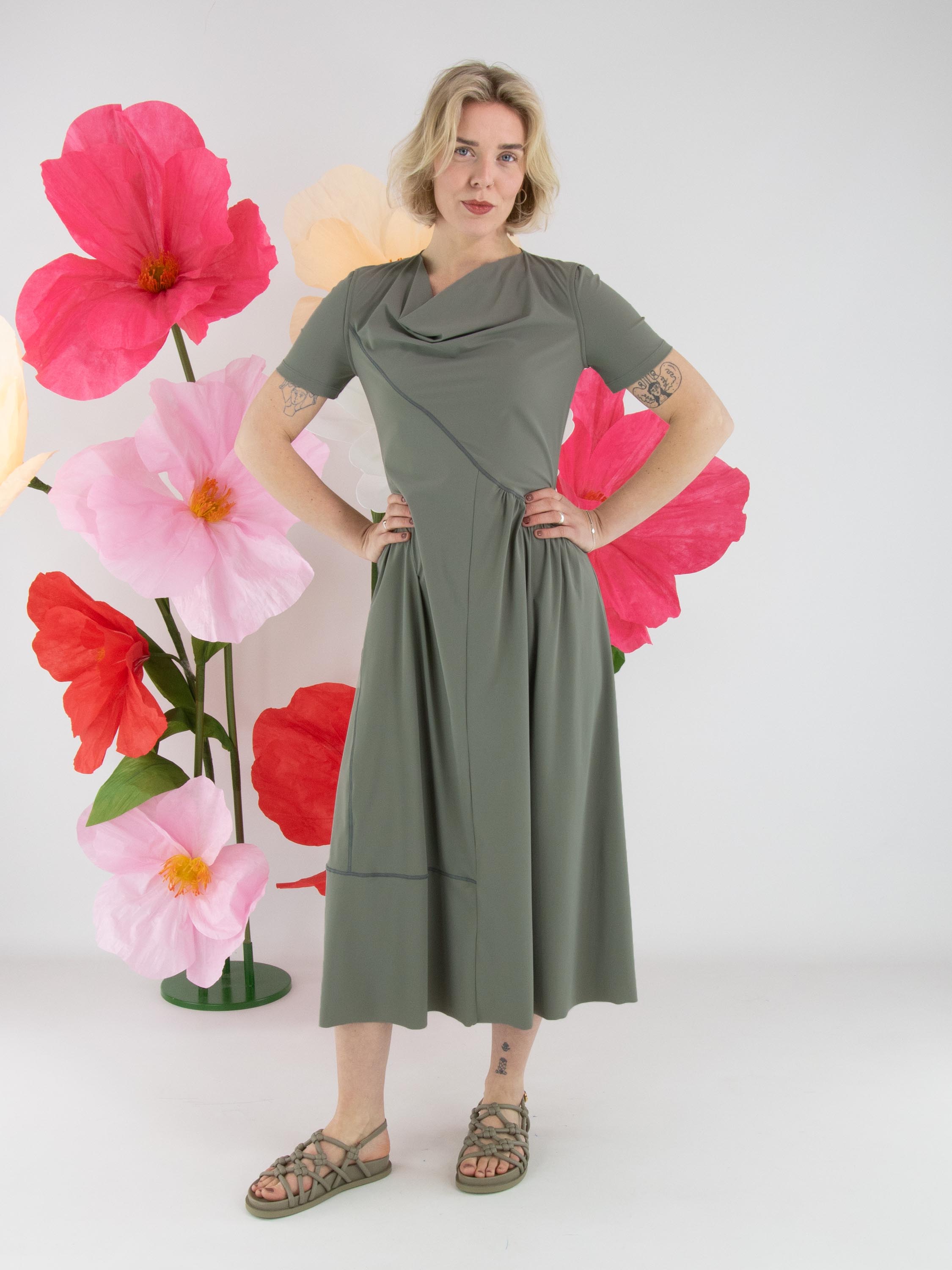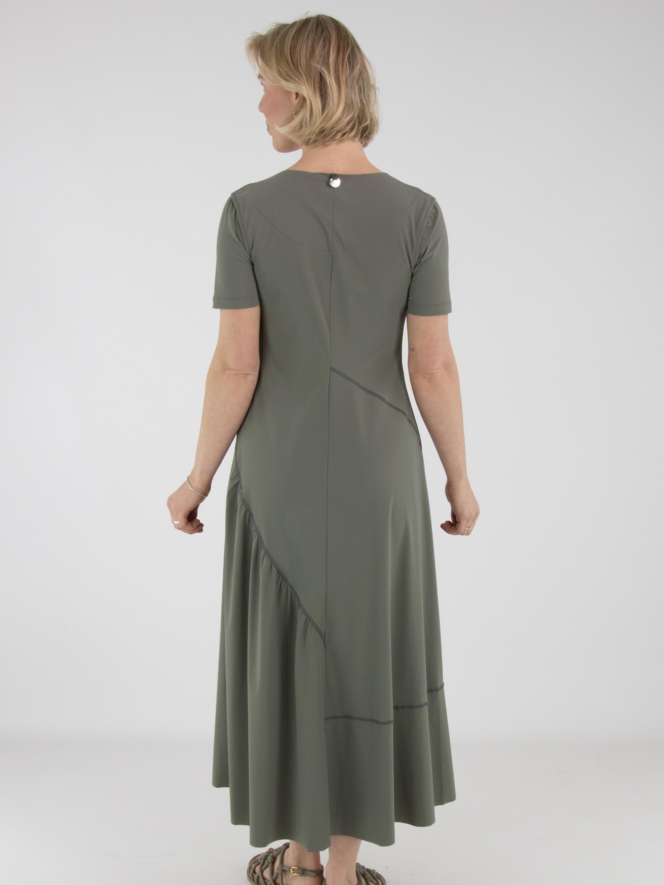 Une robe de High dans une teinte vert olive. La robe présente un col drapé et des manches courtes. Depuis l’épaule gauche, une couture diagonale descend vers le côté droit de la taille. À la taille, le tissu est finement plissé sous cette couture. À partir de la taille, la robe s’évase largement en ligne A. Cette robe peut être lavée à 30 degrés.