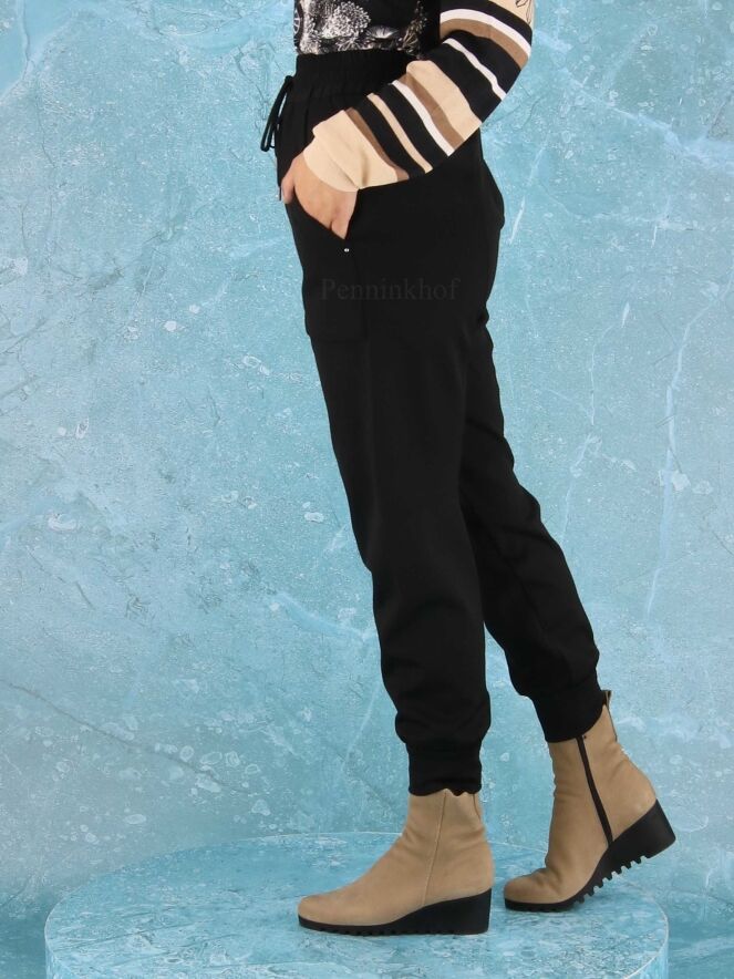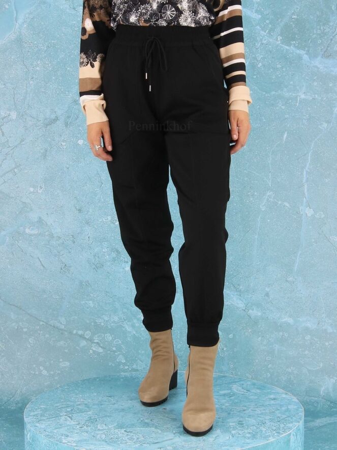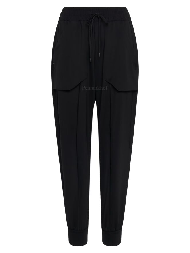 Pantalon à jambe fuselée de la marque High, de couleur noire. La taille est équipée d'une bande élastique à fronces avec cordon de serrage. Les jambes sont ornées de surpiqûres et d'un élastique au niveau de la cheville. Le pantalon possède de grandes poches latérales semi-soufflées. Lavage à la main.