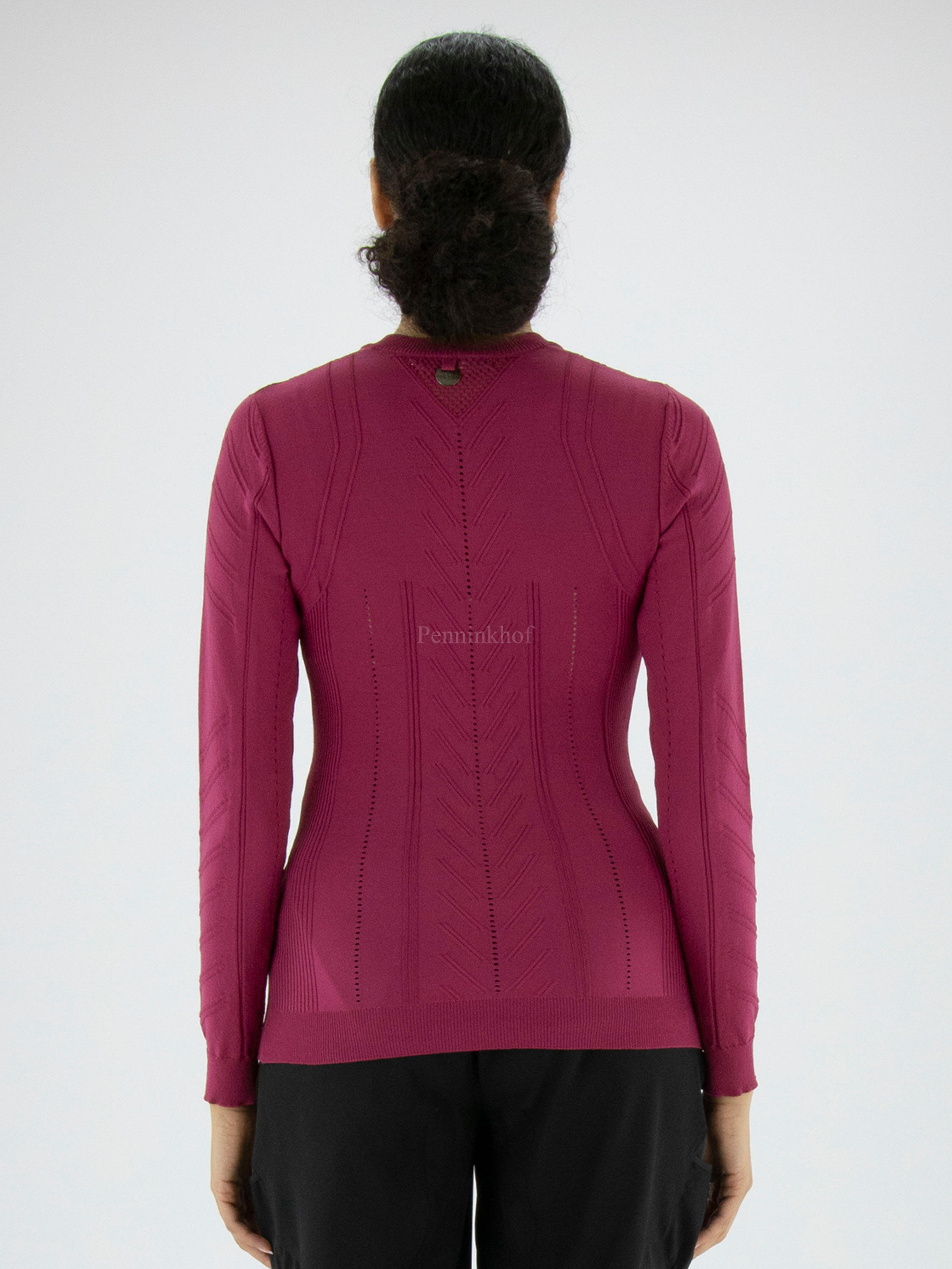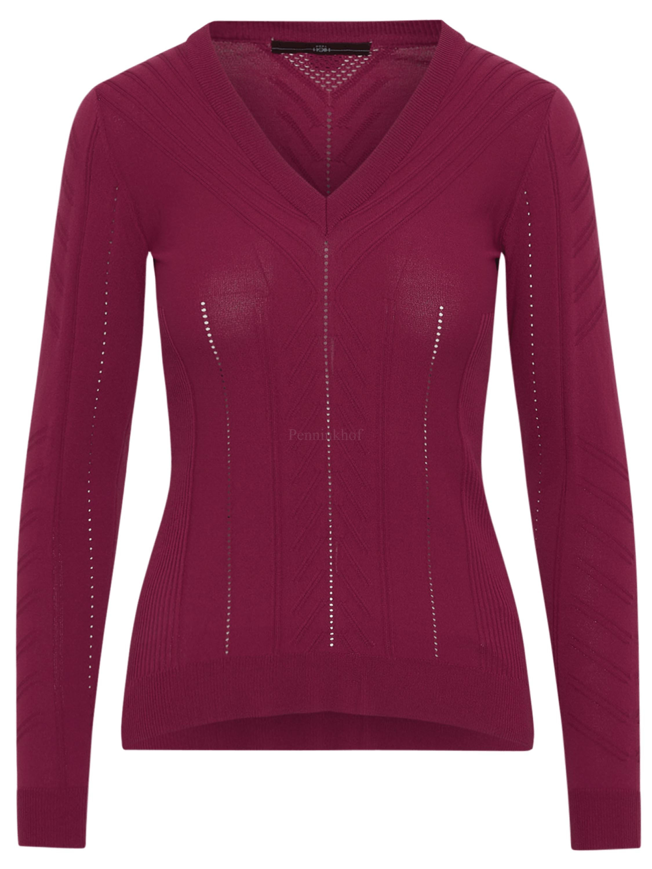 Pull léger de High, de couleur violette. Ce pull présente plusieurs structures de tricot. Le long de l'encolure en V se trouve une fine bordure côtelée. Ce détail revient à l'extrémité des manches longues et au bas du pull.
