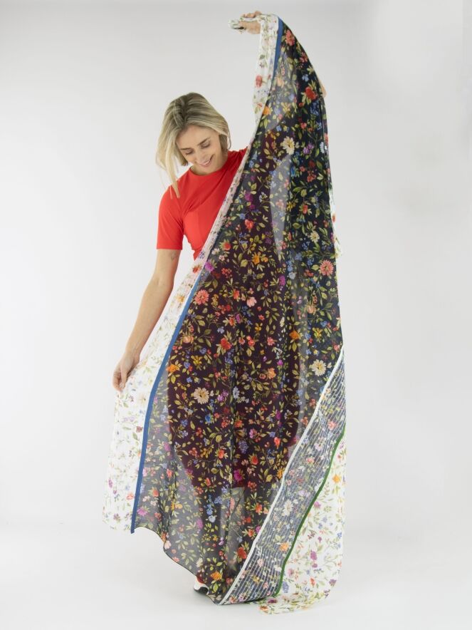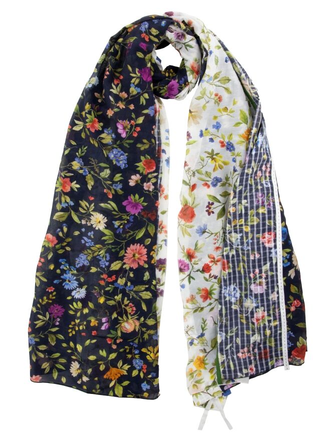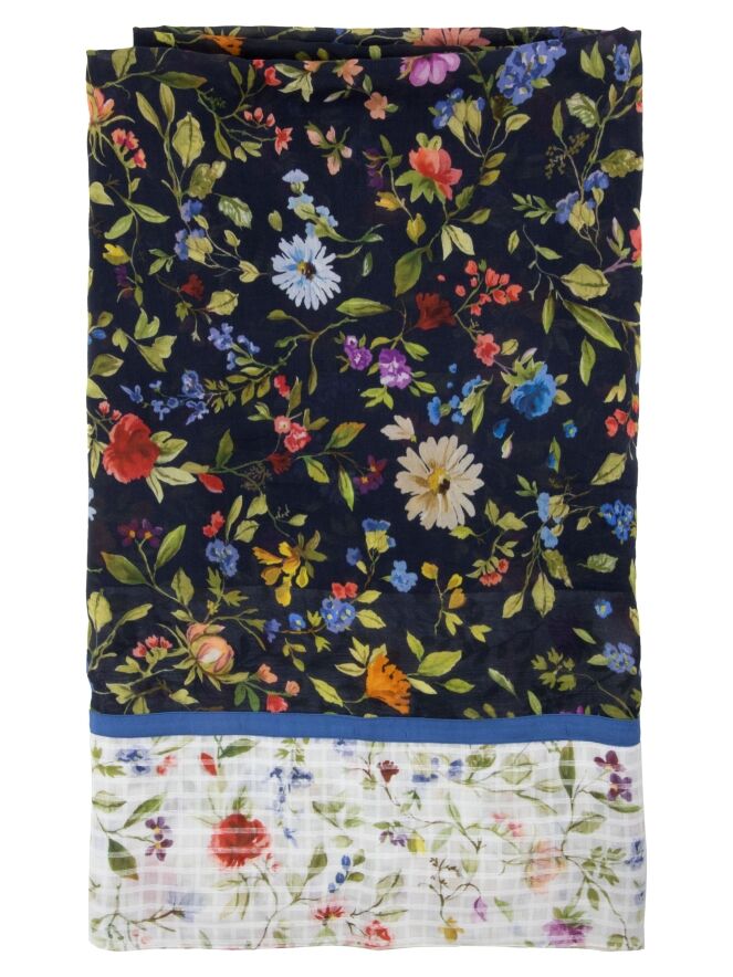 Une écharpe luxueuse de High avec un imprimé floral multicolore. Le centre de l’écharpe présente un fond bleu marine, tandis que les côtés ont un fond blanc crème. Entre les différentes sections de couleur, une bordure verte et une bordure bleue sont intégrées. Cette écharpe doit être lavée à la main.