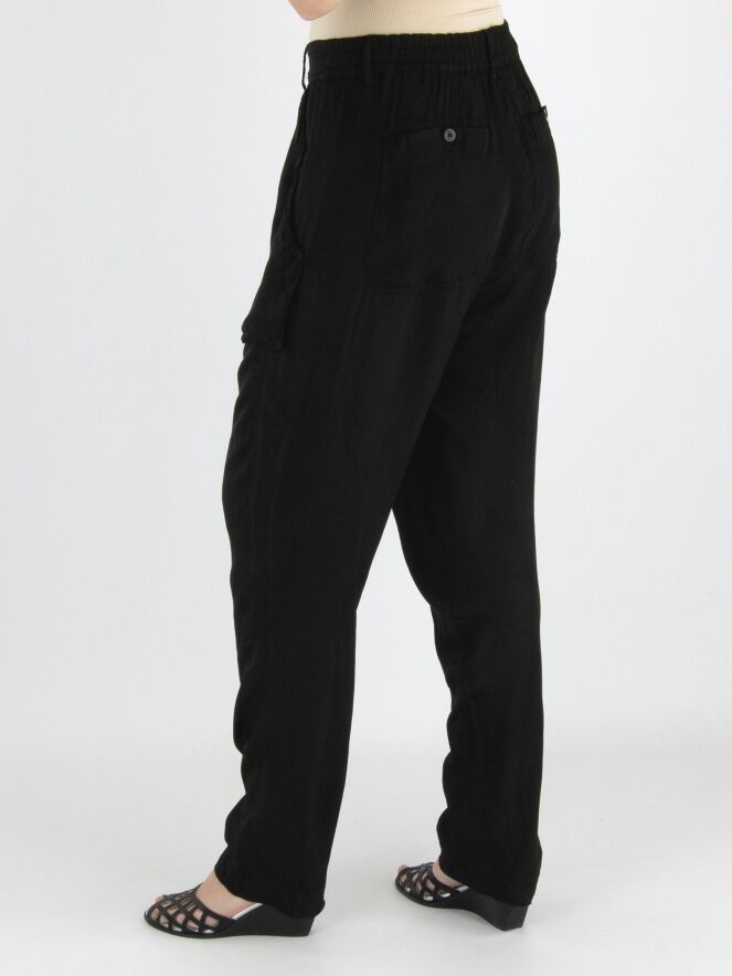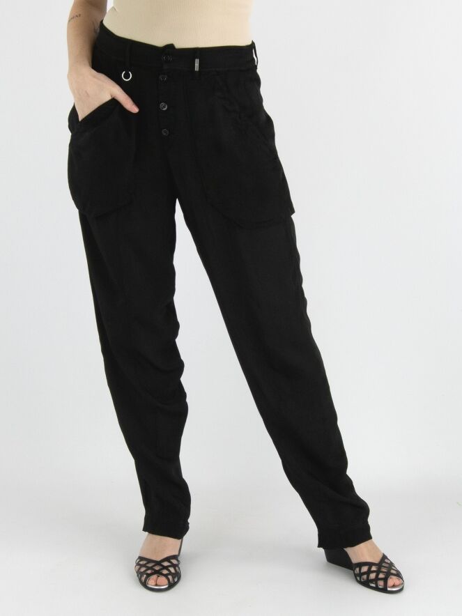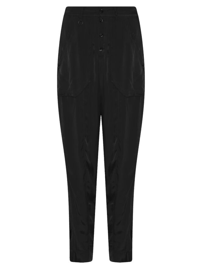 Un pantalon en satin mat de High en noir. À l'arrière de la taille, il y a une large bande élastique finement côtelée. Il y a une fermeture à bouton à l'avant. Les poches latérales sont accentuées d'une double épaisseur de tissu le long des coutures sur le bord inférieur. Ce pantalon doit être lavé à la main.