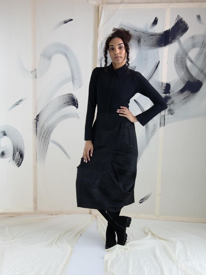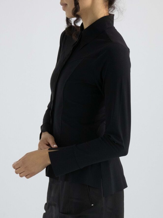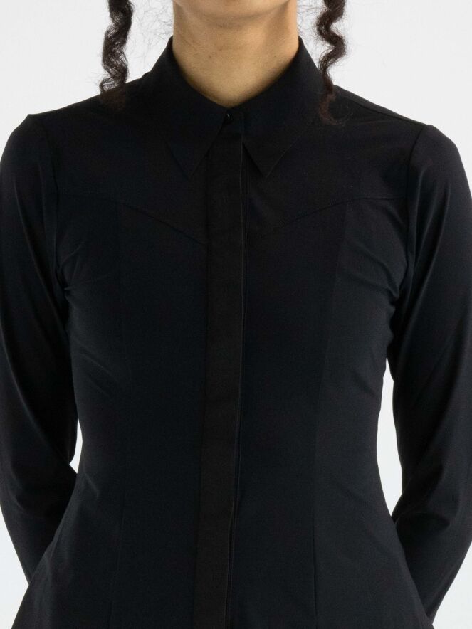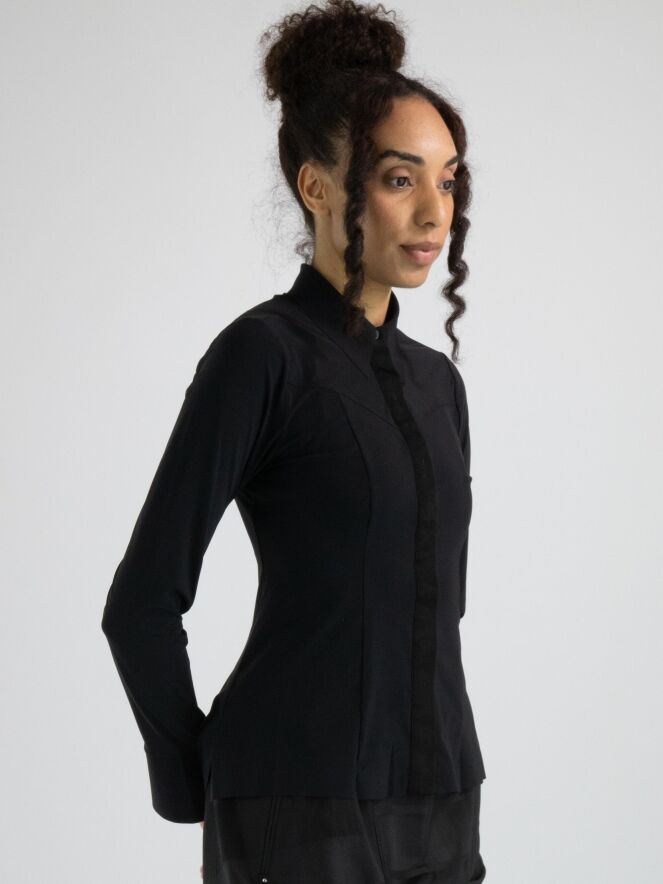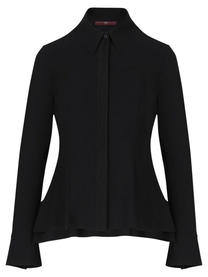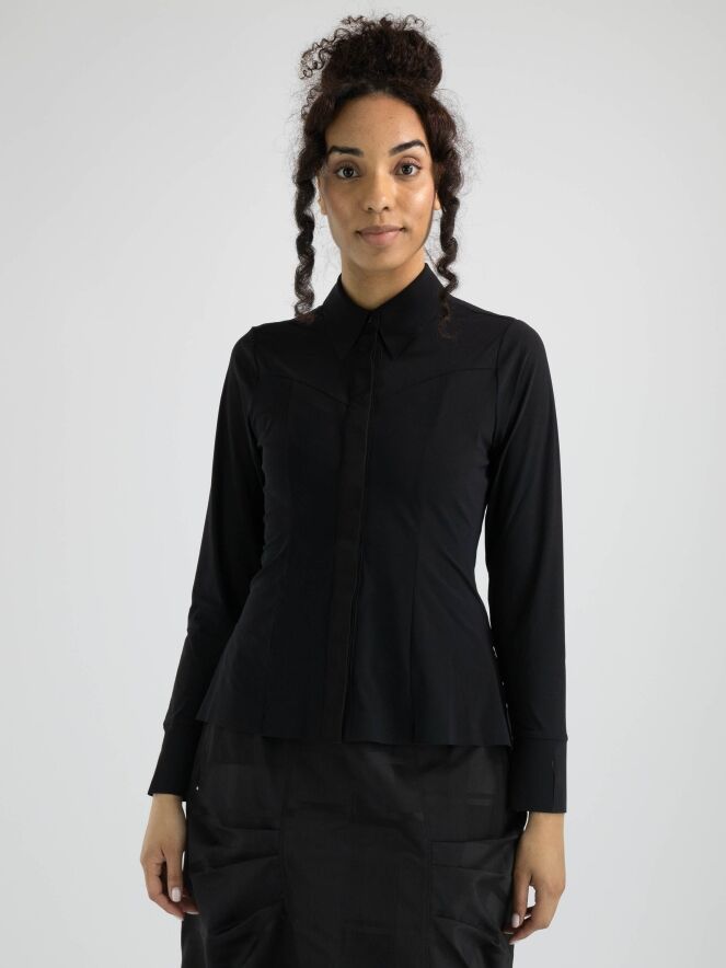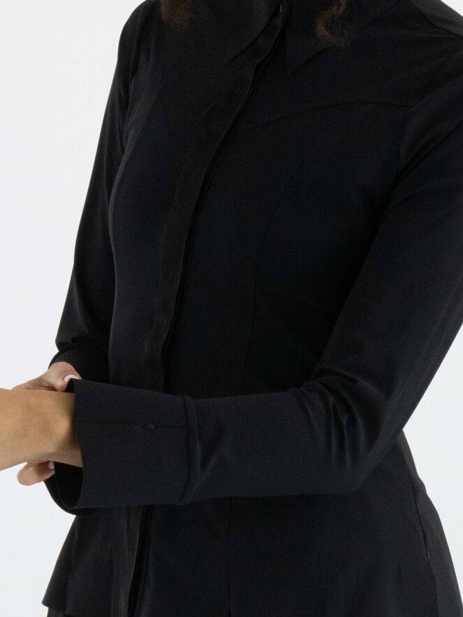 Une blouse noire de High qui s'évase légèrement. Les manches longues se terminent par une fente en V élastique et délicate. Cette blouse peut être lavée à 30 degrés.