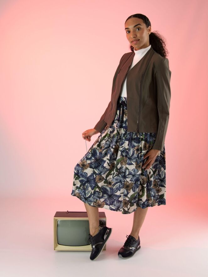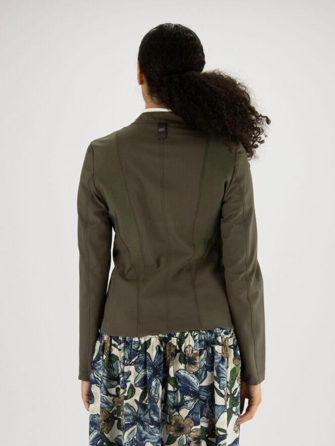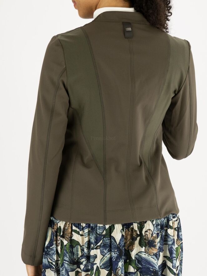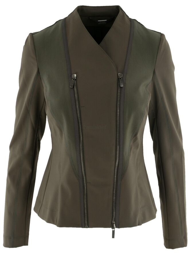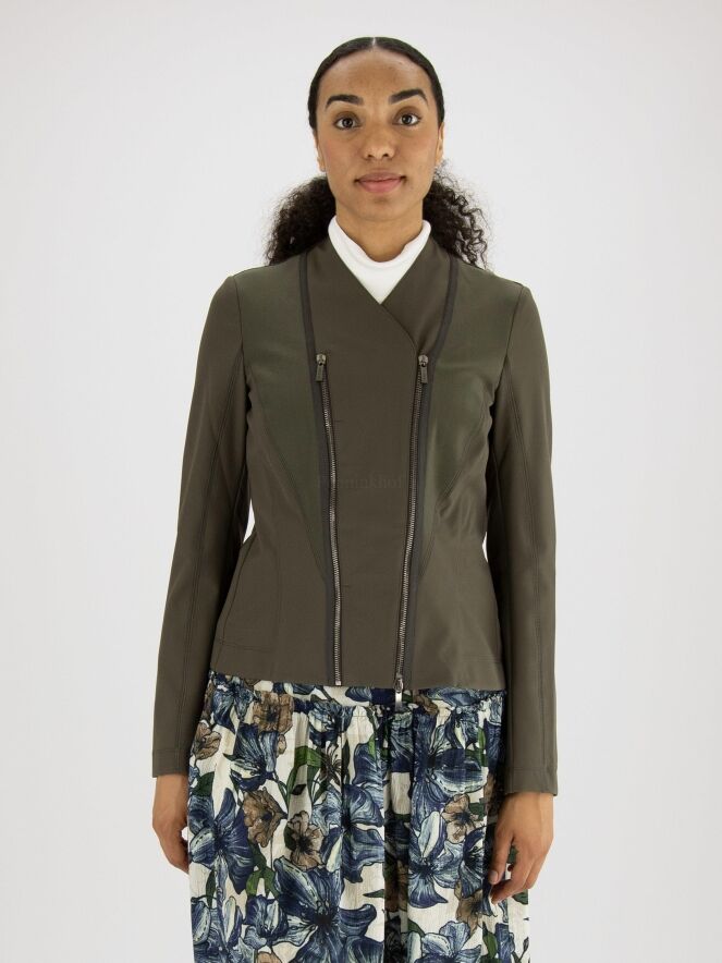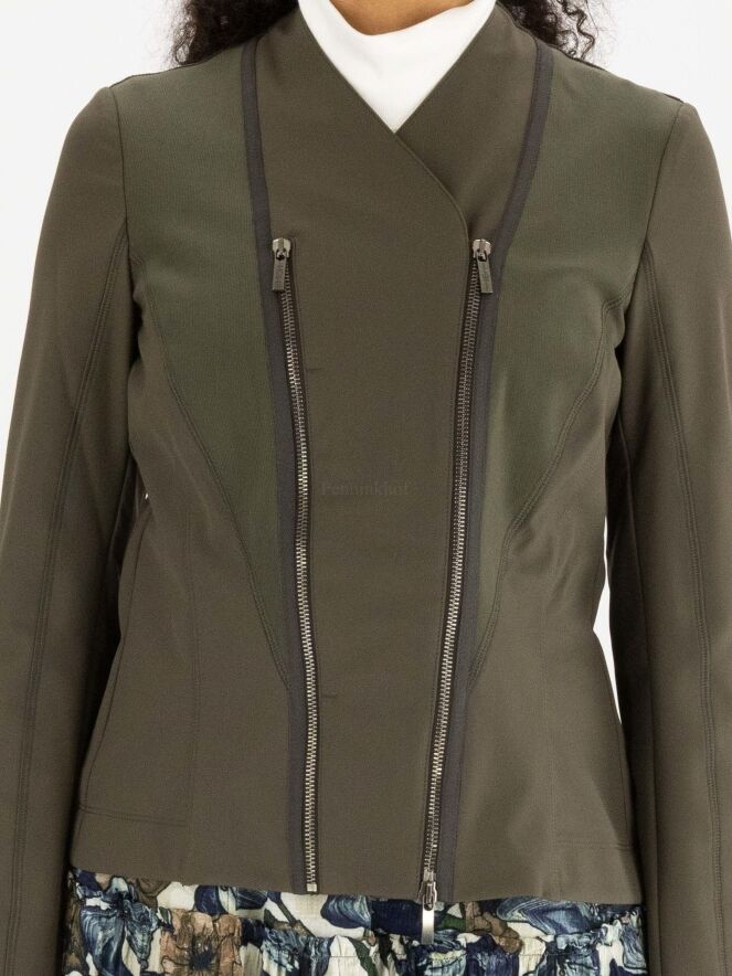 Veste de la marque High, de couleur kaki. L'avant est doté de deux fermetures Eclair, l'une décorative et l'autre servant à la fermeture croisée. Les épaules sont bordées d'un tissu côtelé fin qui se rétrécit jusqu'à la taille. Lavage à la main.