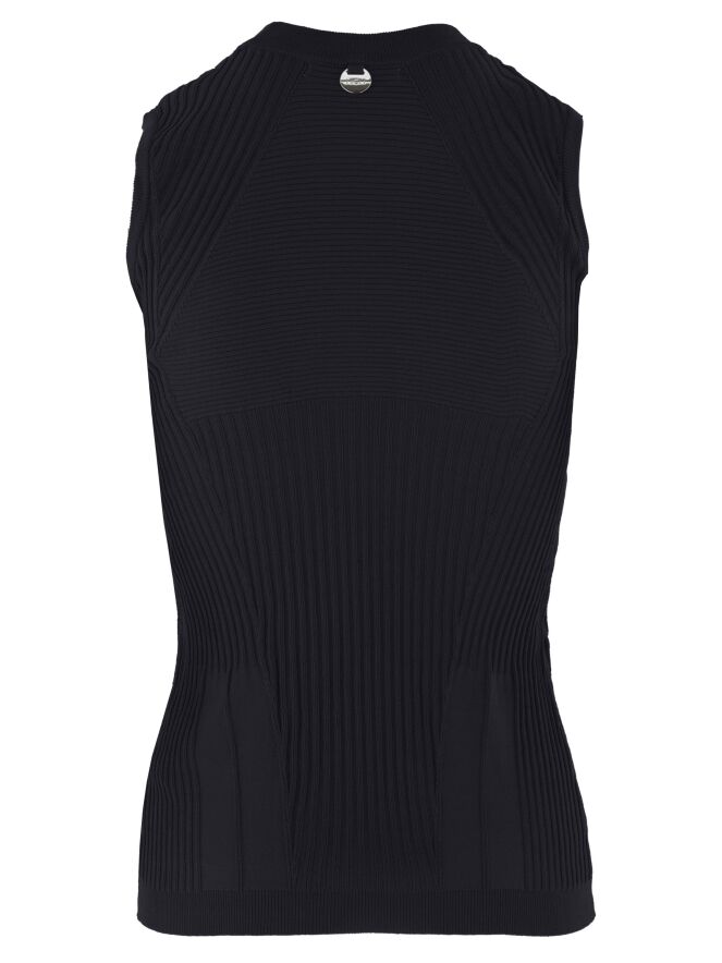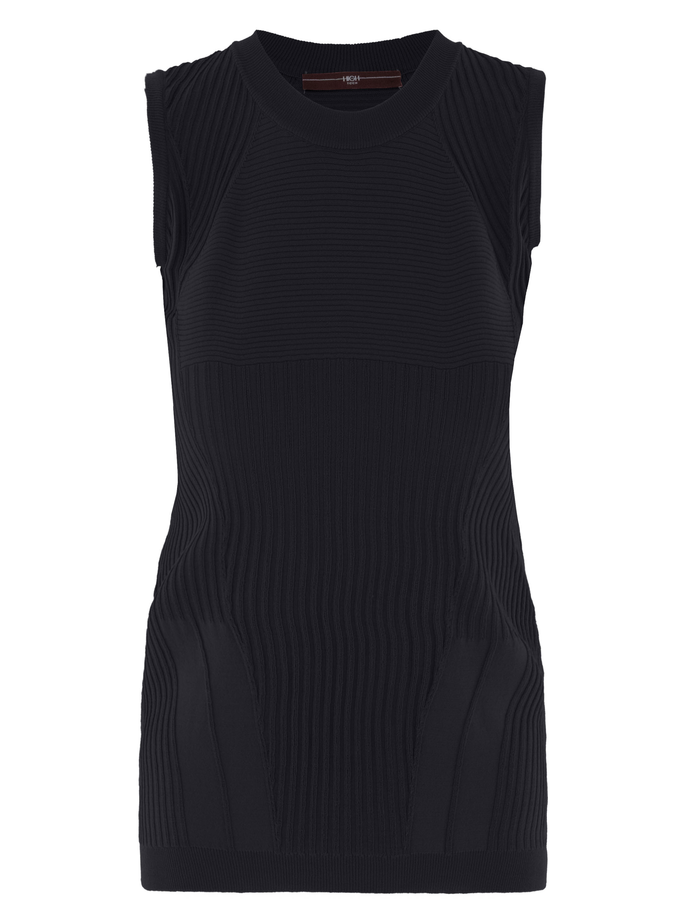 Un haut de High de couleur bleu marine. Le haut présente une structure de rayures horizontales, verticales et diagonales. Le long du bord de l’encolure ronde se trouve une bordure en maille finement côtelée. Ce haut peut être lavé à la main.