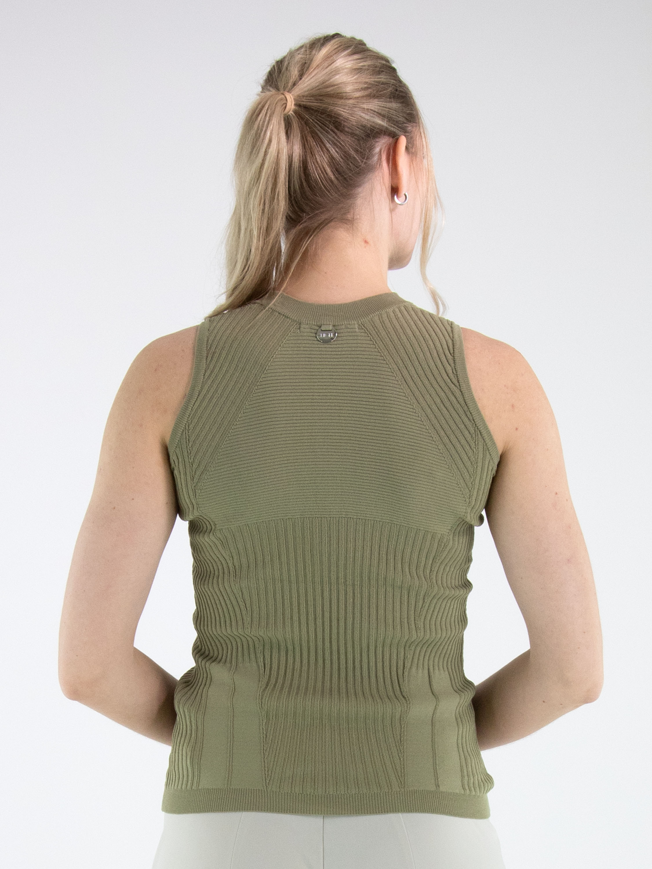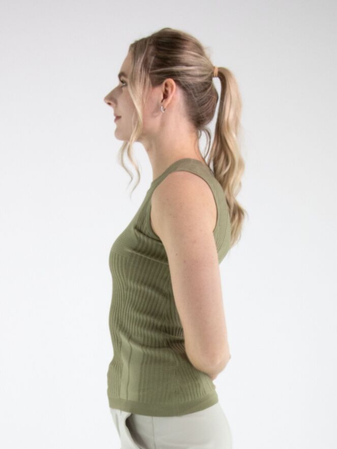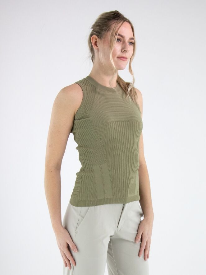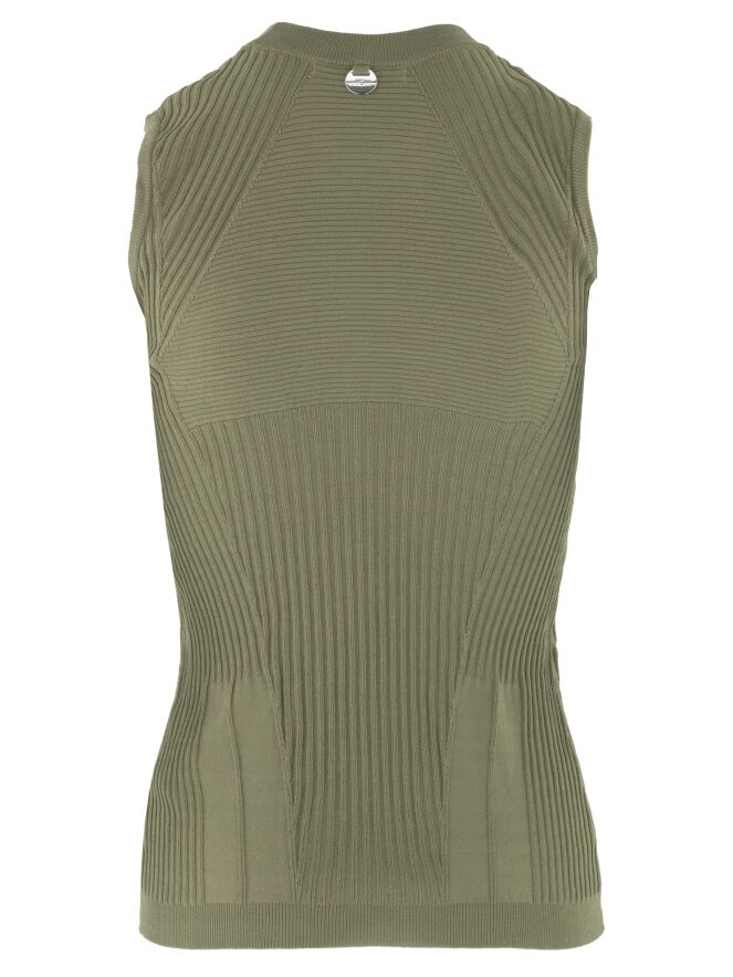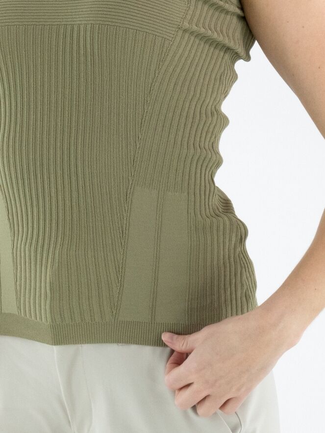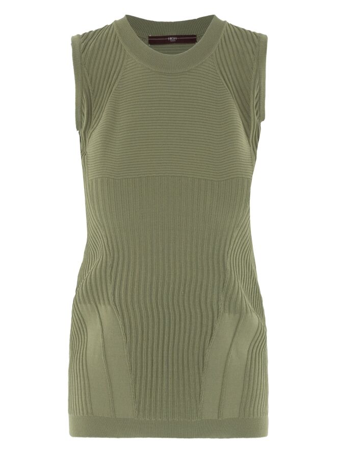 Top de High dans une élégante teinte vert olive. Le tissu présente une structure originale de rayures disposées horizontalement, verticalement et en diagonale, créant un effet dynamique et contemporain. Un bord en maille finement côtelée souligne l’encolure ronde pour une finition subtilement sportive. Ce top de créateur exclusif doit être lavé à la main.
