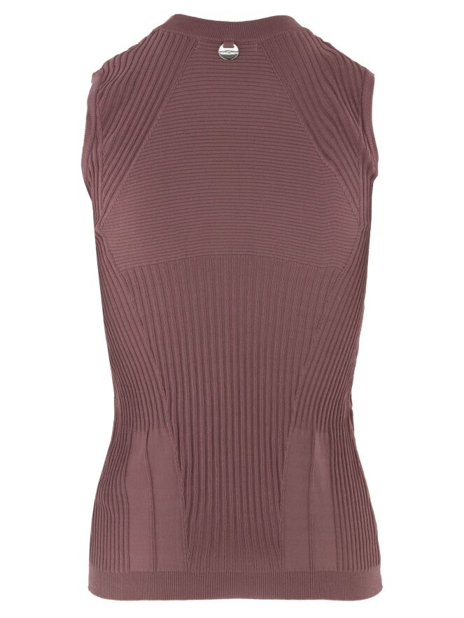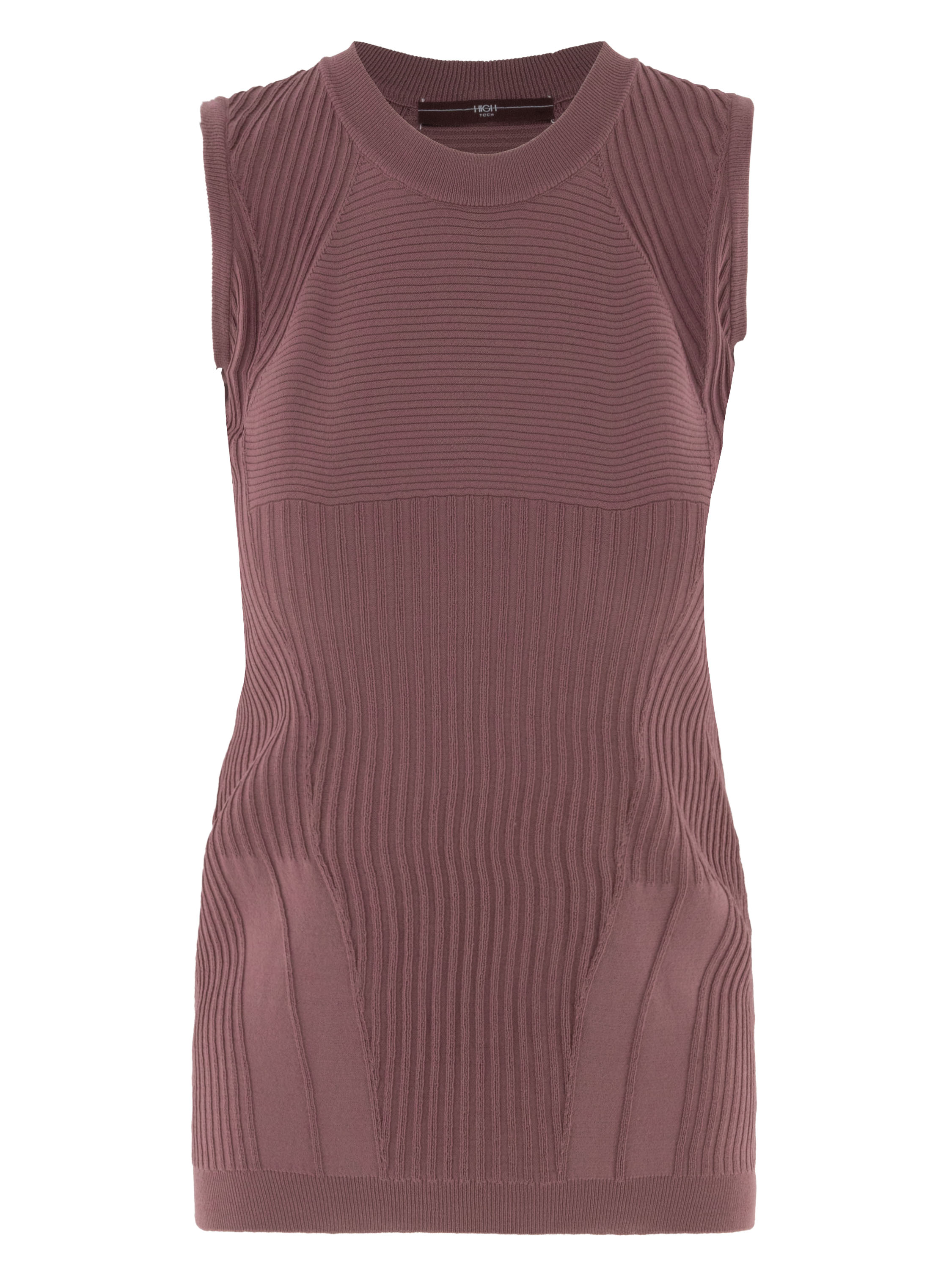 Un haut de High de couleur framboise. Le haut présente une structure de rayures horizontales, verticales et diagonales. Le long du bord de l’encolure ronde se trouve une bordure en maille finement côtelée. Ce haut peut être lavé à la main.