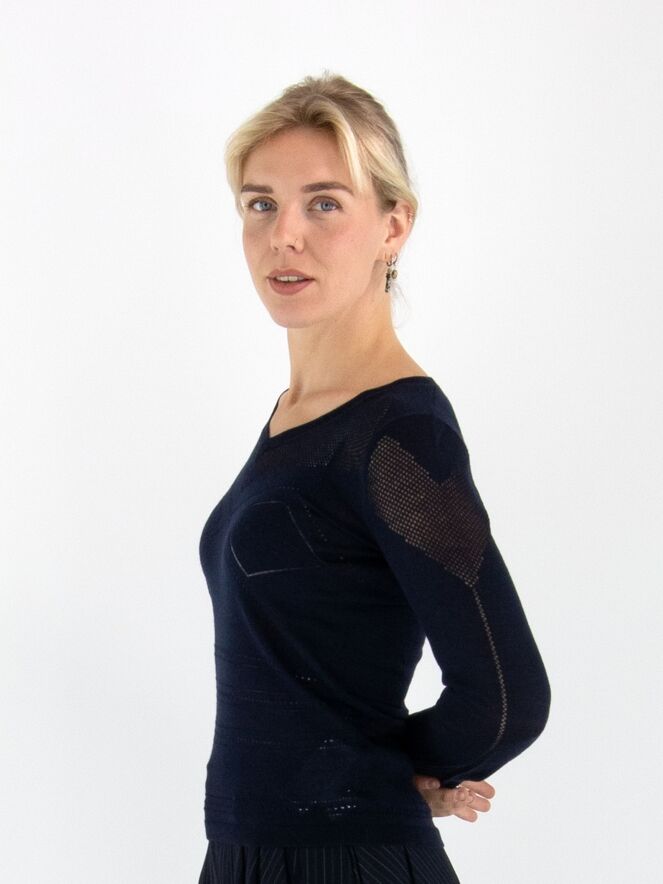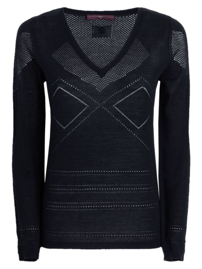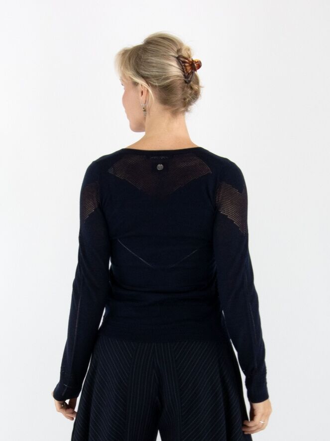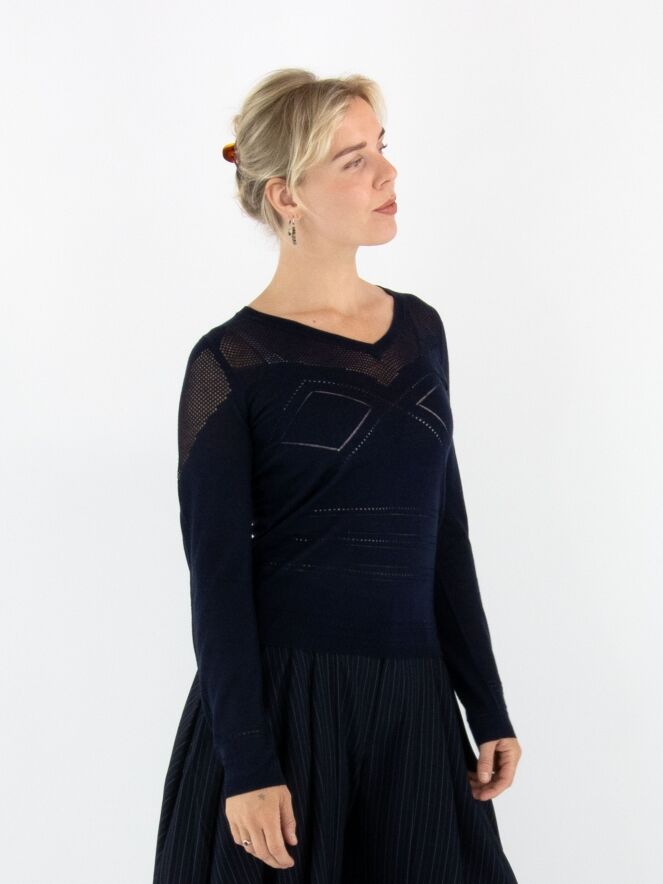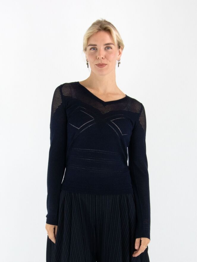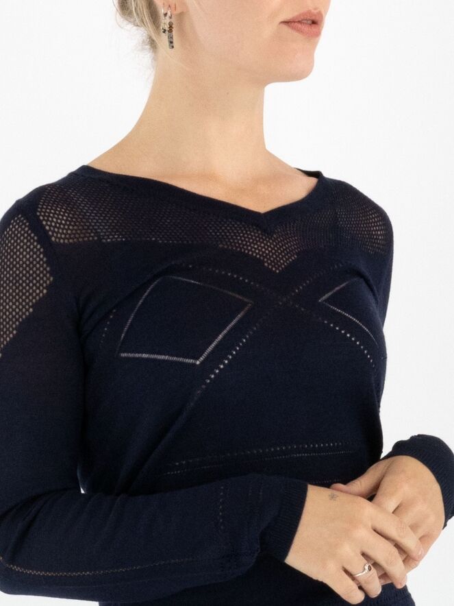 Pull de luxe de la marque High en bleu marine. Le col en V, les épaules et les manches sont réalisés dans une maille ajourée transparente. Le devant et le dos présentent plusieurs motifs ajourés. Ce pull se lave à la main.