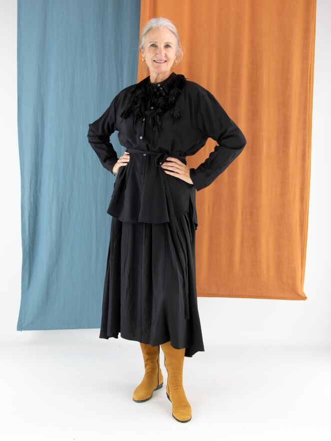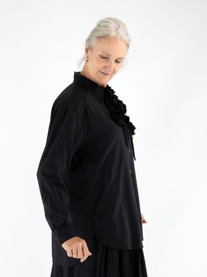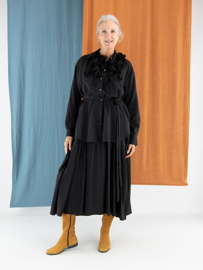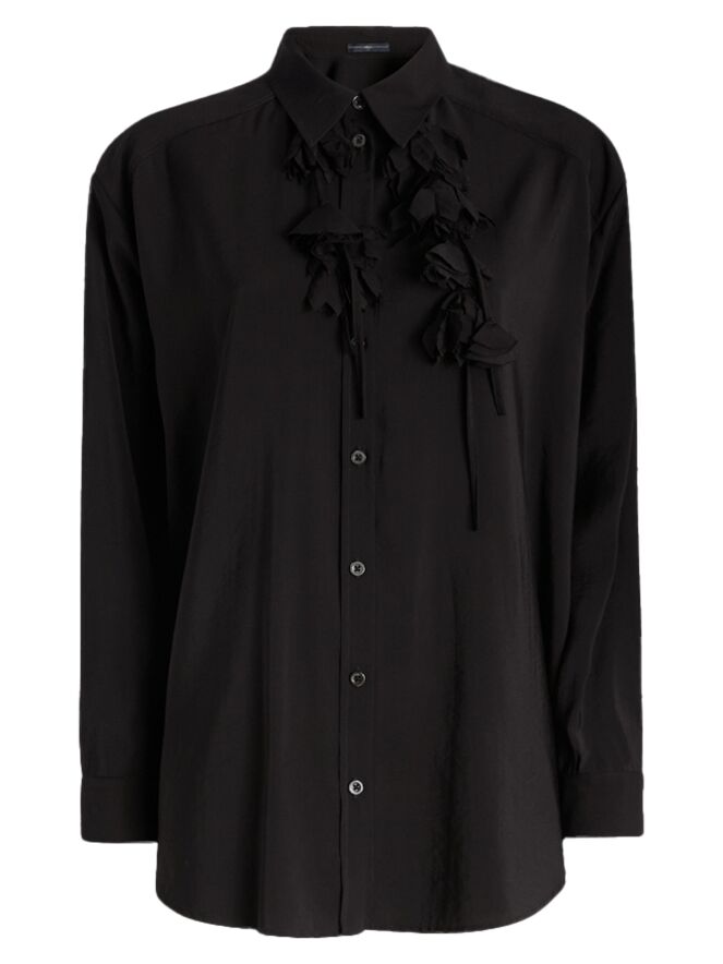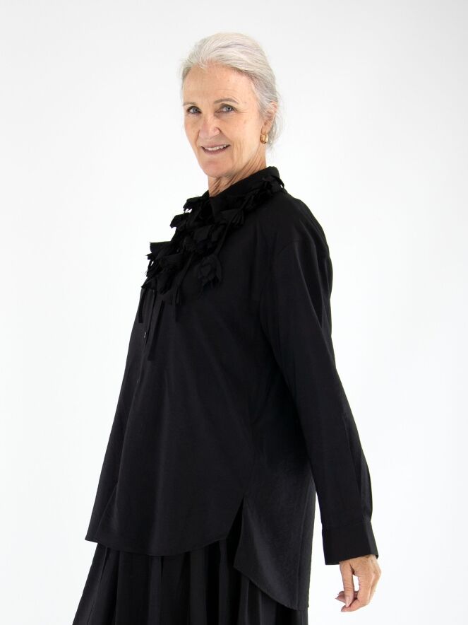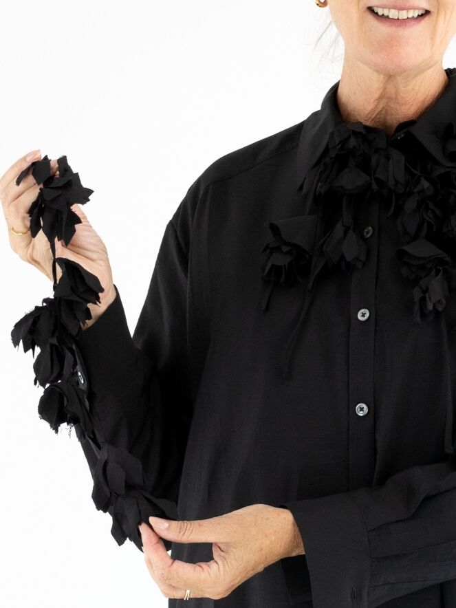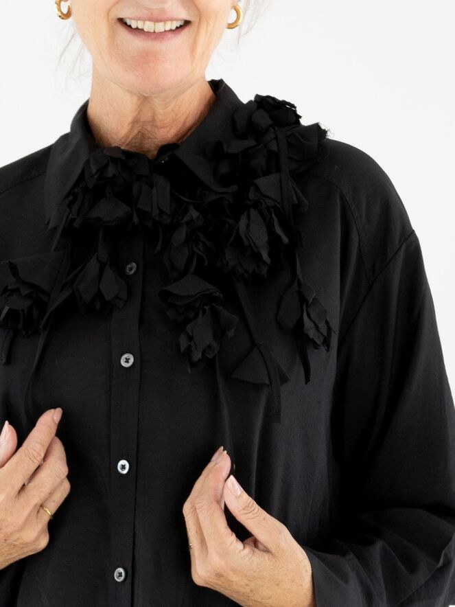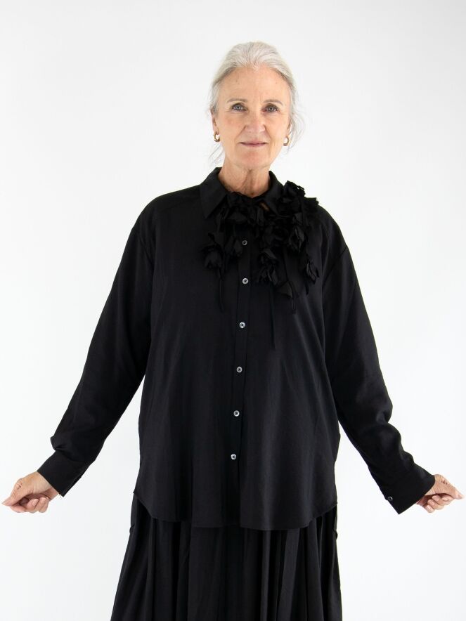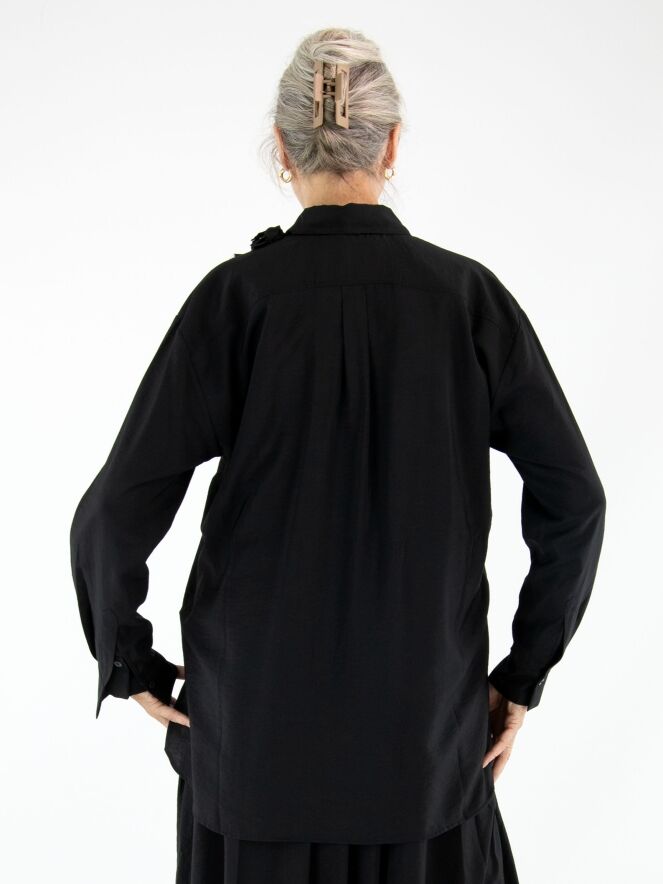 Une blouse longue et ample de High en satin mat de couleur noire. Trois rubans descendent du col, ornés de fleurs confectionnées dans la même étoffe que la blouse. Ce détail original apporte à la pièce une touche artistique et raffinée. La blouse peut être lavée à la main.
