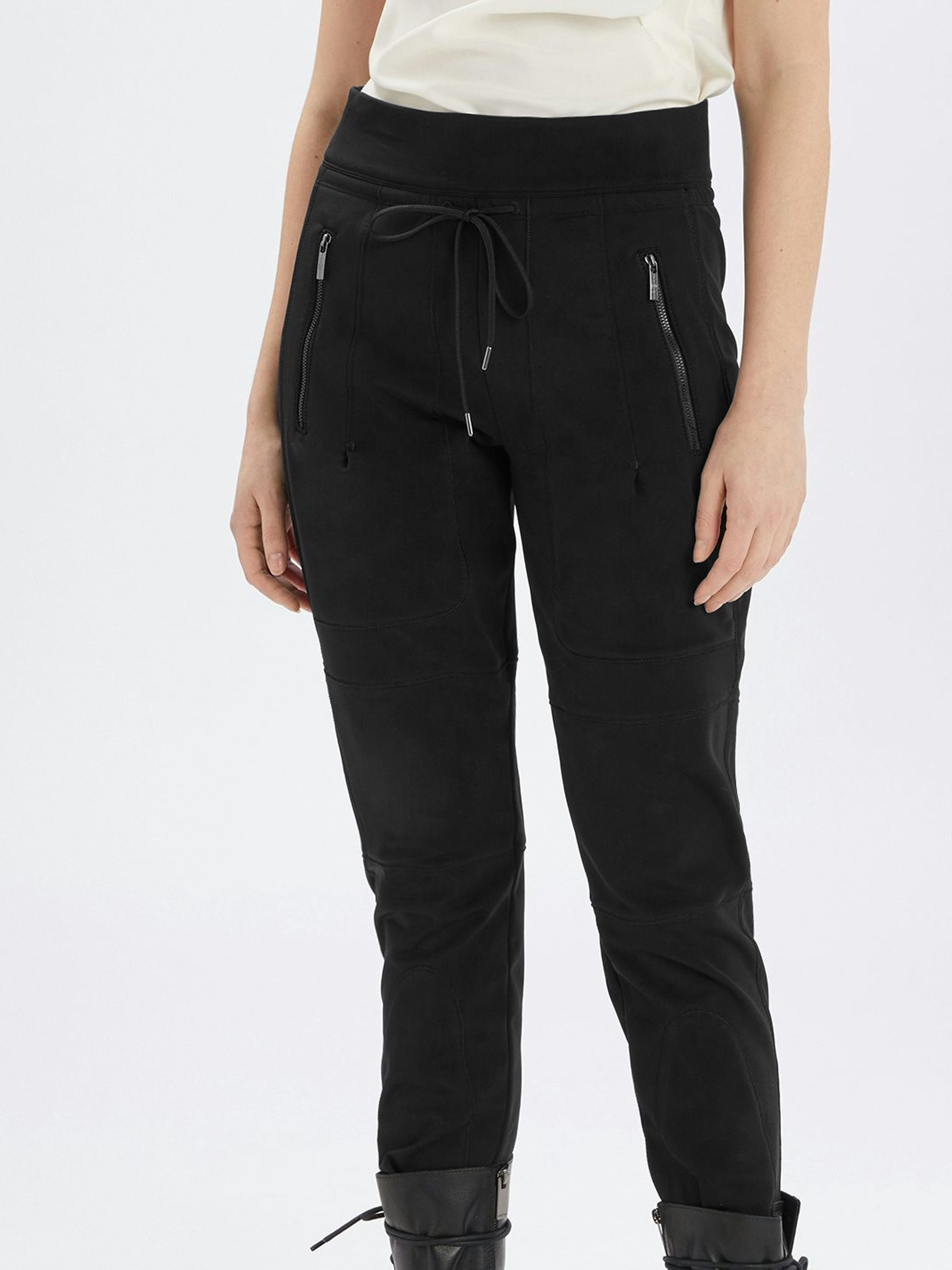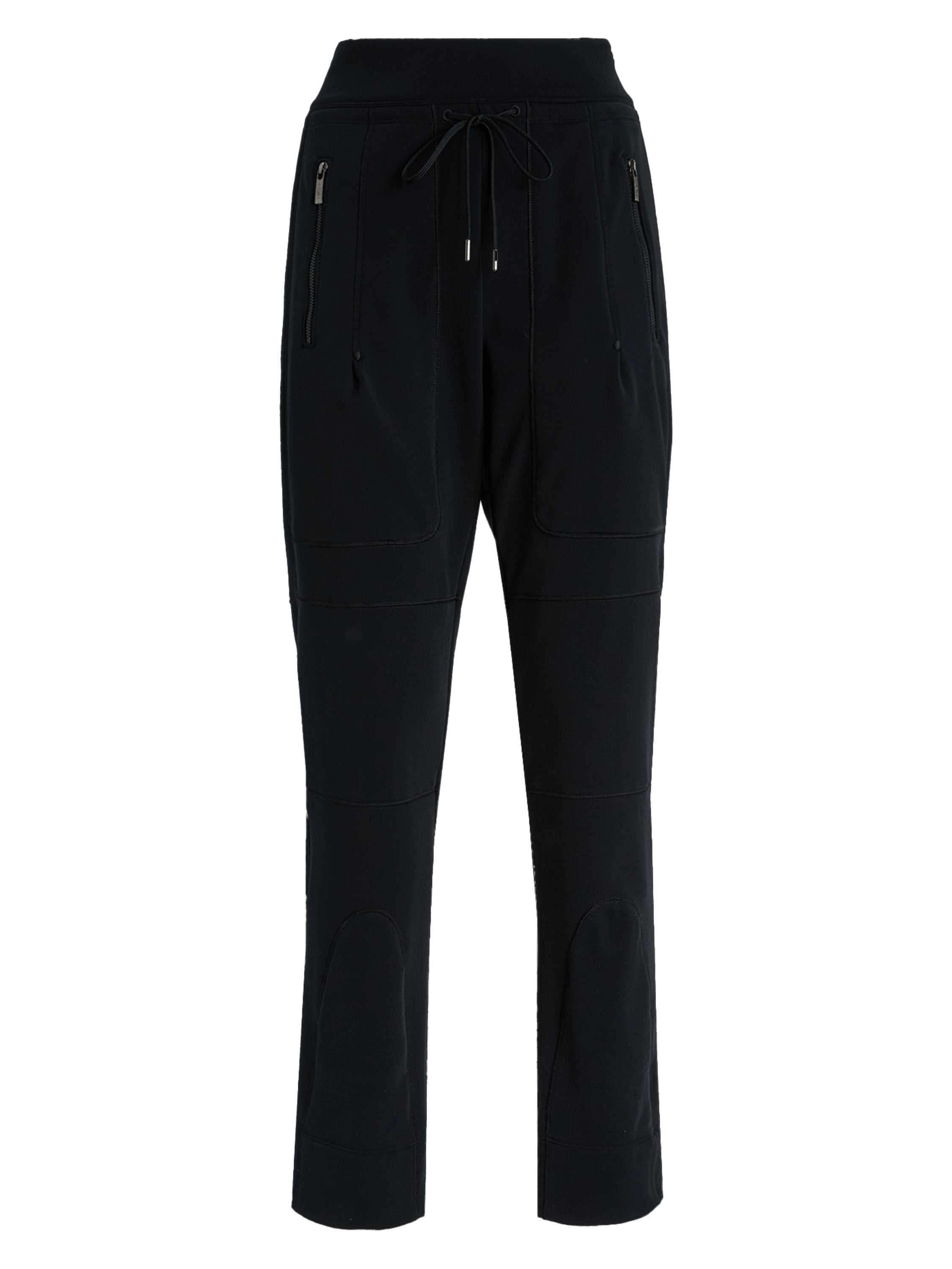 Un pantalon de High en noir. La taille est dotée d’une ceinture élastique et d’un cordon inséré dans un tunnel permettant d’ajuster le pantalon. Le modèle présente plusieurs coutures décoratives au niveau des poches et sur le bas des jambes. Les poches sont munies de fermetures éclair. Ce pantalon peut être lavé à 30 degrés.